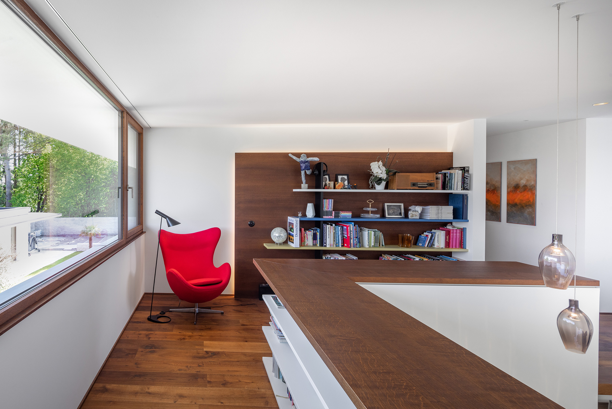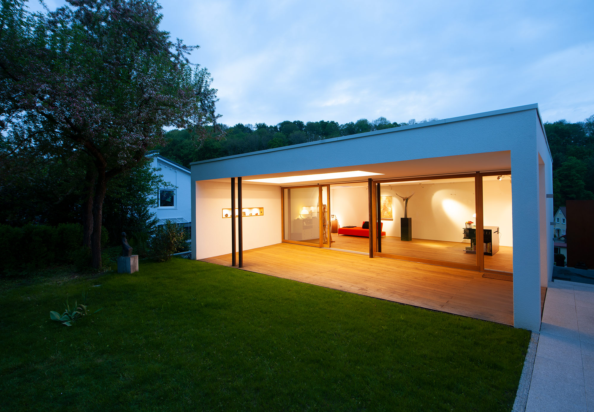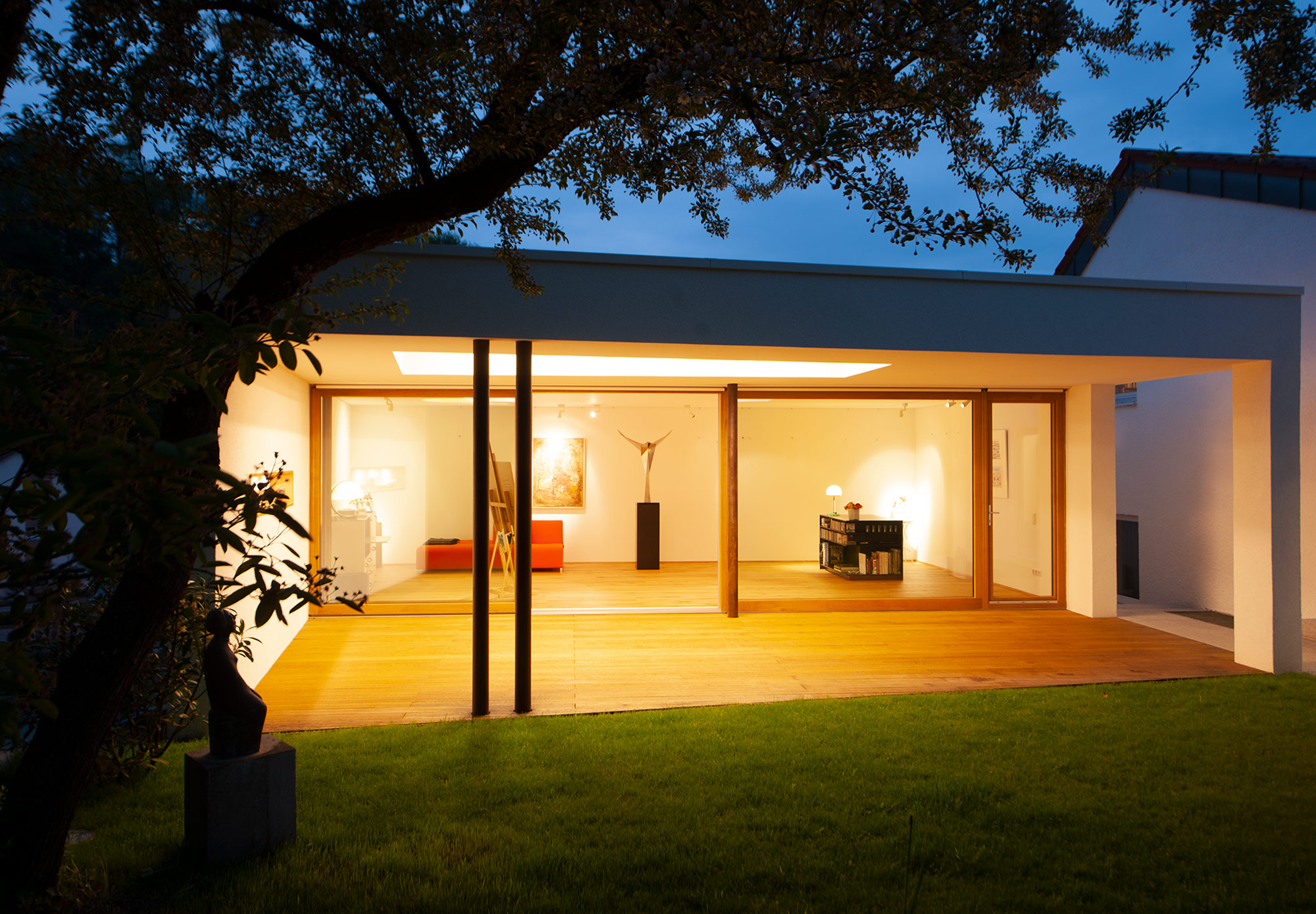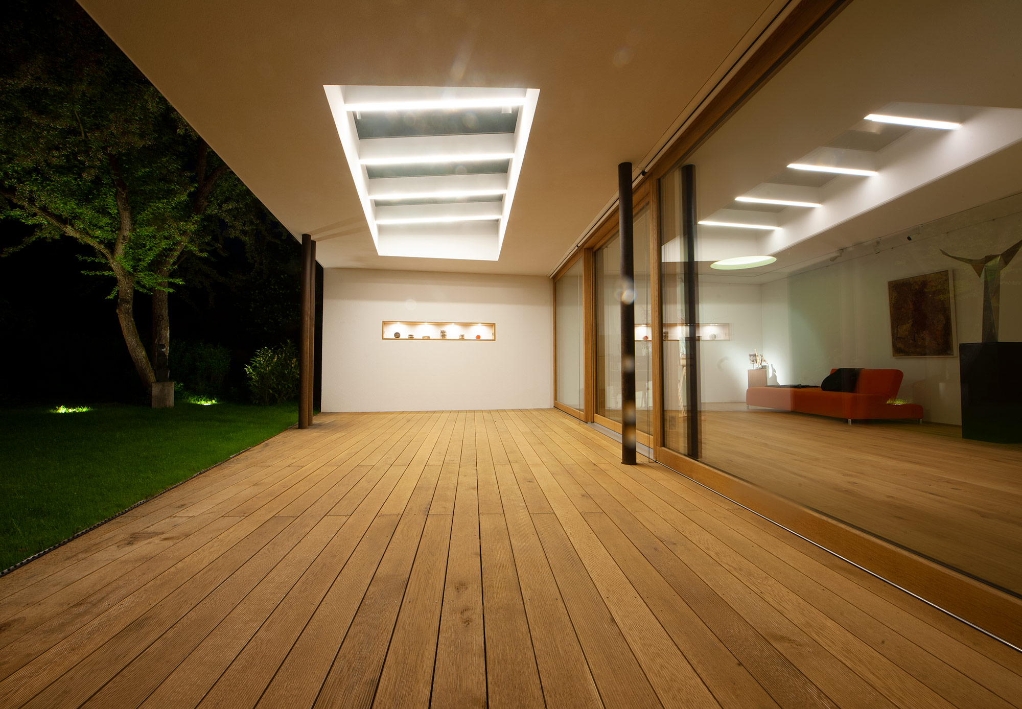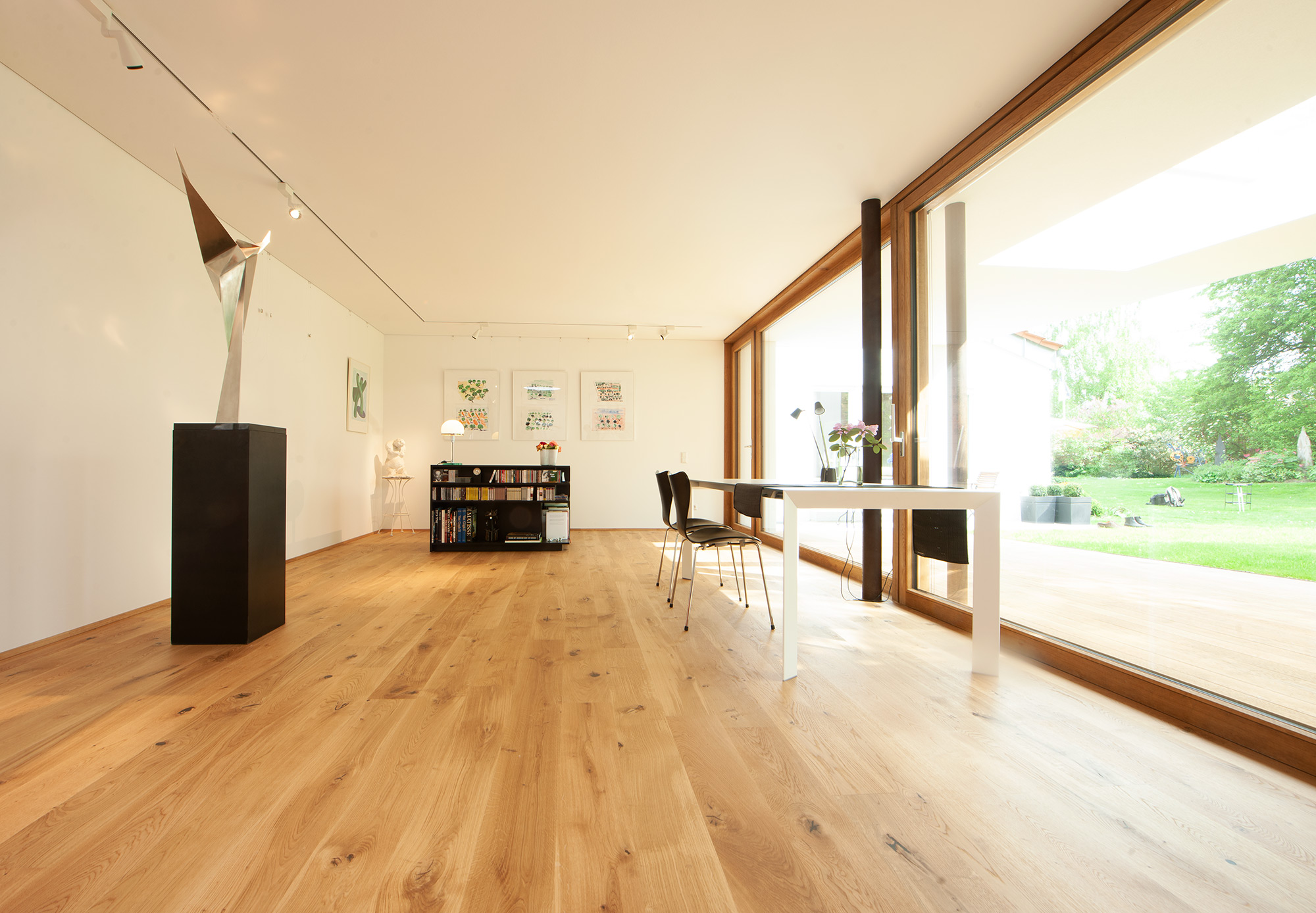 Als Mittler zwischen Garten und Innenraum ist eine überdachte Terrasse vorgelagert. Ihr Glasoberlicht mit raffinierter Beleuchtung schafft zu jeder Zeit angenehme Belichtung. Im Innenraum wechselt eine ausdrucksstarke Eiche an Boden und Fenstern mit feinen weißen Wänden. Eine umlaufend integrierte Bilderhängleiste ermöglicht das einfache Wechseln der Werke. Darauf kann die Beleuchtung mit verstellbaren Strahlern in Schienenführung jederzeit reagieren.