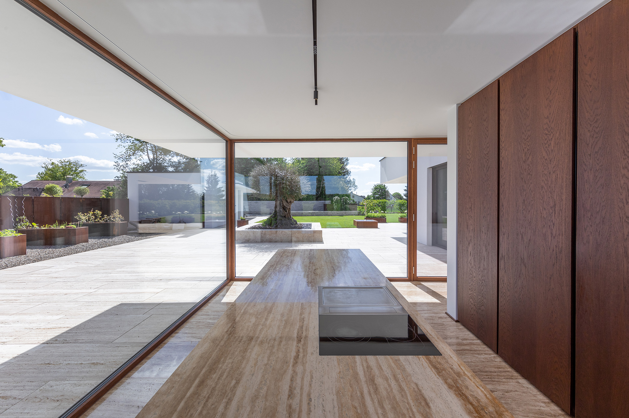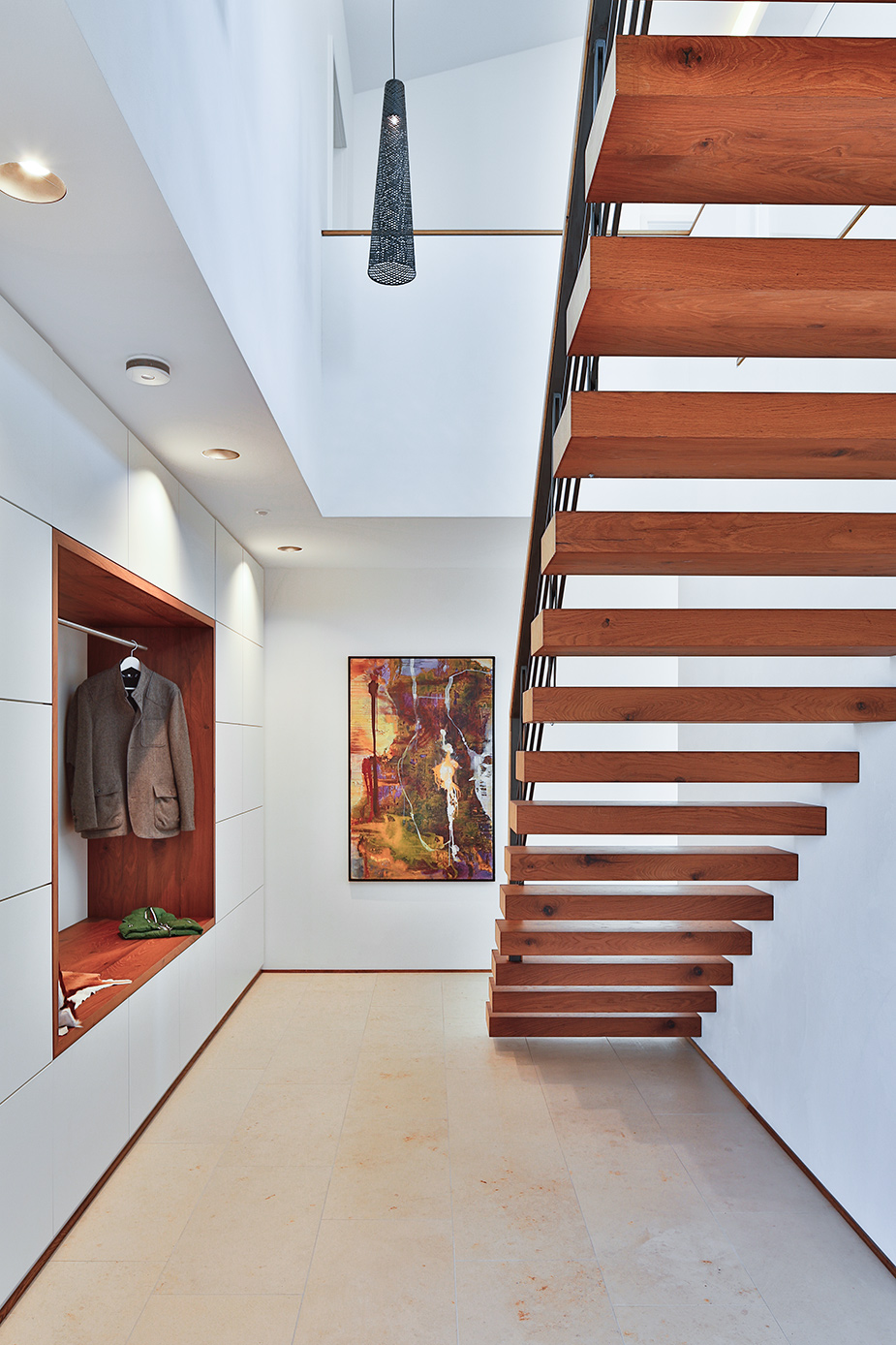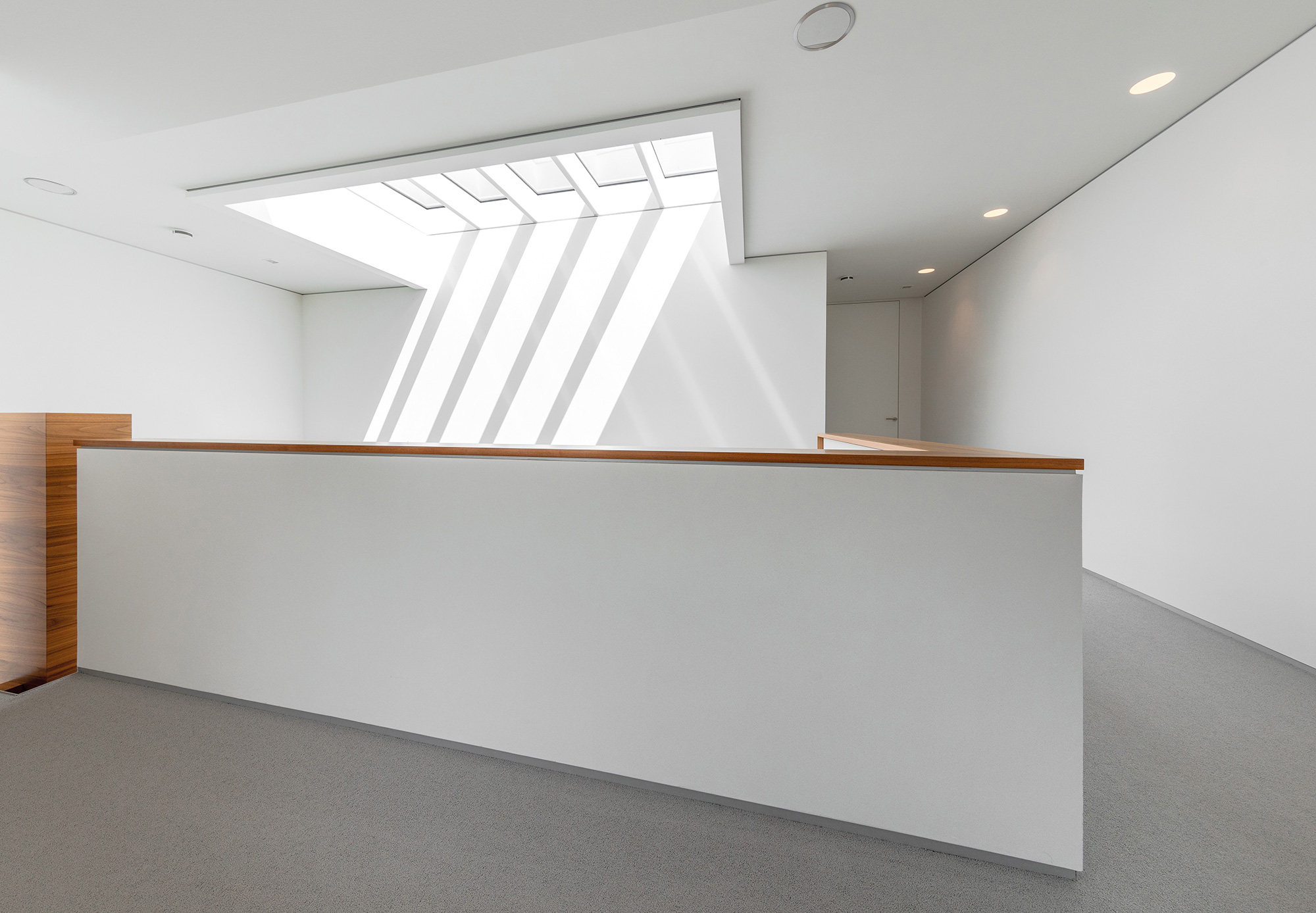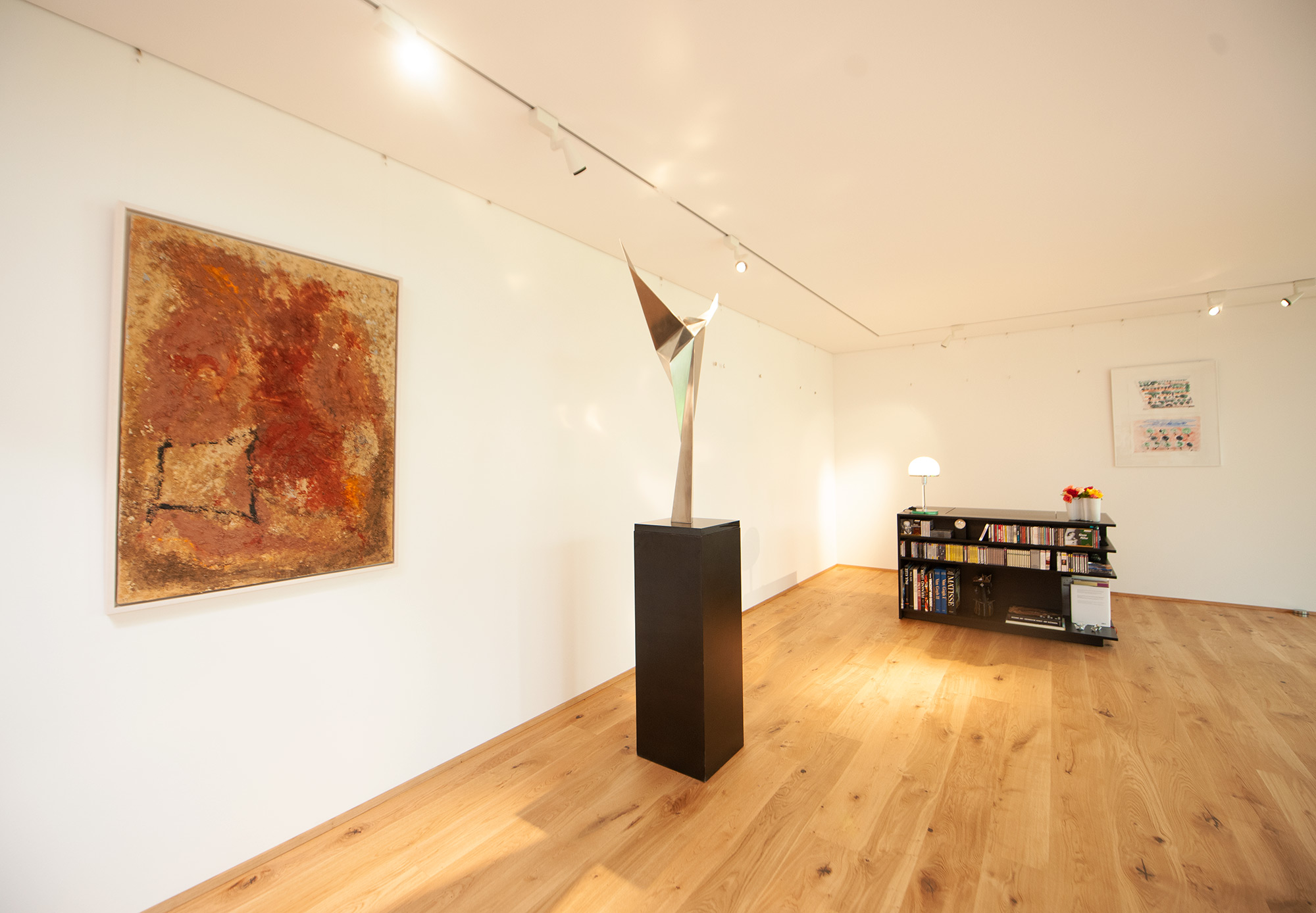 Als Mittler zwischen Garten und Innenraum ist eine überdachte Terrasse vorgelagert. Ihr Glasoberlicht mit raffinierter Beleuchtung schafft zu jeder Zeit angenehme Belichtung. Im Innenraum wechselt eine ausdrucksstarke Eiche an Boden und Fenstern mit feinen weißen Wänden. Eine umlaufend integrierte Bilderhängleiste ermöglicht das einfache Wechseln der Werke. Darauf kann die Beleuchtung mit verstellbaren Strahlern in Schienenführung jederzeit reagieren.