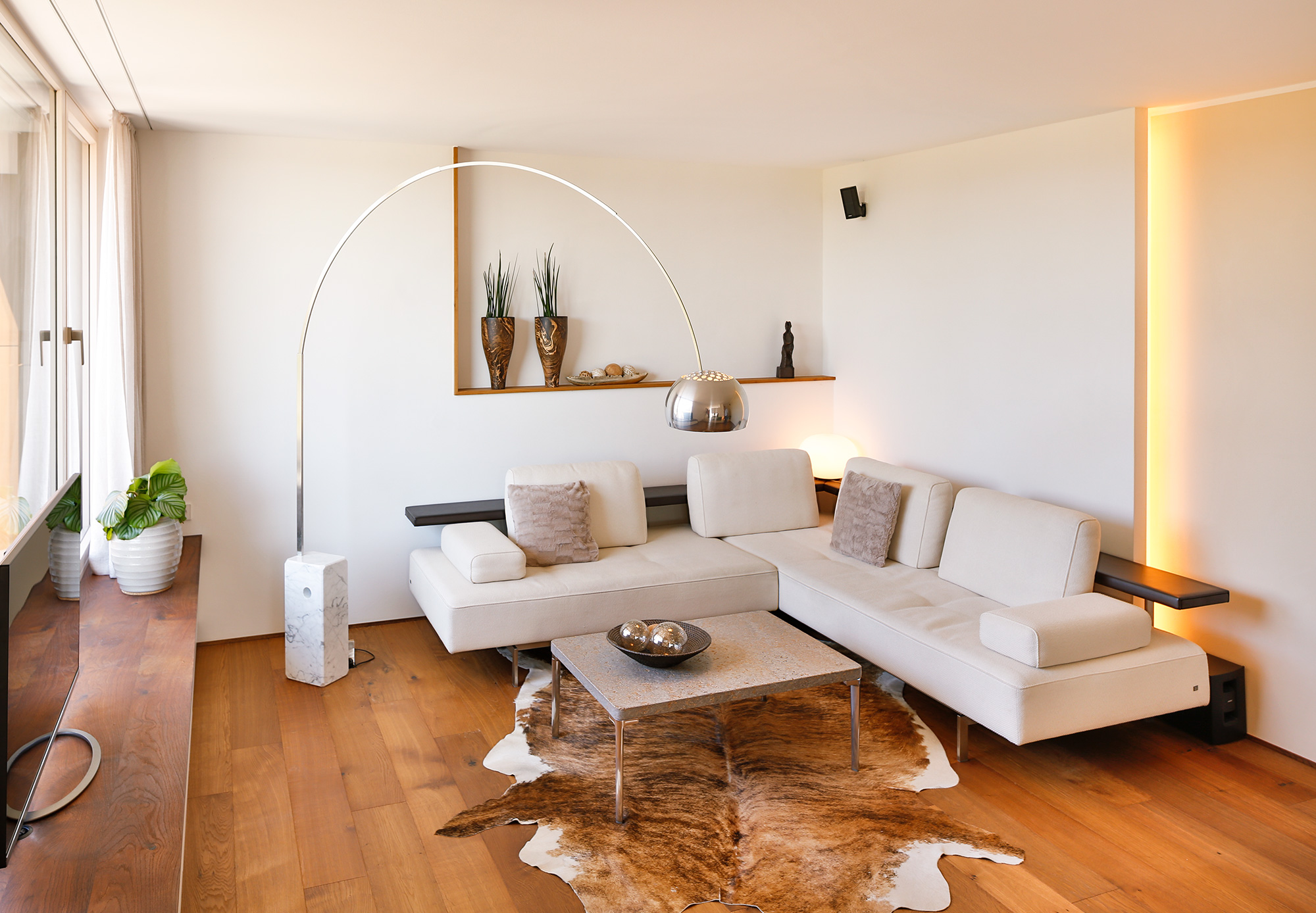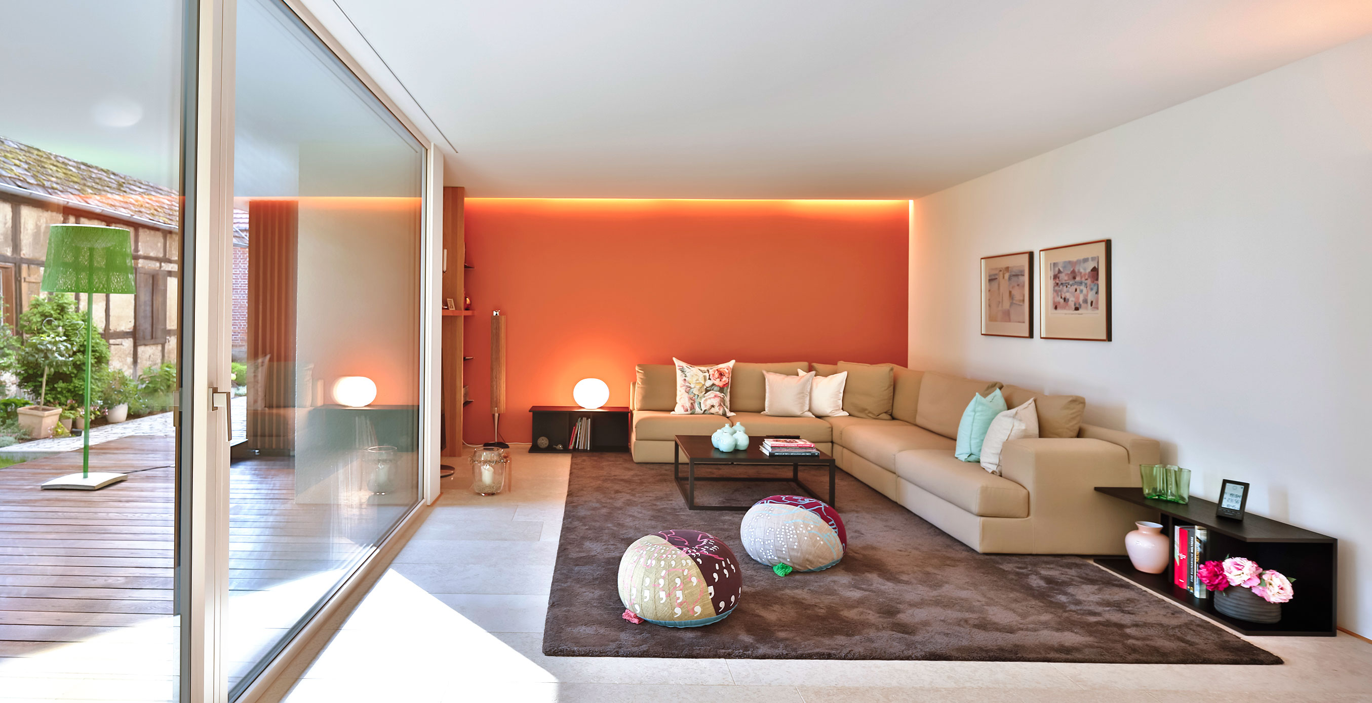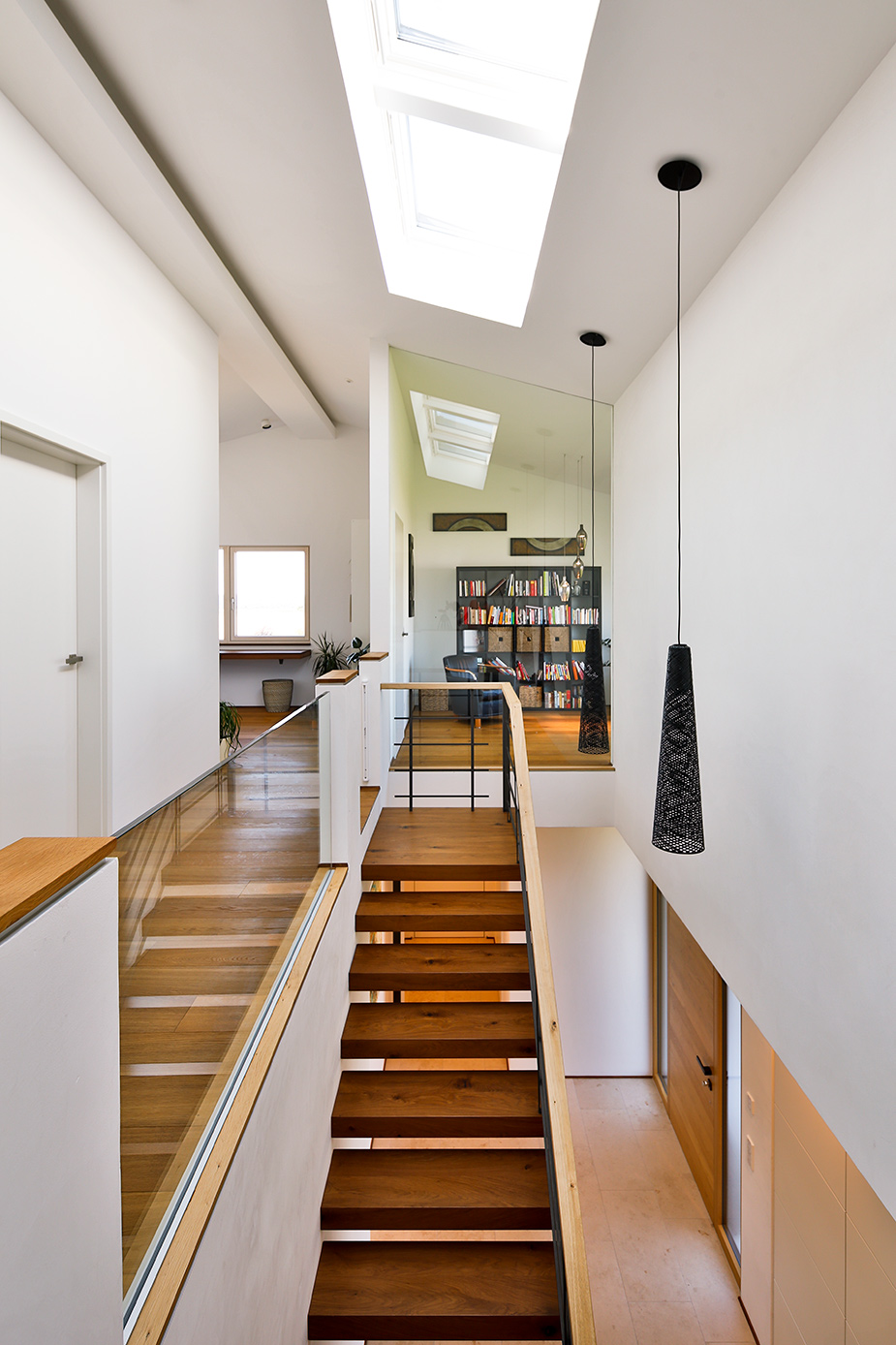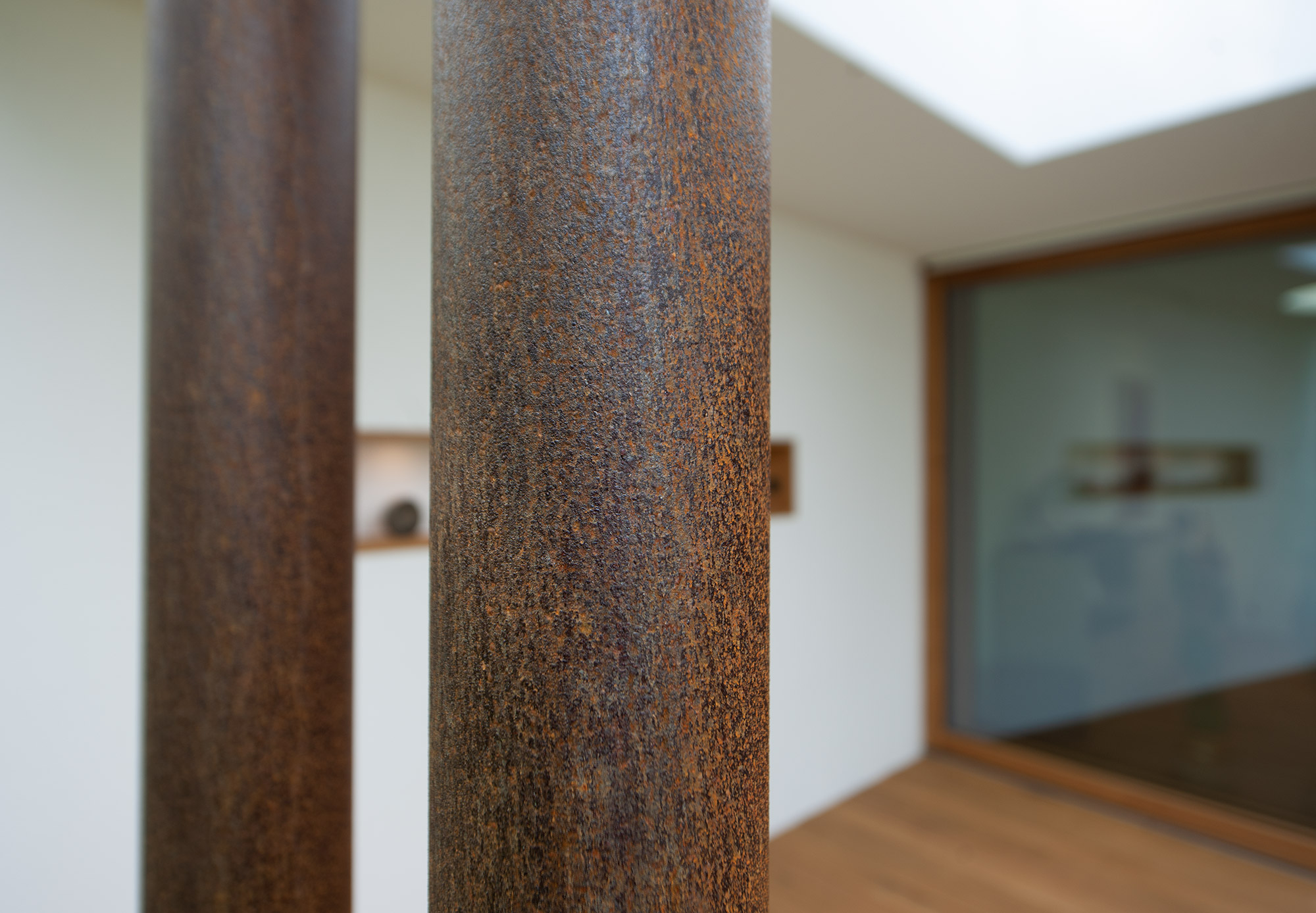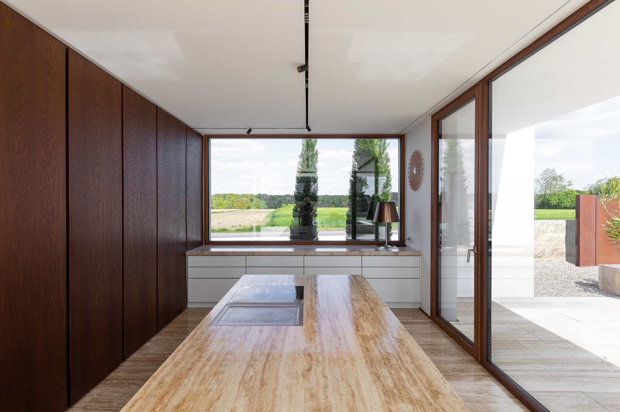 Als Mittler zwischen Garten und Innenraum ist eine überdachte Terrasse vorgelagert. Ihr Glasoberlicht mit raffinierter Beleuchtung schafft zu jeder Zeit angenehme Belichtung. Im Innenraum wechselt eine ausdrucksstarke Eiche an Boden und Fenstern mit feinen weißen Wänden. Eine umlaufend integrierte Bilderhängleiste ermöglicht das einfache Wechseln der Werke. Darauf kann die Beleuchtung mit verstellbaren Strahlern in Schienenführung jederzeit reagieren.