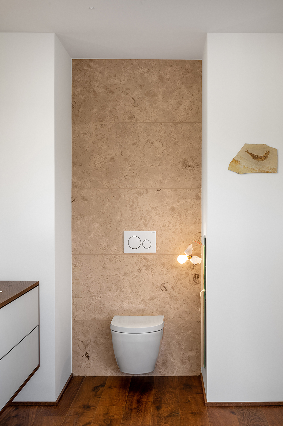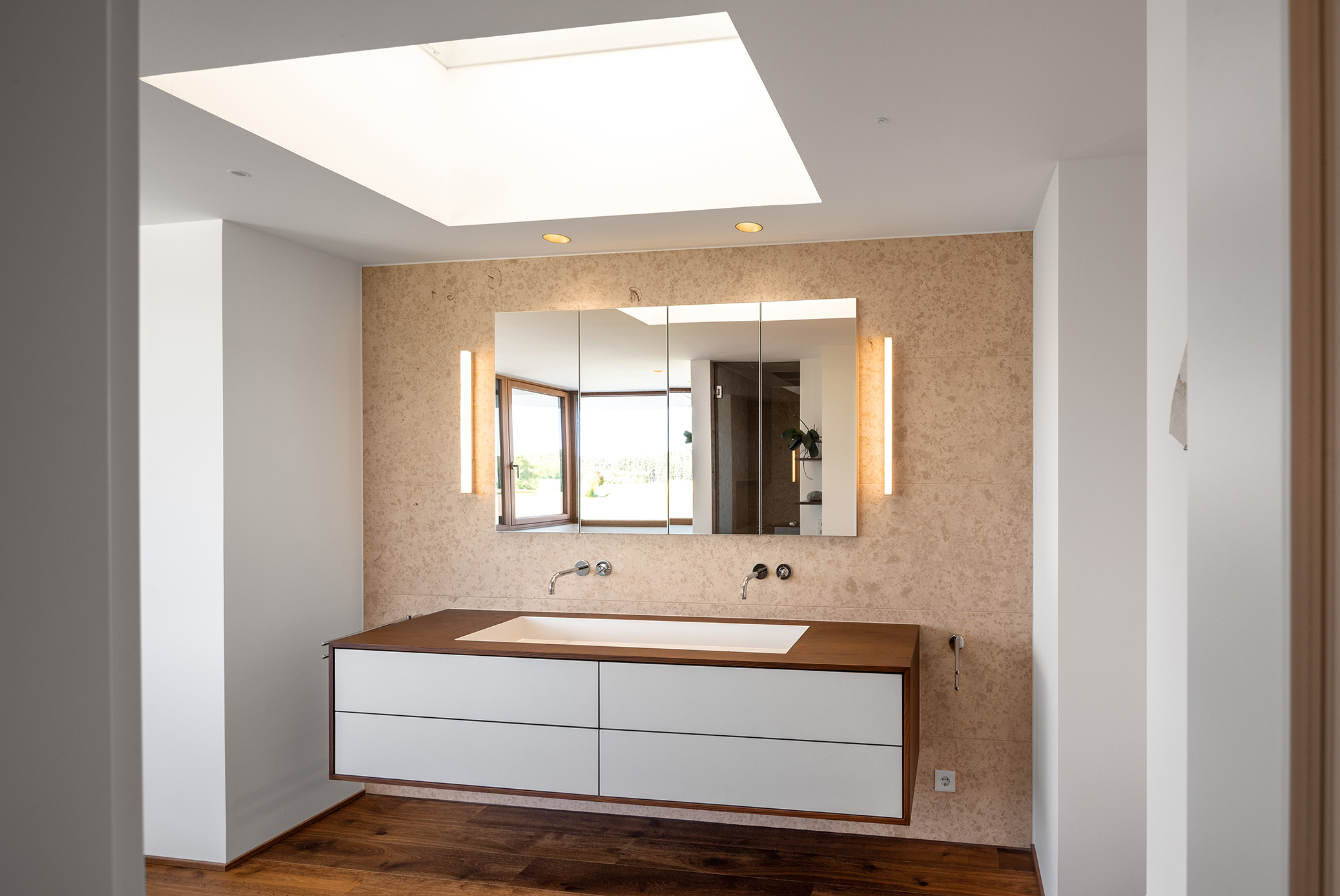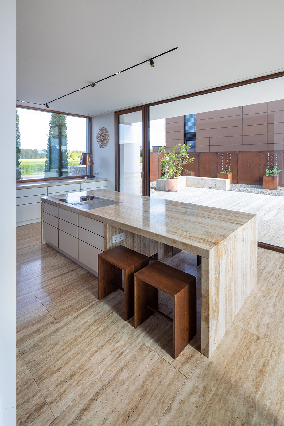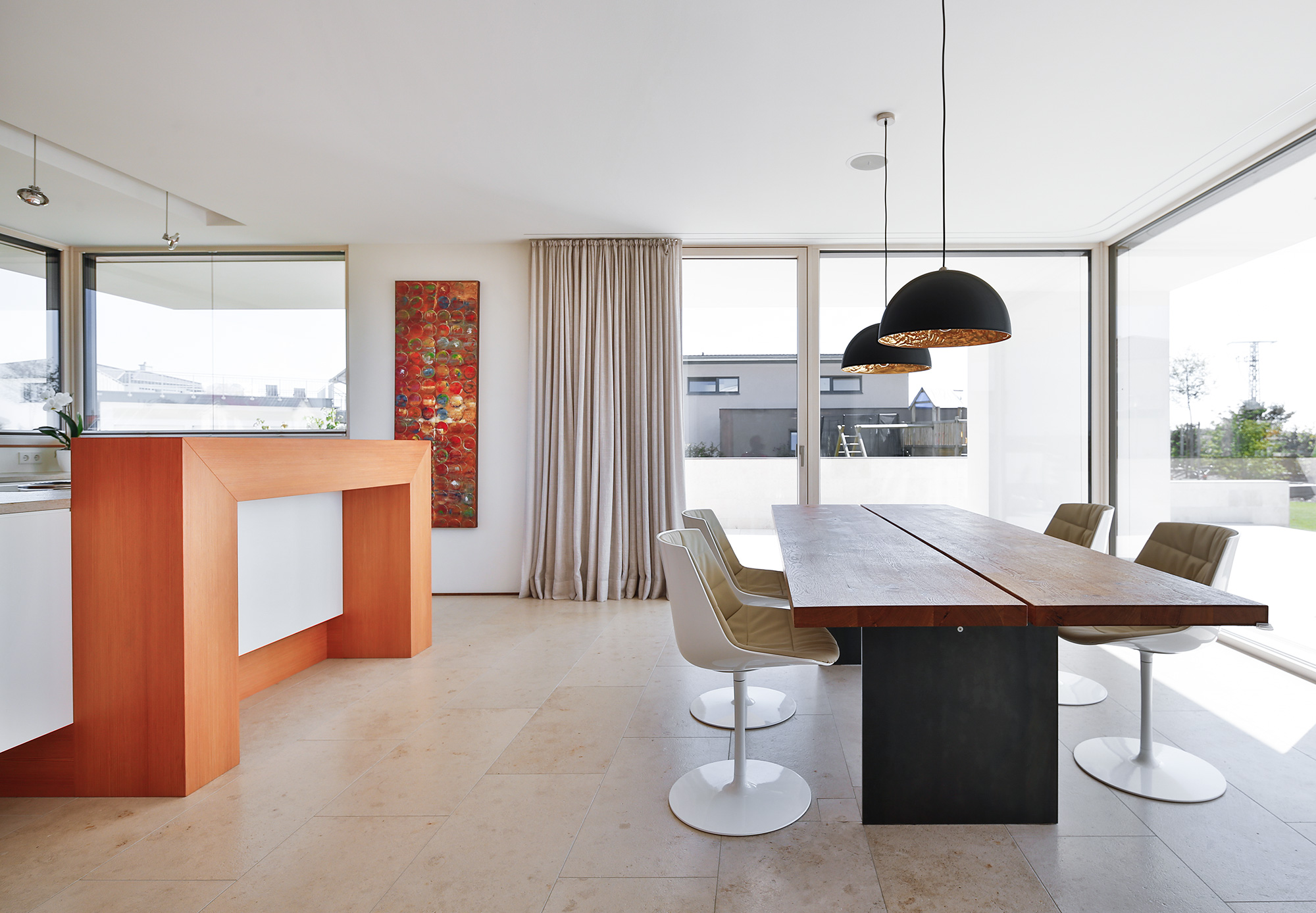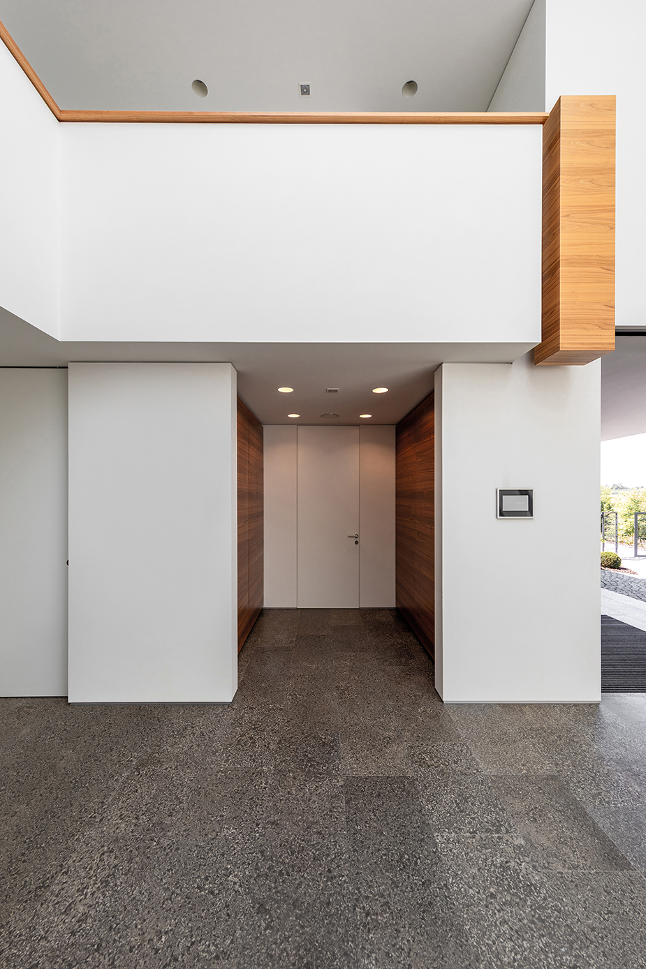 Als Mittler zwischen Garten und Innenraum ist eine überdachte Terrasse vorgelagert. Ihr Glasoberlicht mit raffinierter Beleuchtung schafft zu jeder Zeit angenehme Belichtung. Im Innenraum wechselt eine ausdrucksstarke Eiche an Boden und Fenstern mit feinen weißen Wänden. Eine umlaufend integrierte Bilderhängleiste ermöglicht das einfache Wechseln der Werke. Darauf kann die Beleuchtung mit verstellbaren Strahlern in Schienenführung jederzeit reagieren.