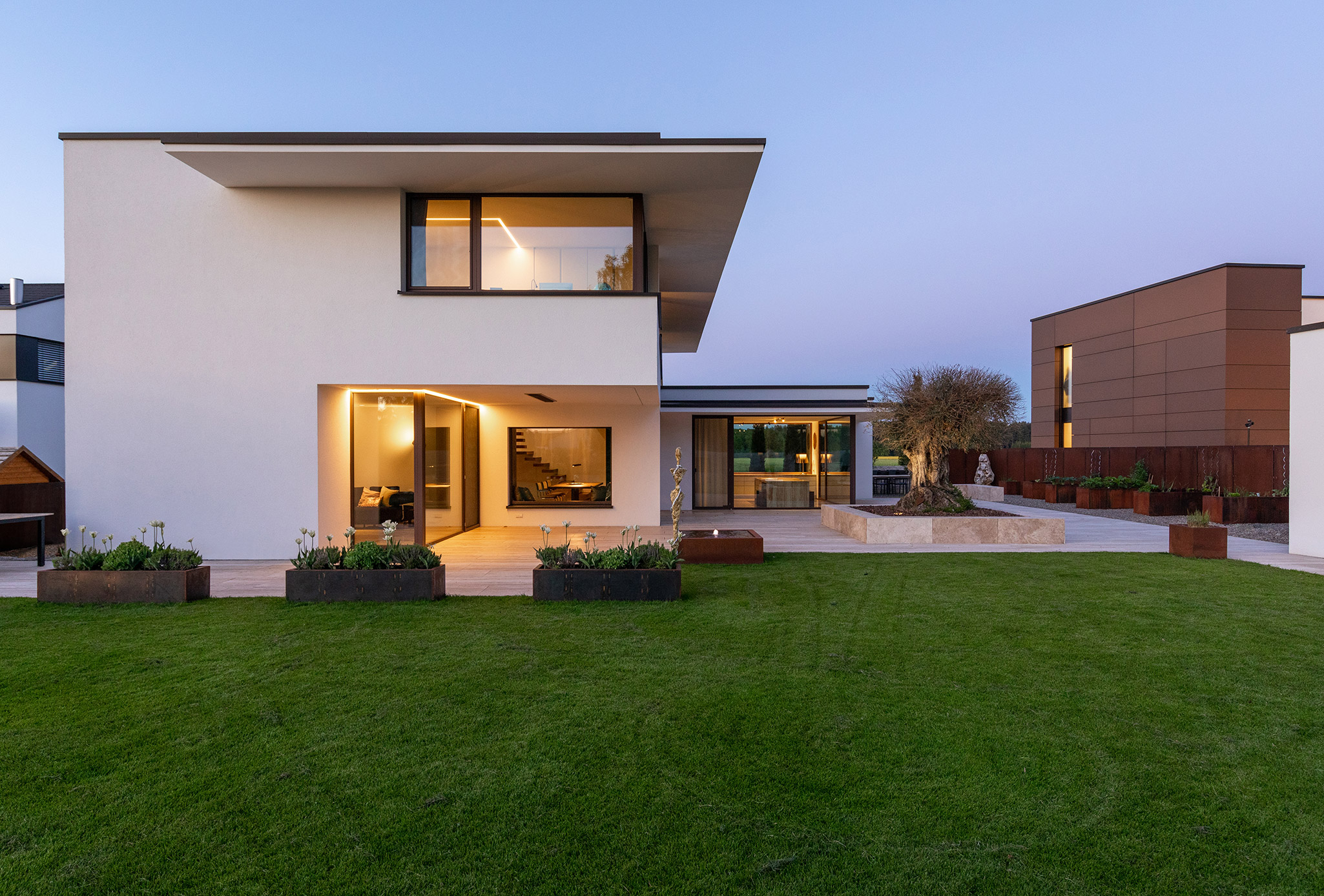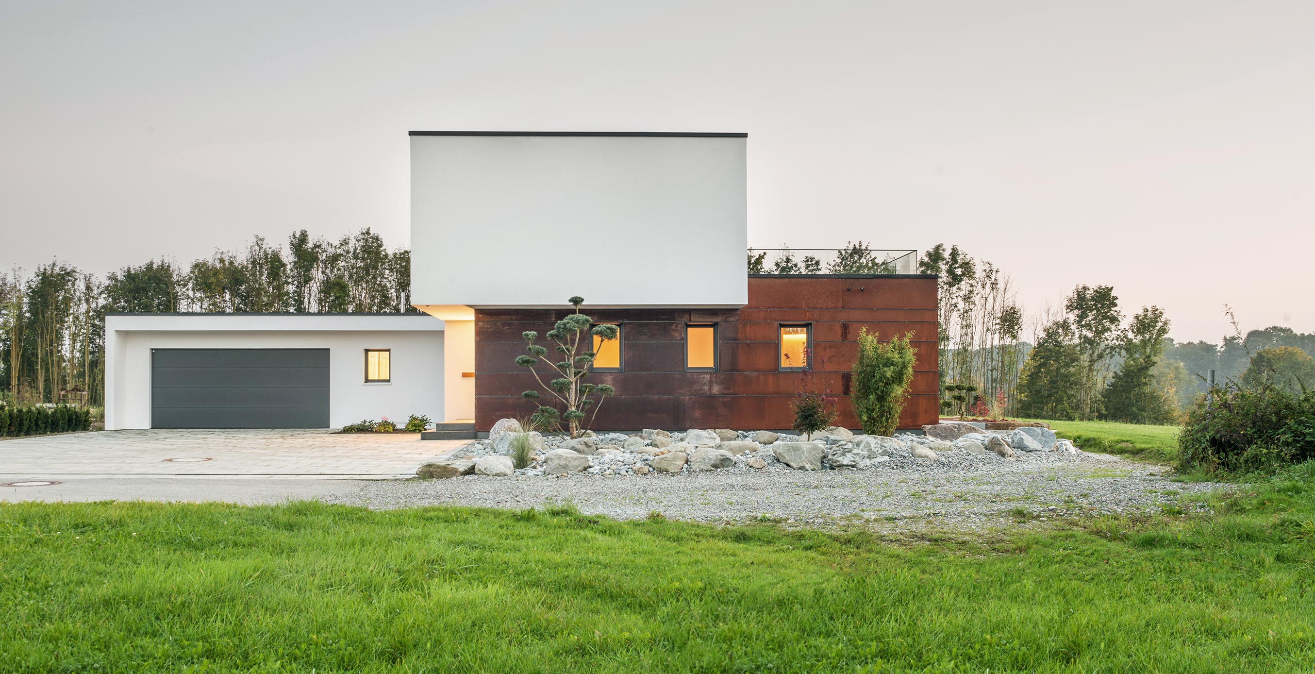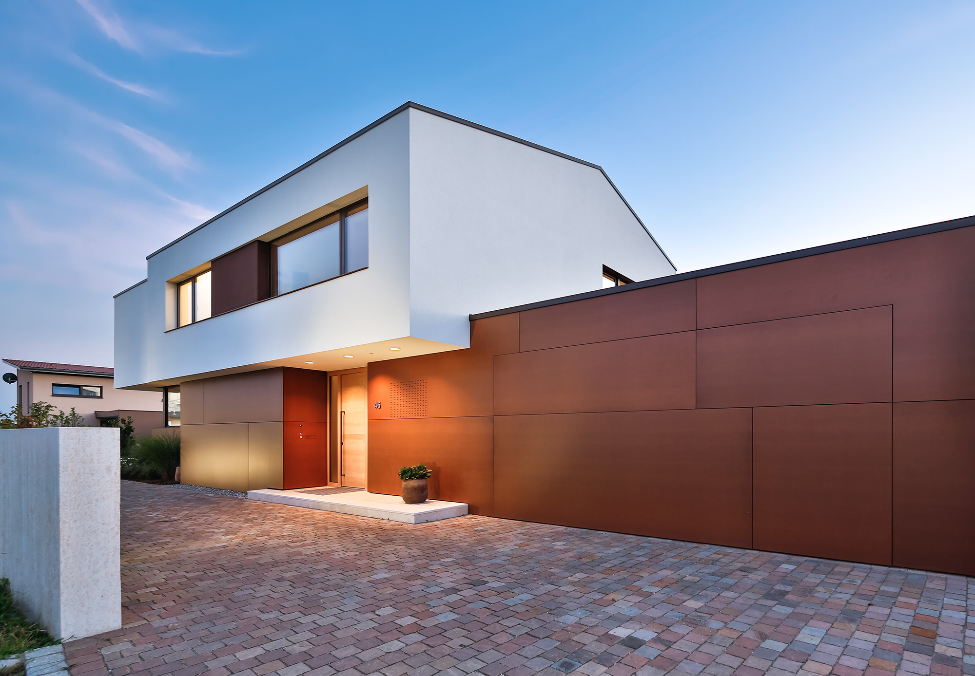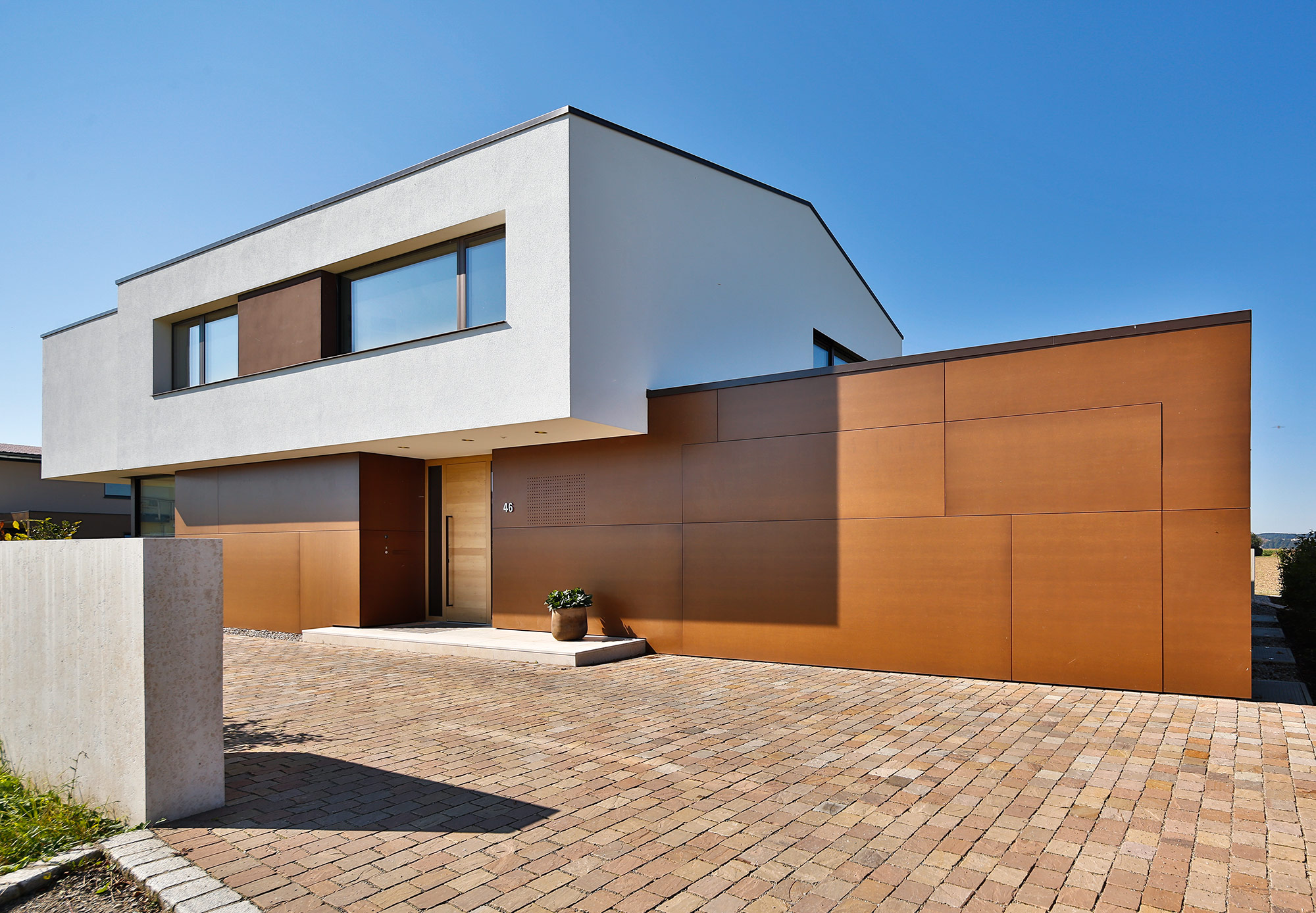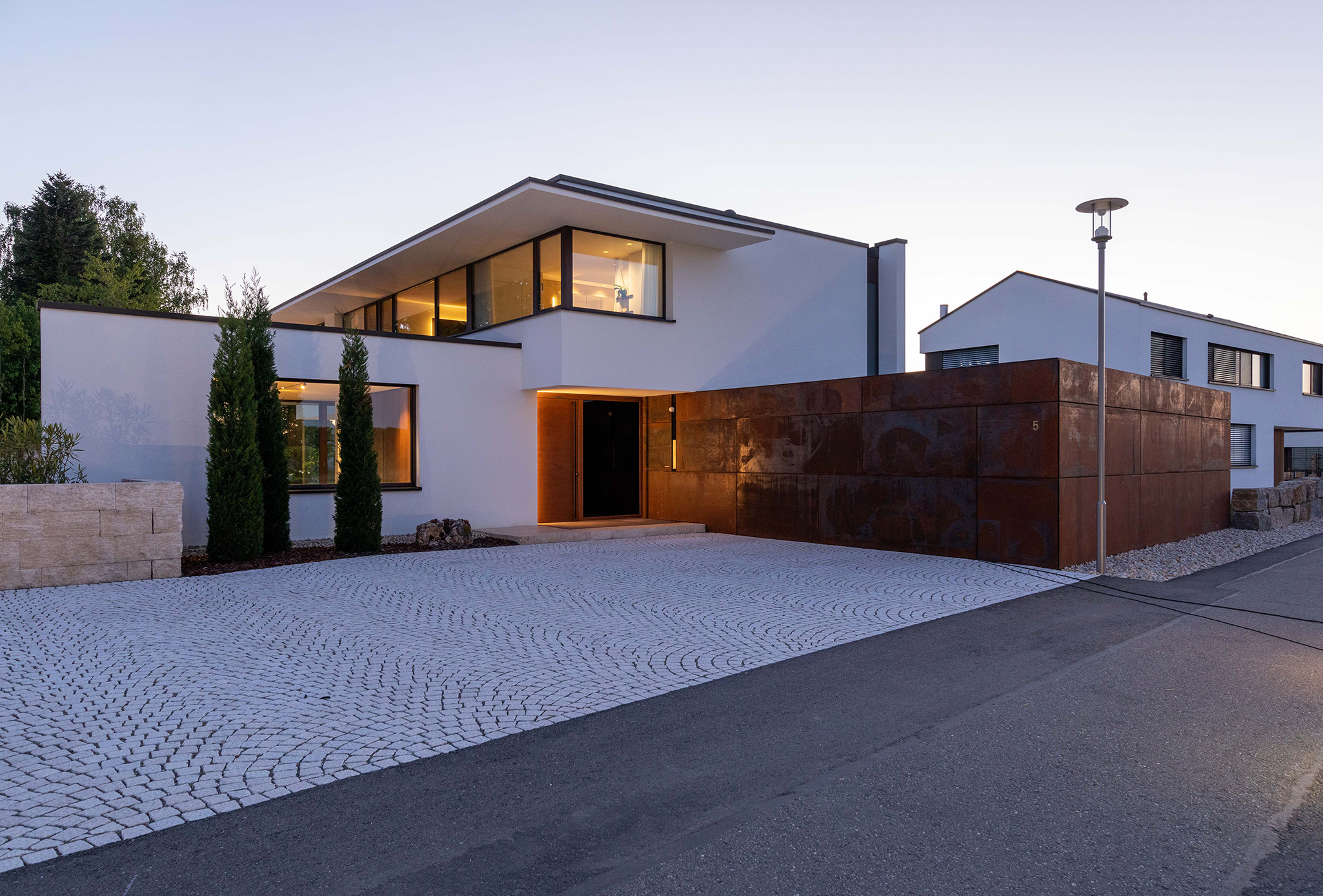 Zur Straße nach Norden schottet sich das Gebäude geschickt durch den eingeschossigen Winkelbau ab, der Baukörper bleibt reduziert und klar, erhält seinen Reiz durch Überkragungen und den Materialwechsel zu der Cortenstahlfassade.