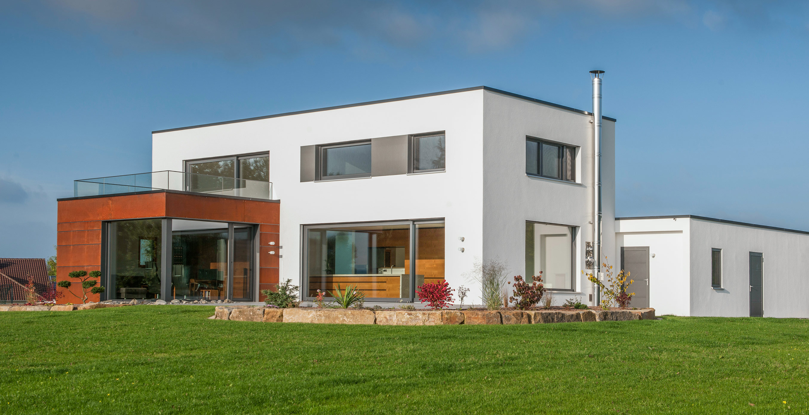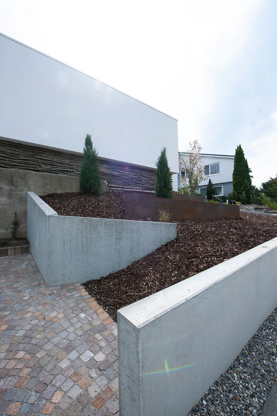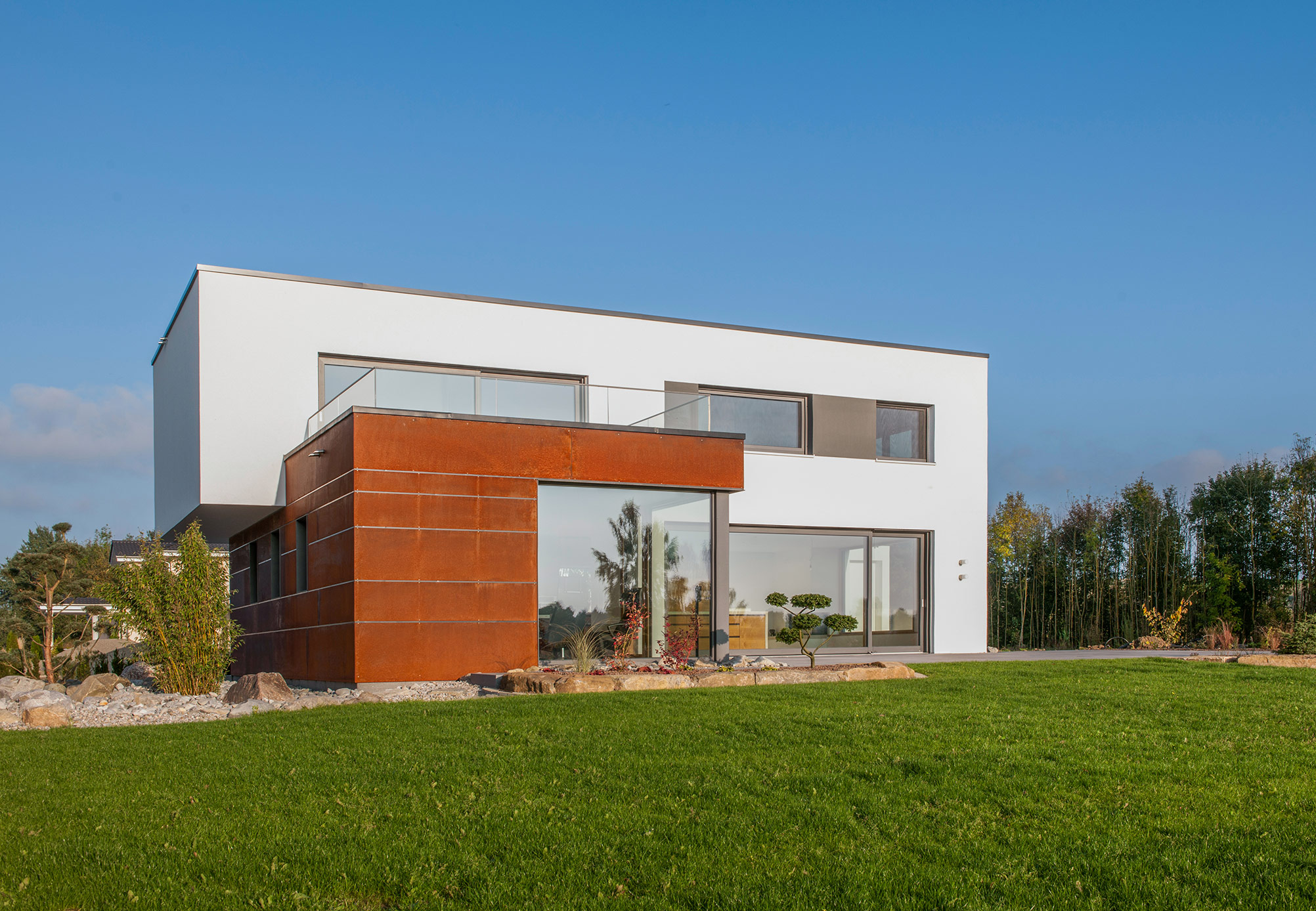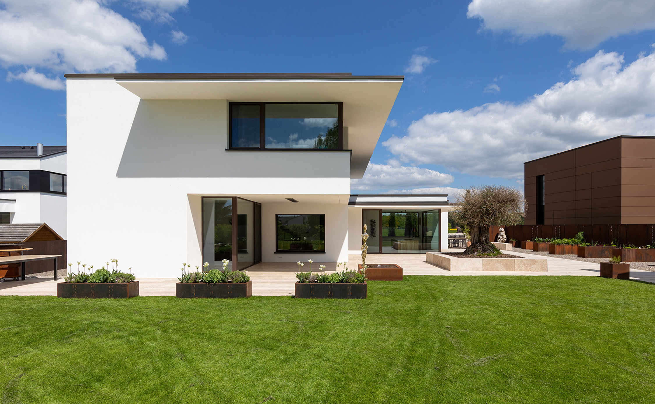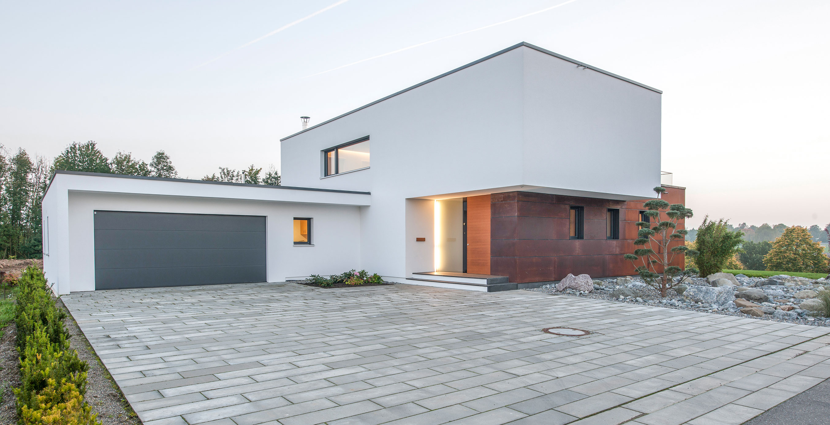 Zur Straße nach Norden schottet sich das Gebäude geschickt durch den eingeschossigen Winkelbau ab, der Baukörper bleibt reduziert und klar, erhält seinen Reiz durch Überkragungen und den Materialwechsel zu der Cortenstahlfassade.