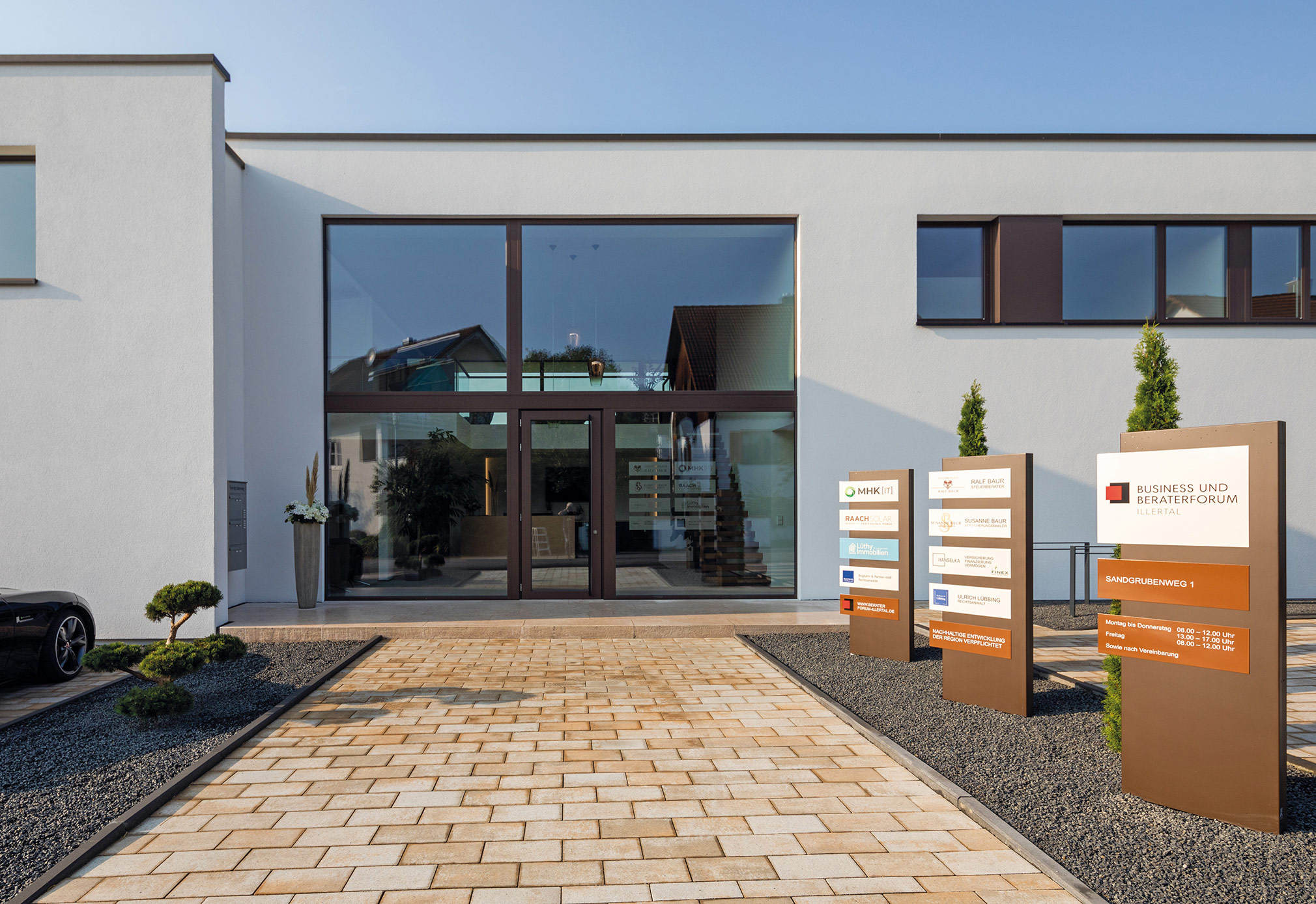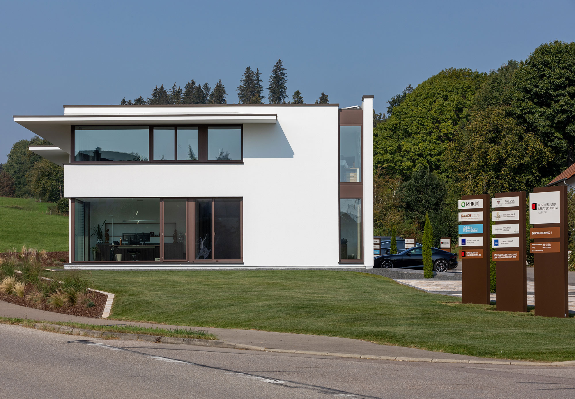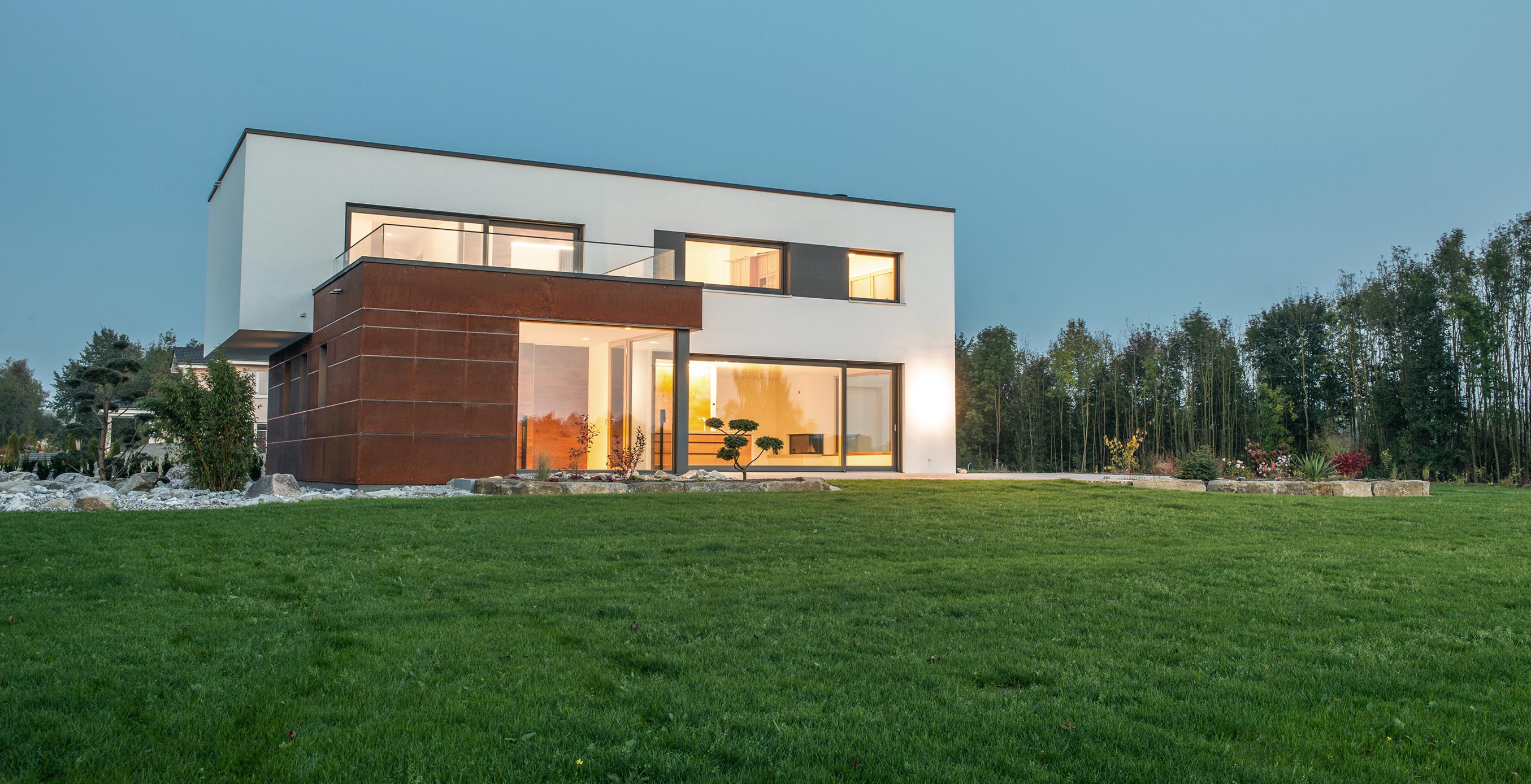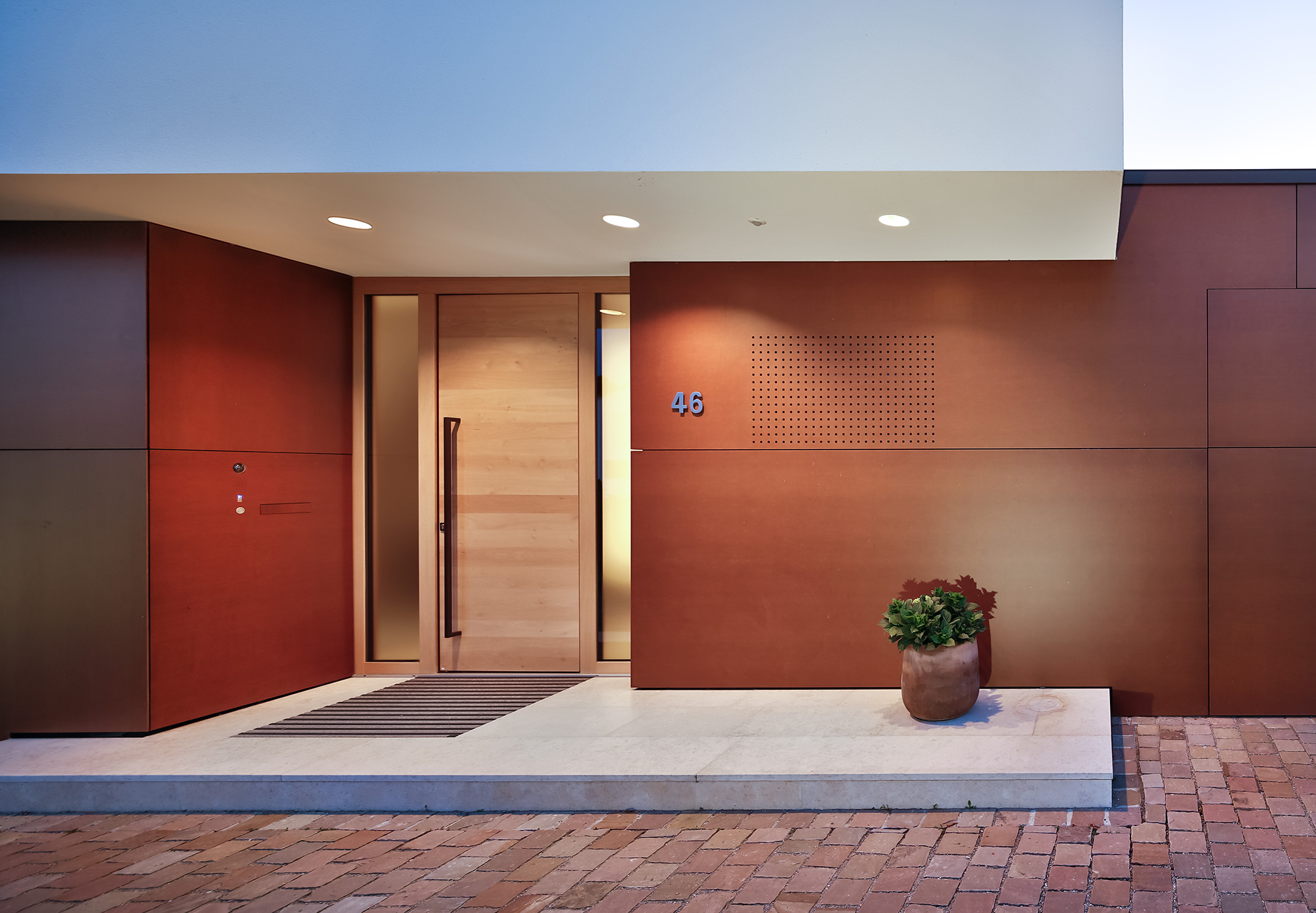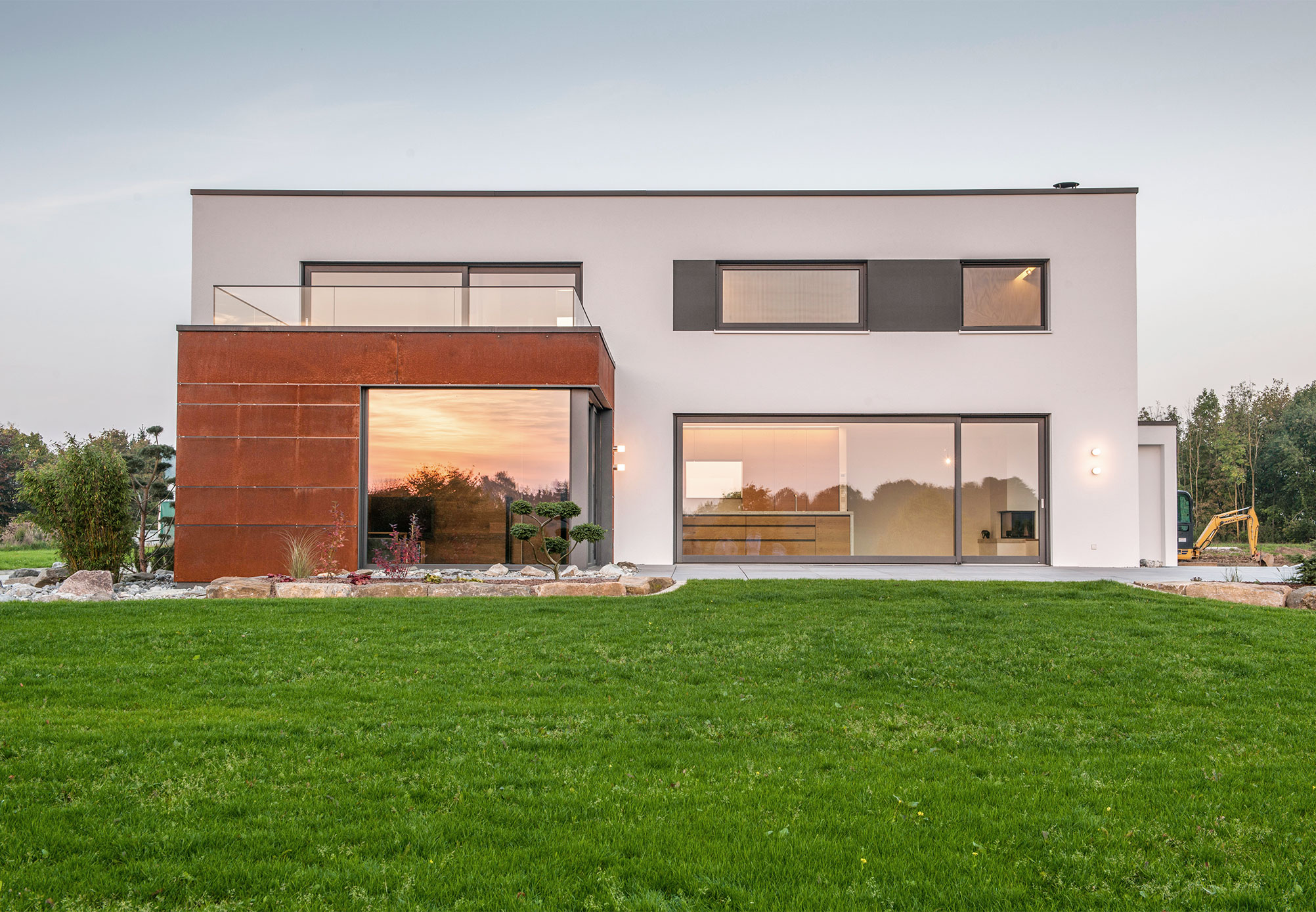 Zur Straße nach Norden schottet sich das Gebäude geschickt durch den eingeschossigen Winkelbau ab, der Baukörper bleibt reduziert und klar, erhält seinen Reiz durch Überkragungen und den Materialwechsel zu der Cortenstahlfassade.