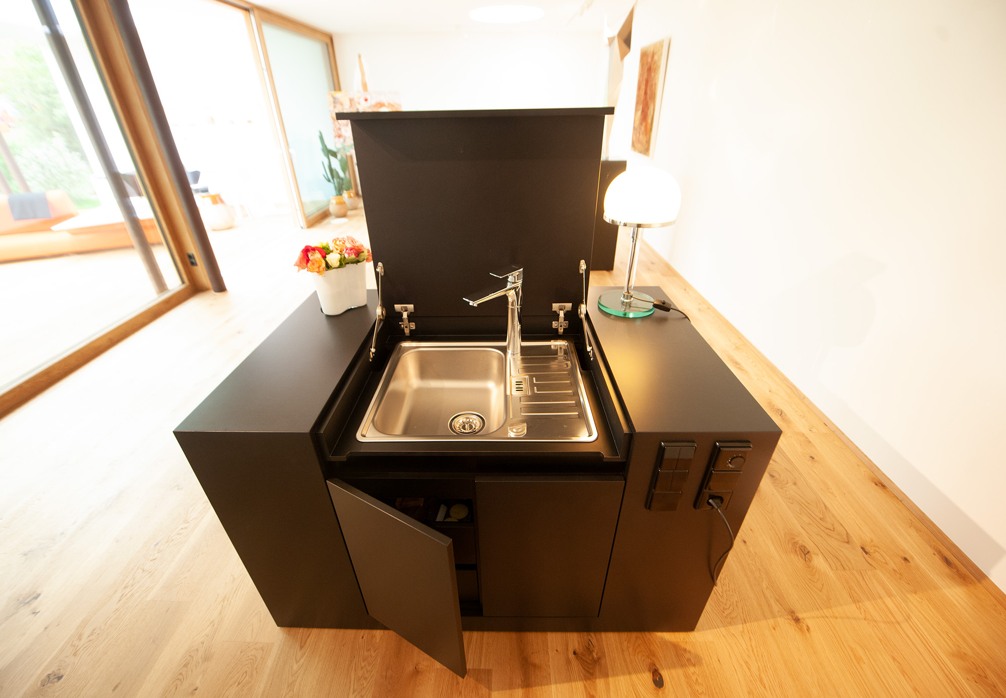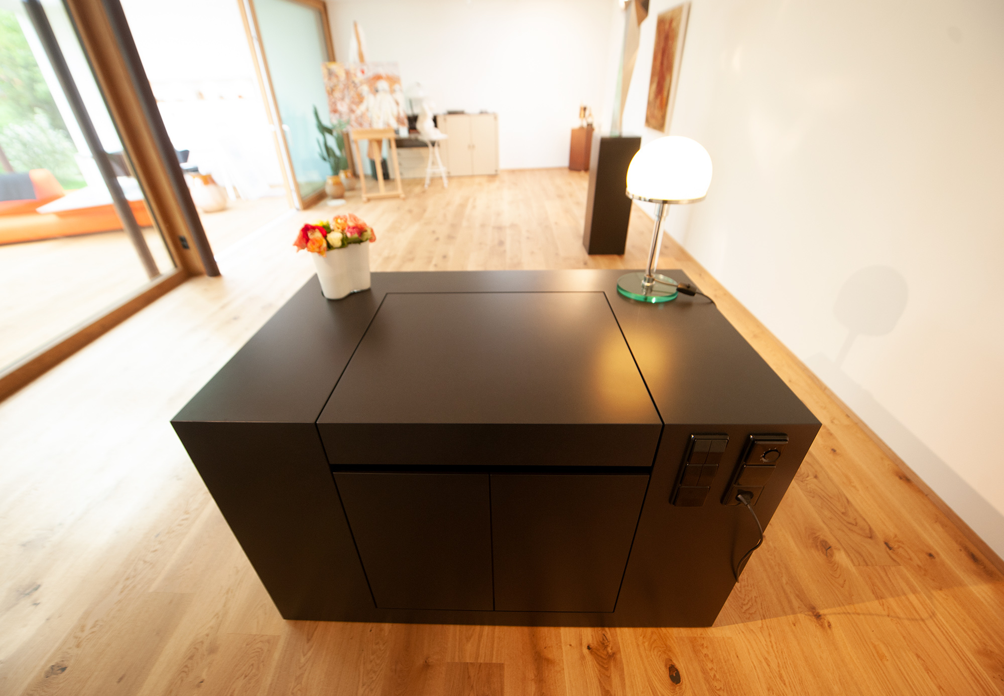 Ein raffiniertes Möbel steht als schwarzer Sockel im Atelier und nimmt Bücher und Persönliches auf. Gleichzeitig lässt es sich öffnen und gibt ein Spülbecken mit Unterschrank frei, in dem die Pinsel gewaschen werden können.