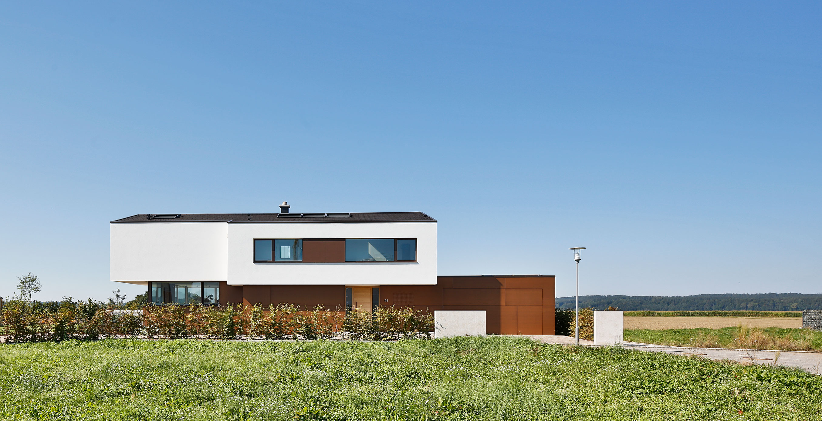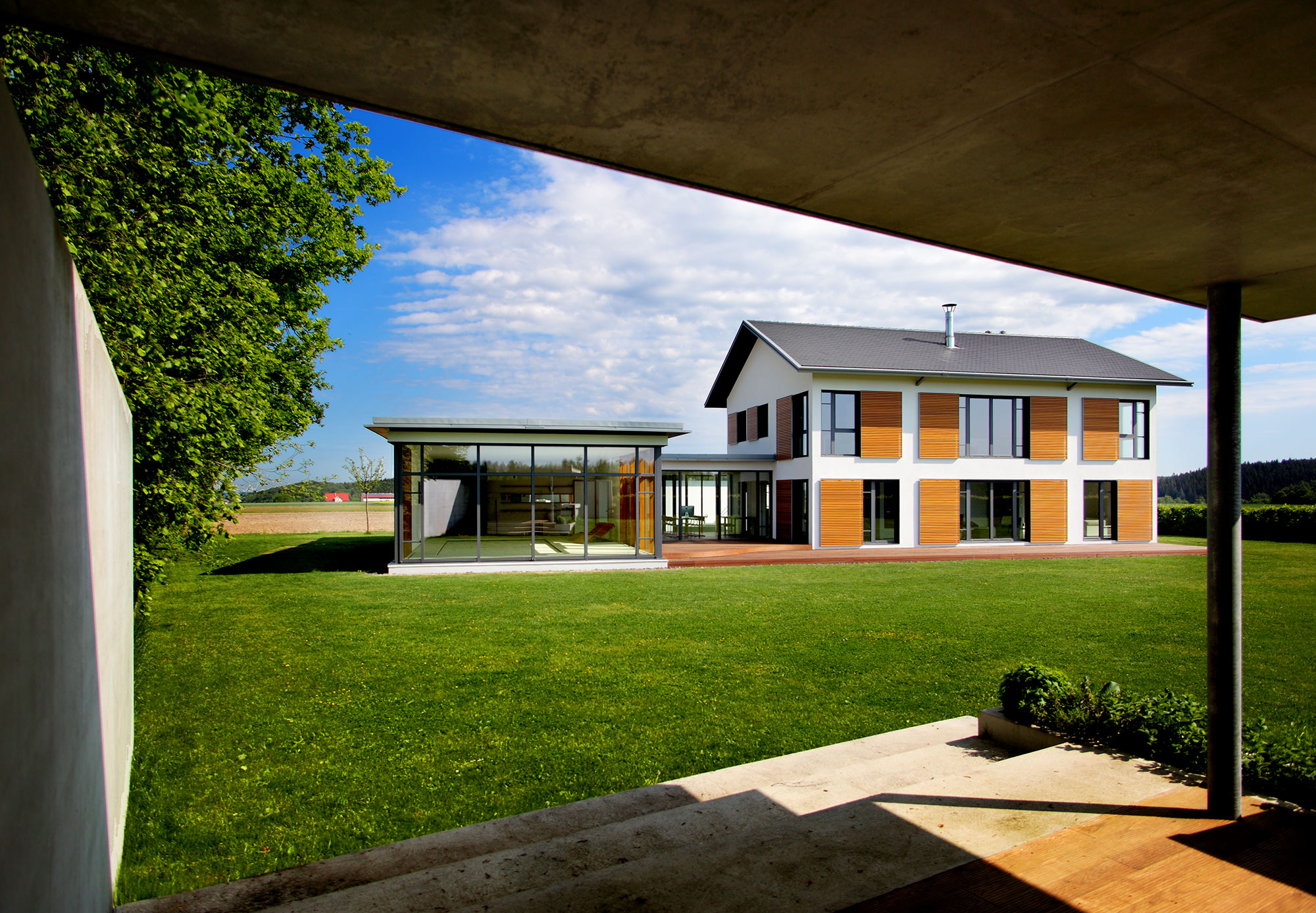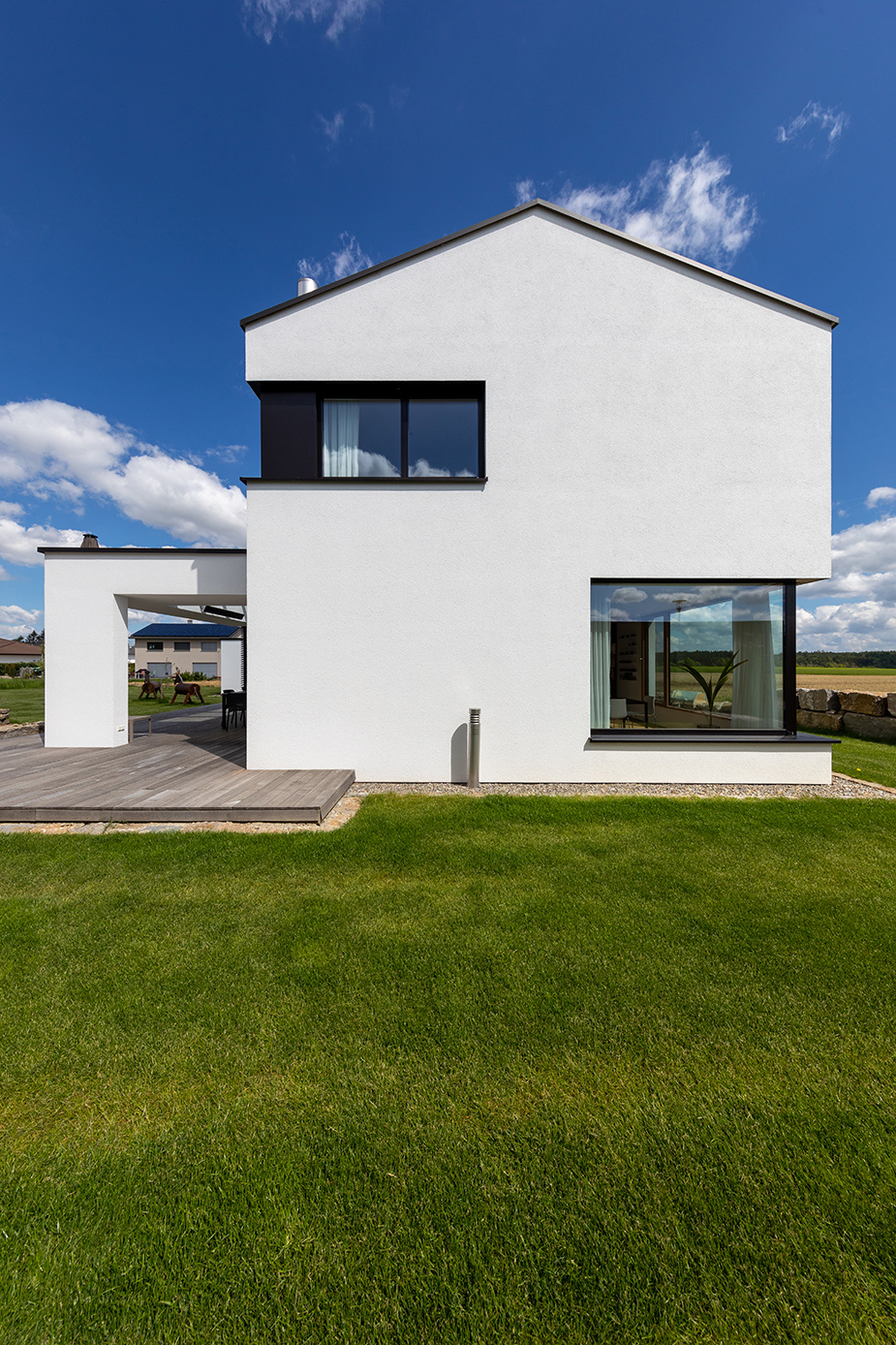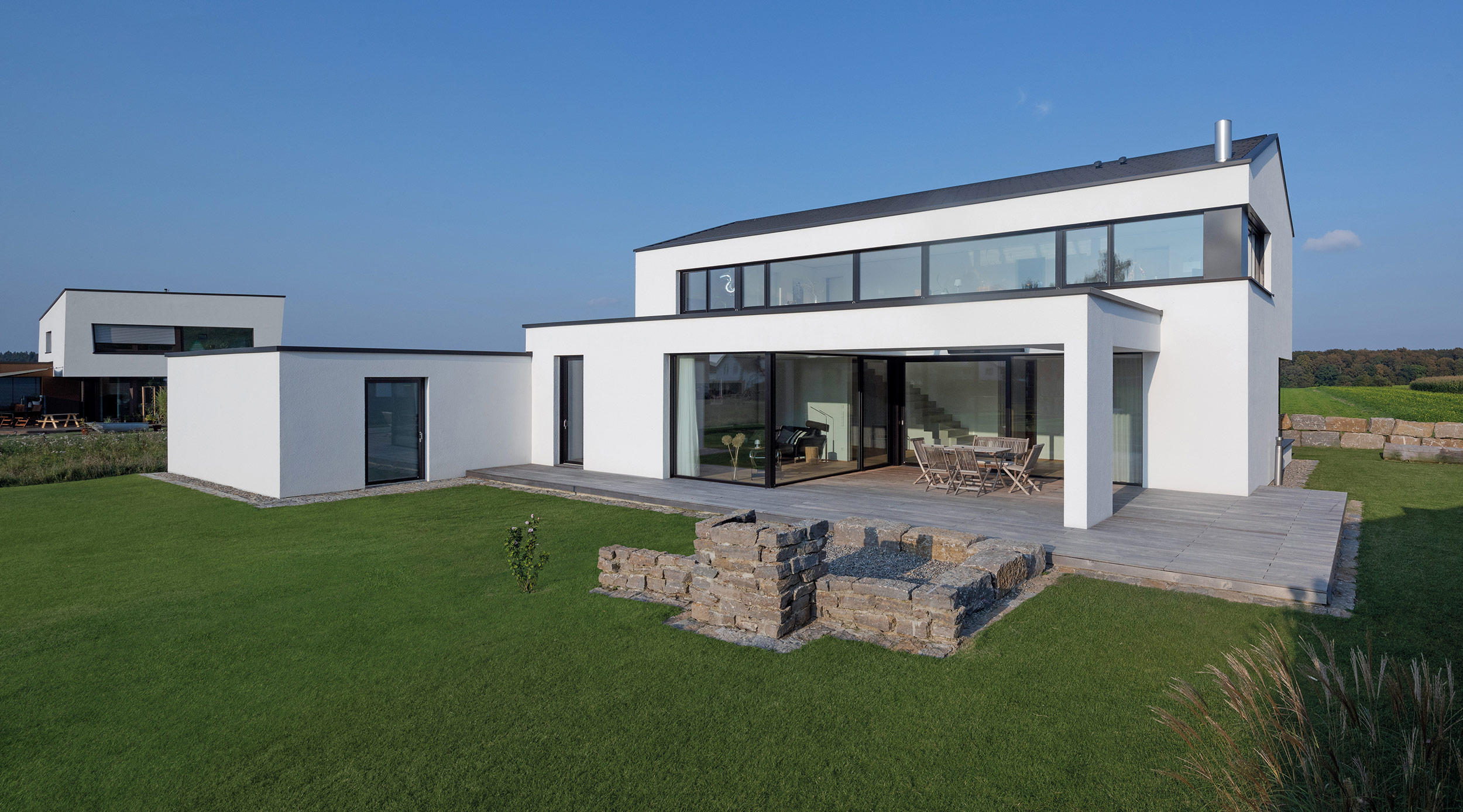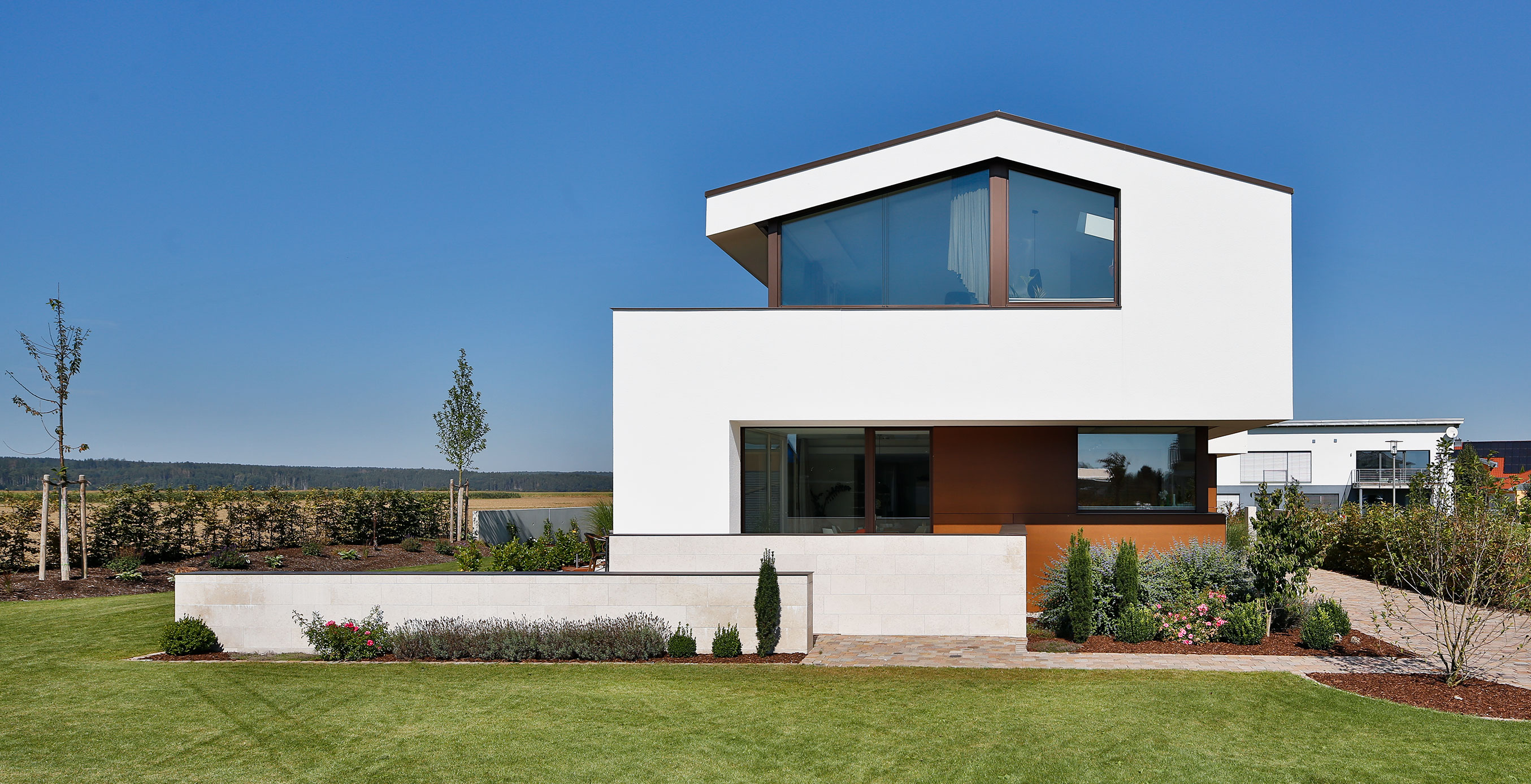 einen weiten Ausblick über Felder und Wiesen bis zum Waldrand ein. Aus Rücksicht auf die Nachbarn bleiben die nah an die Grenzen gerückten Stirnseiten weitgehend fensterlos.