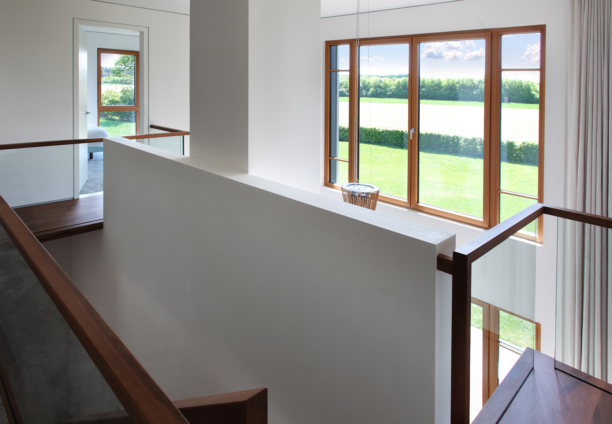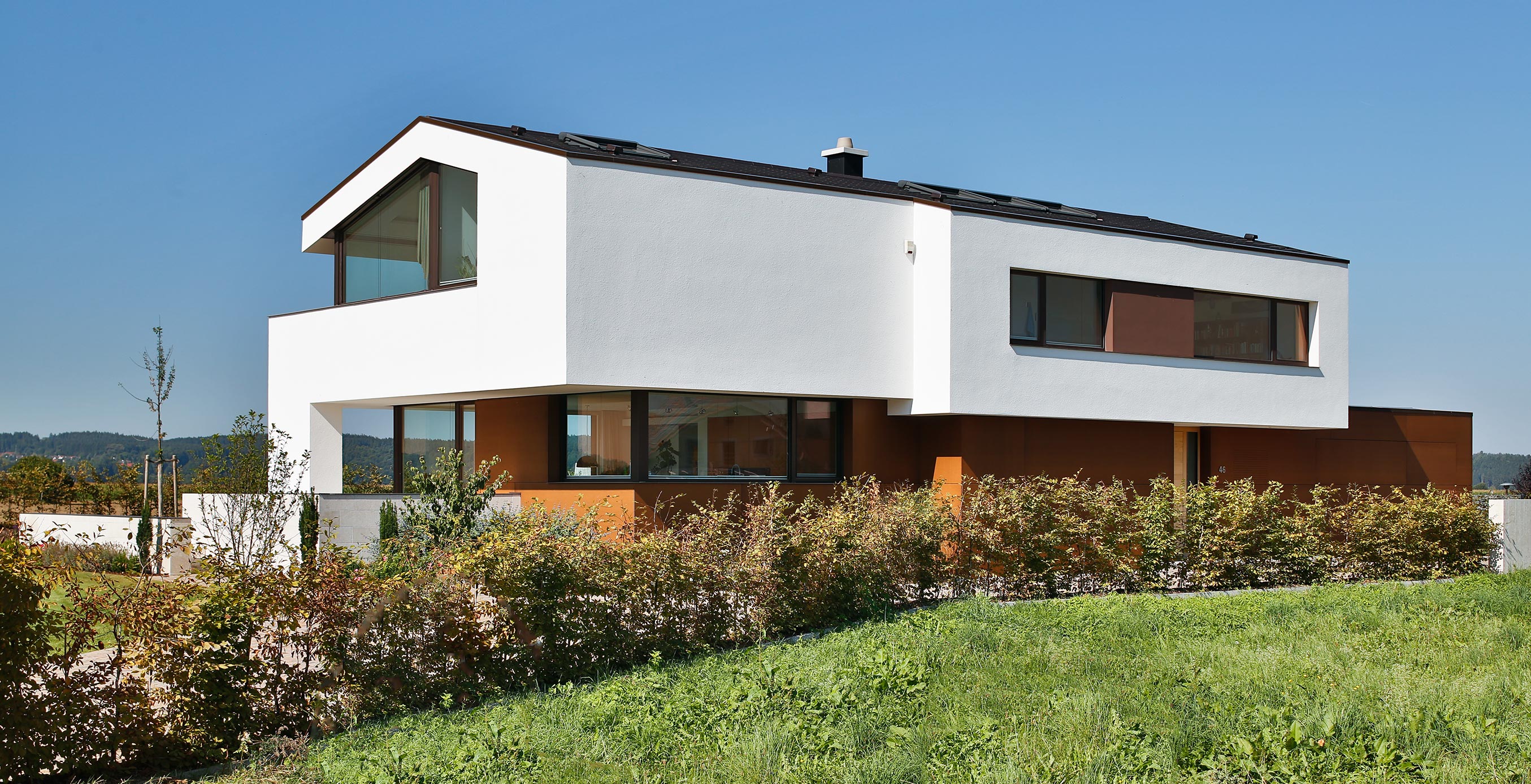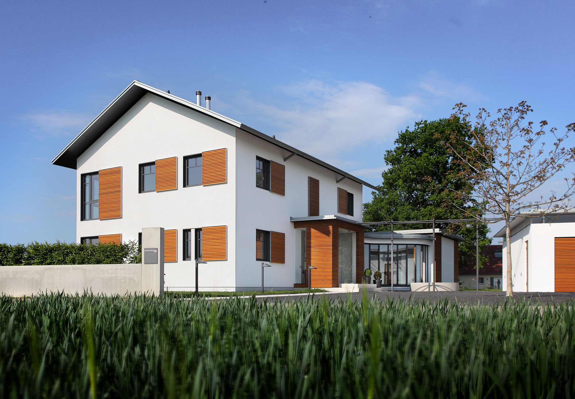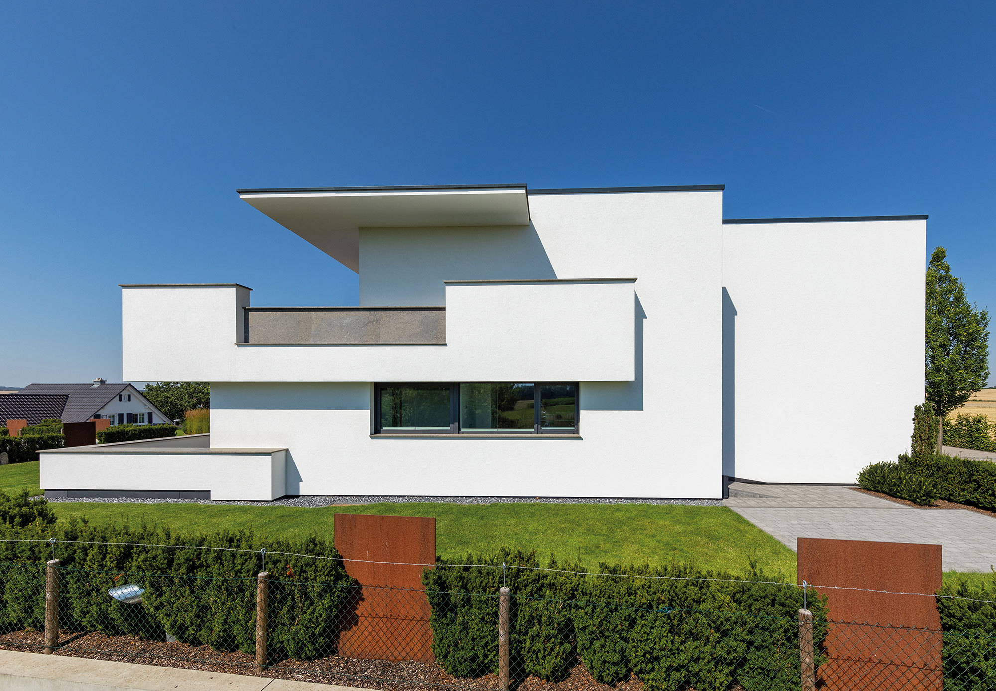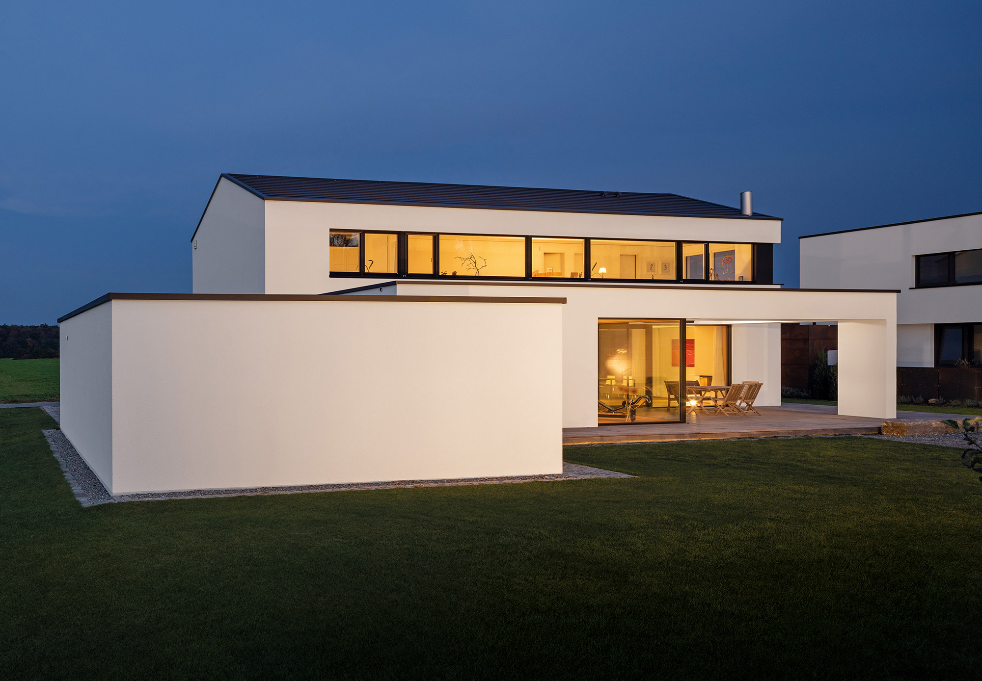 einen weiten Ausblick über Felder und Wiesen bis zum Waldrand ein. Aus Rücksicht auf die Nachbarn bleiben die nah an die Grenzen gerückten Stirnseiten weitgehend fensterlos.