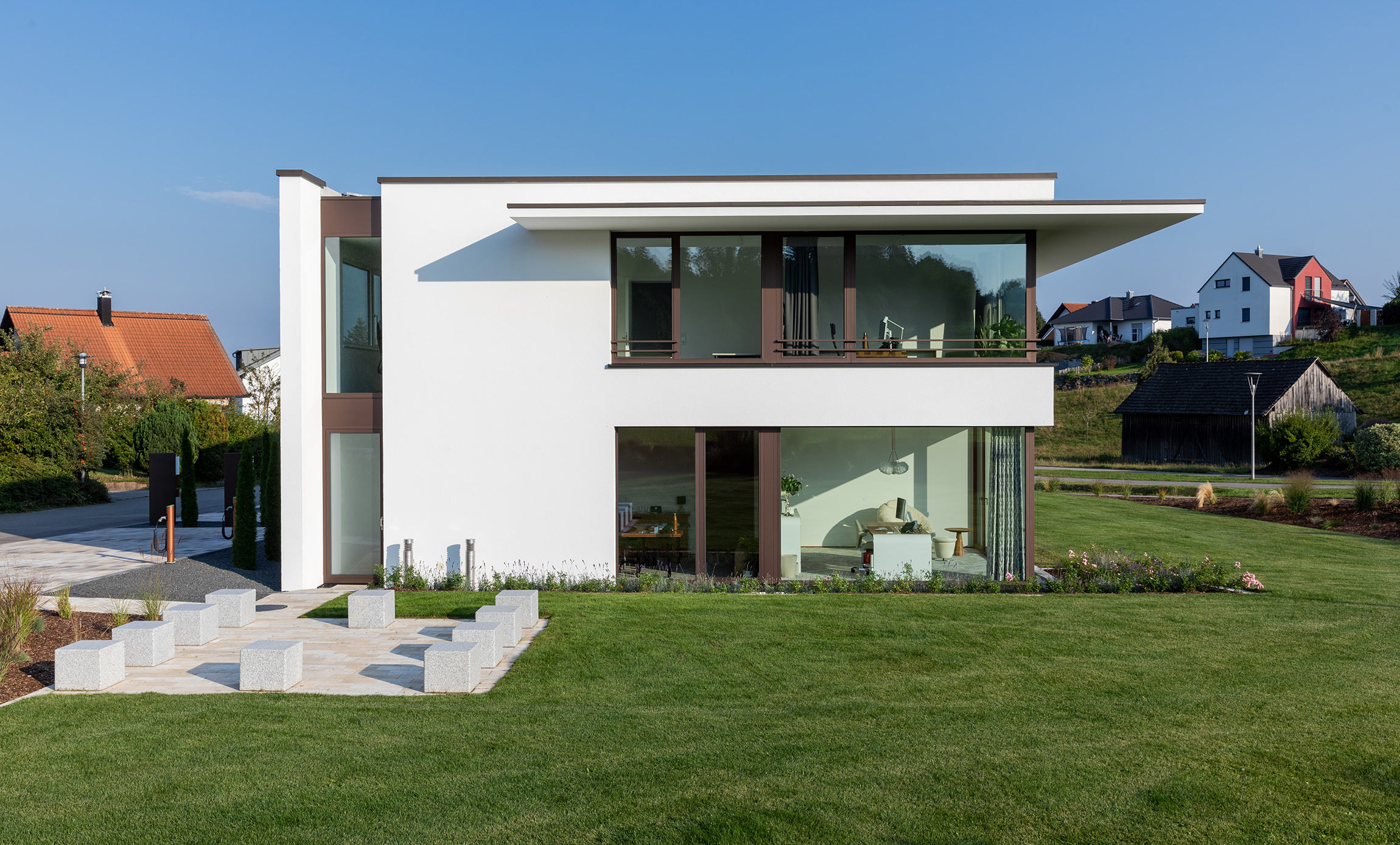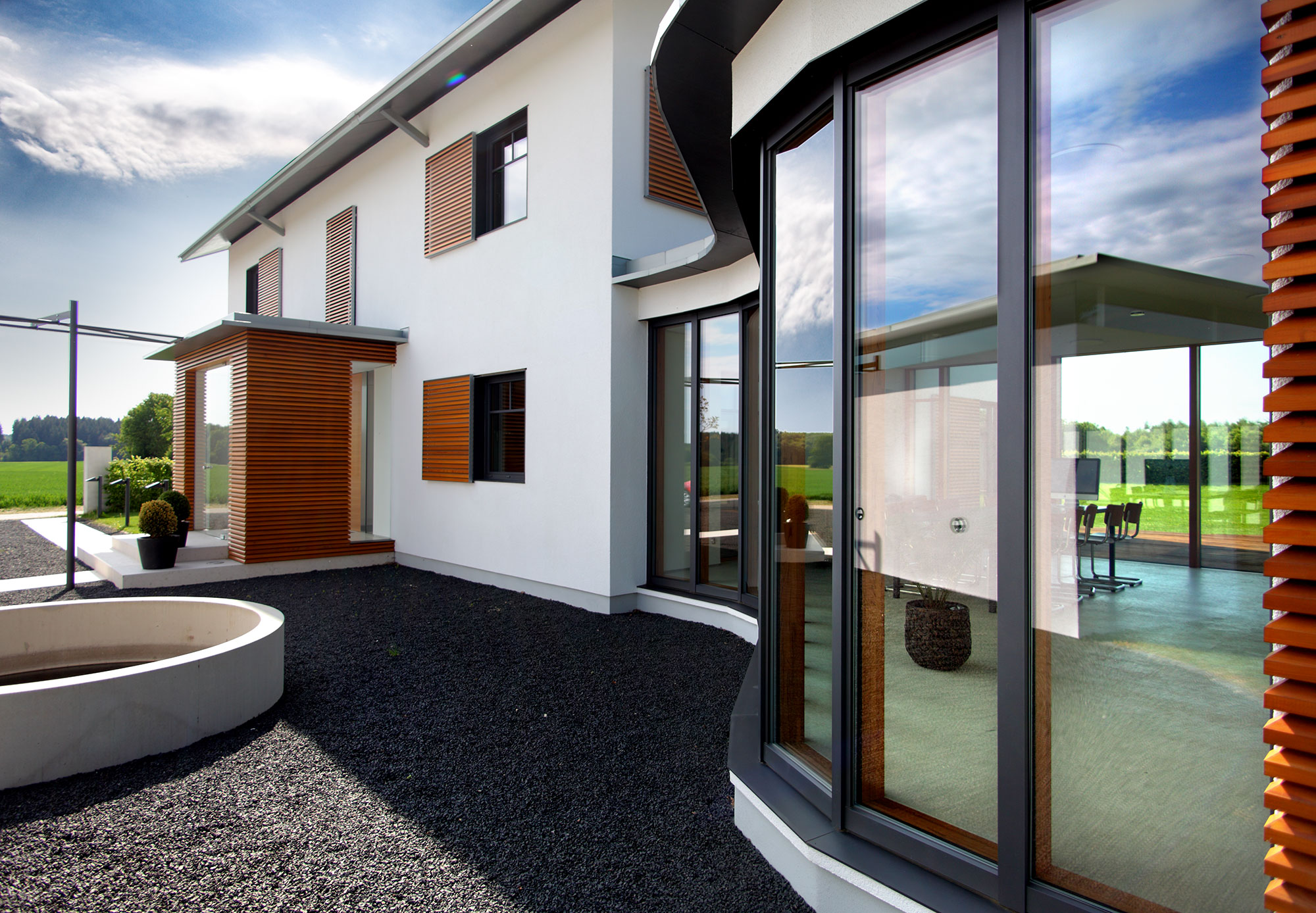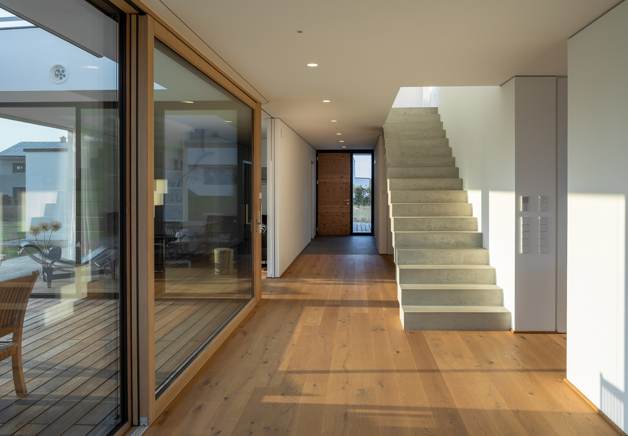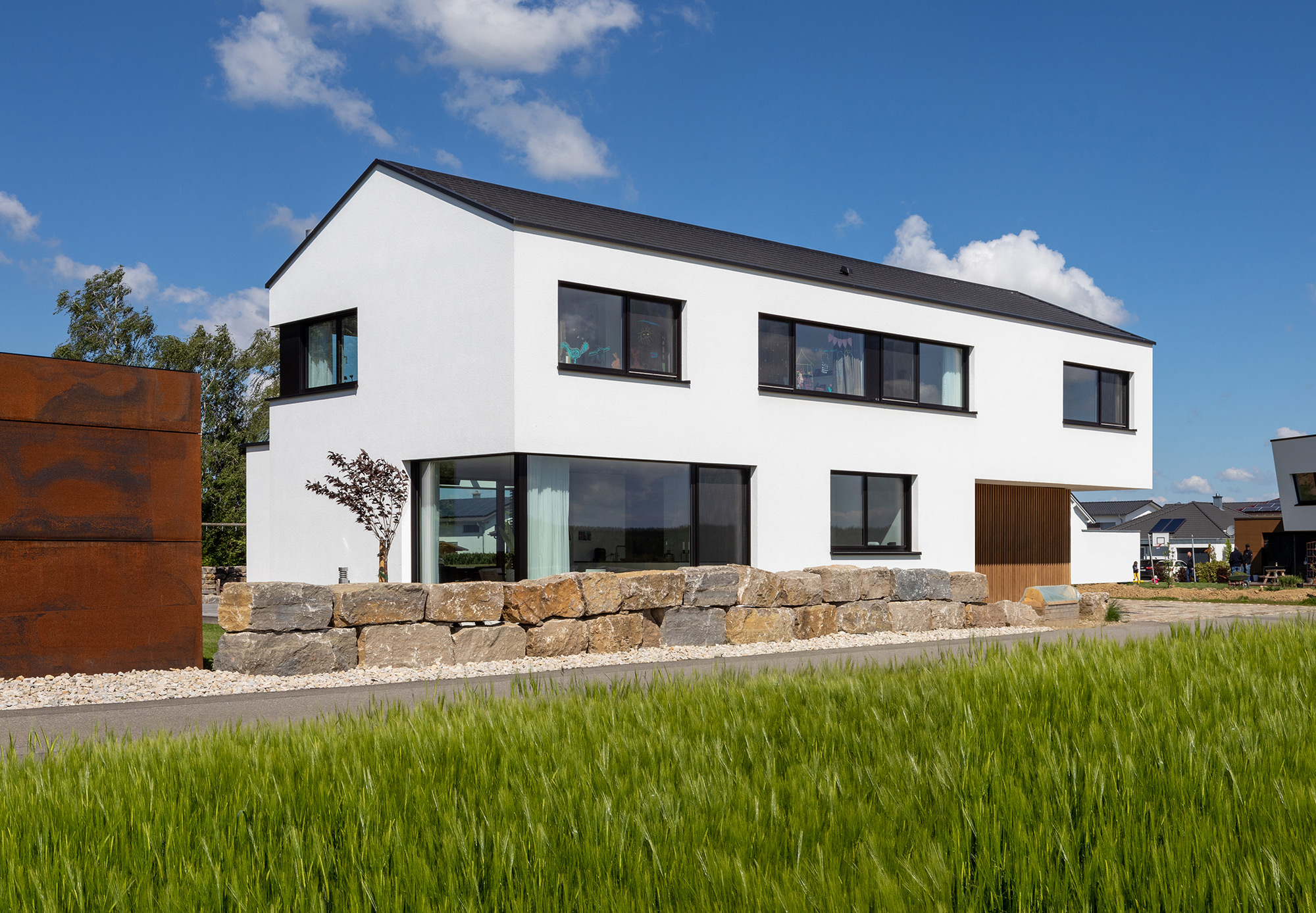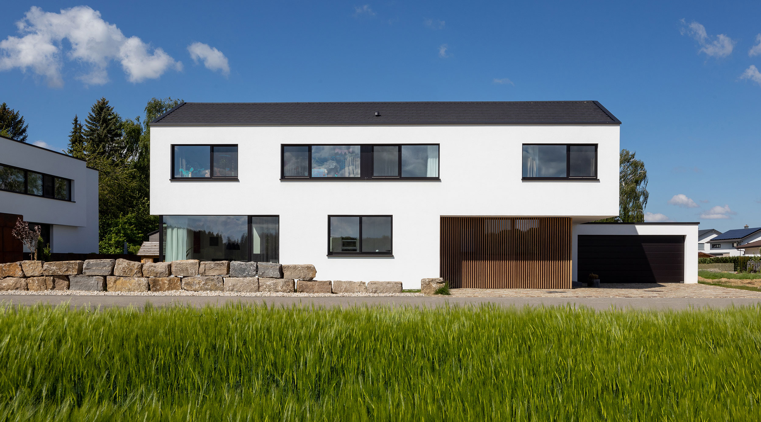 einen weiten Ausblick über Felder und Wiesen bis zum Waldrand ein. Aus Rücksicht auf die Nachbarn bleiben die nah an die Grenzen gerückten Stirnseiten weitgehend fensterlos.