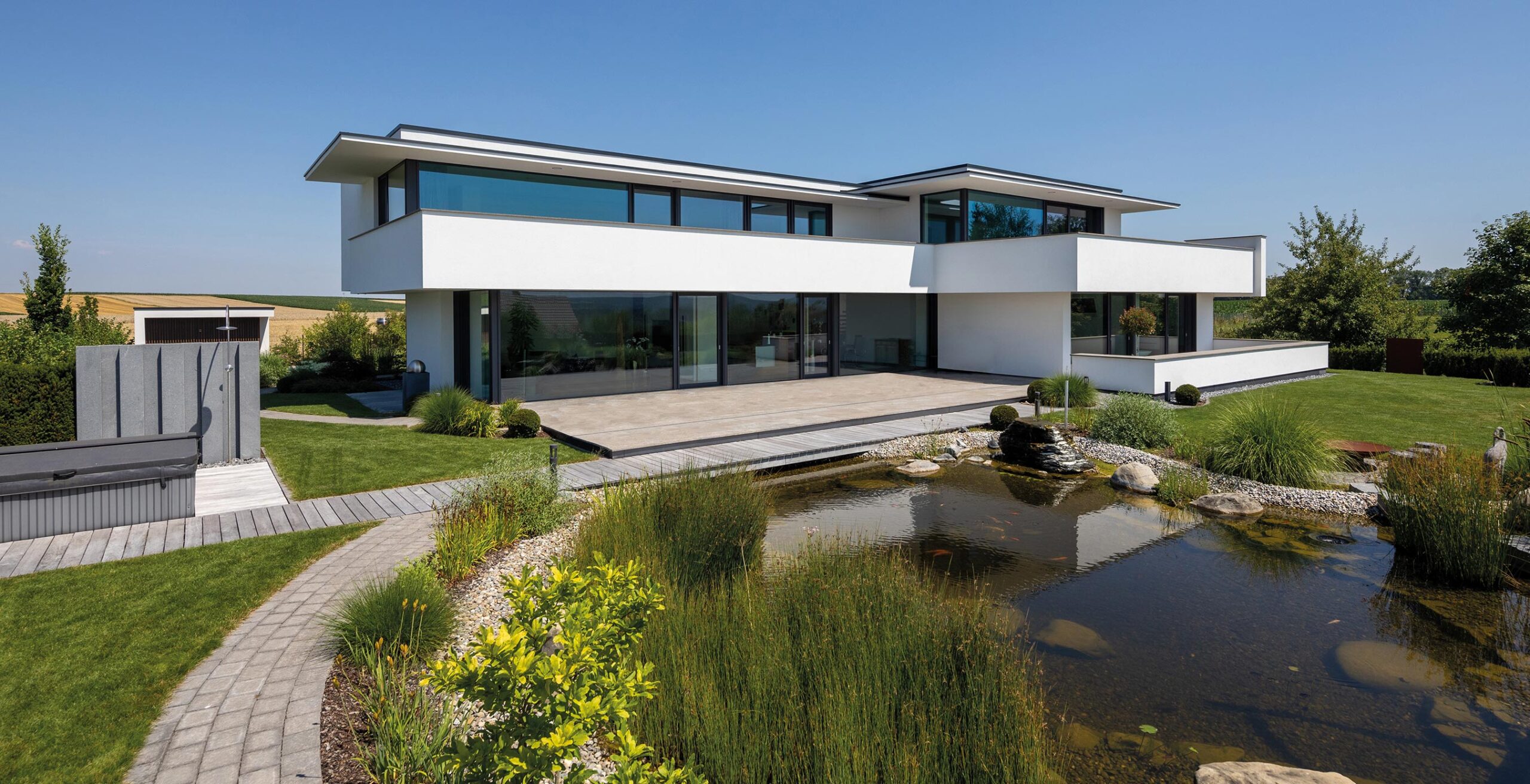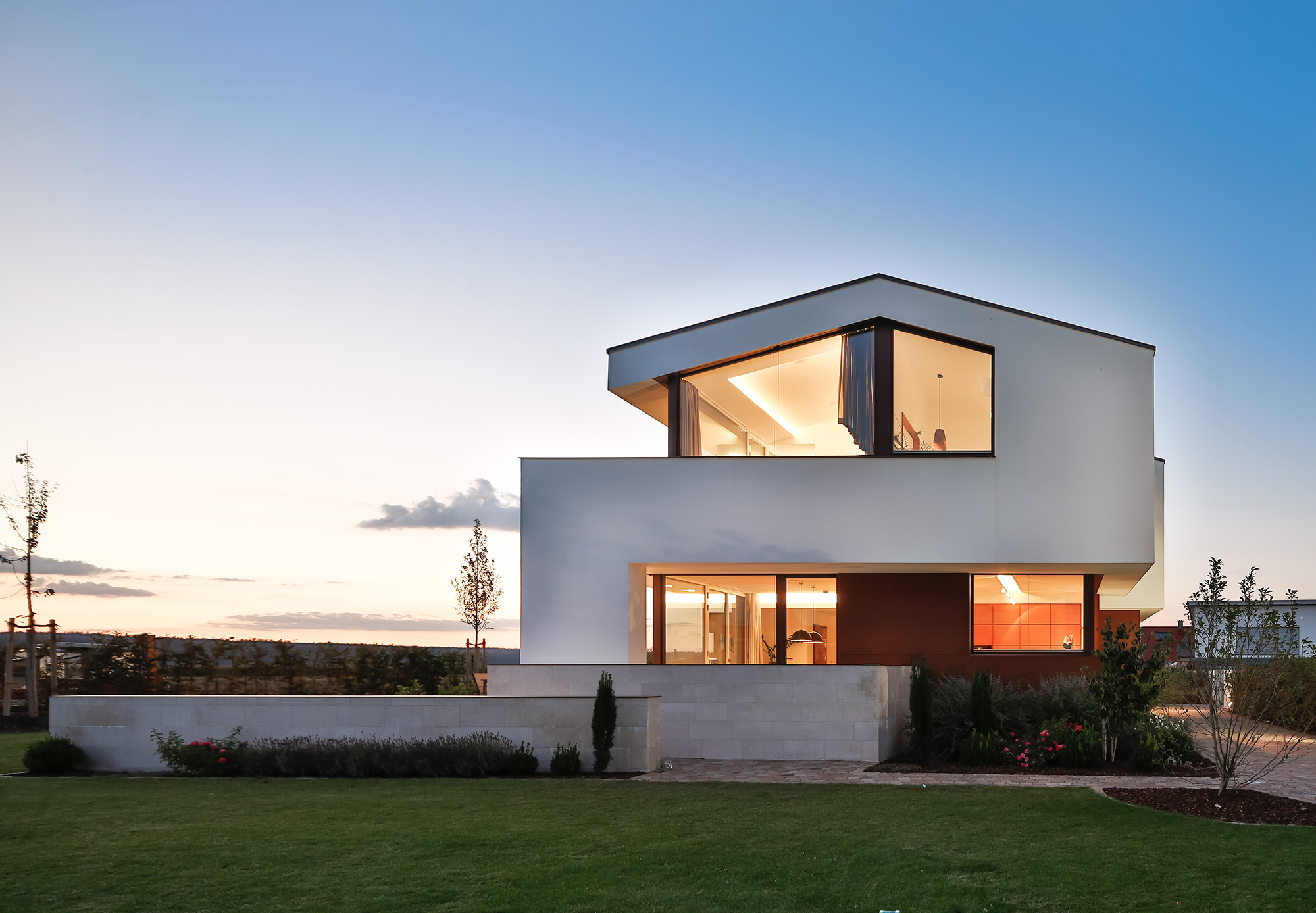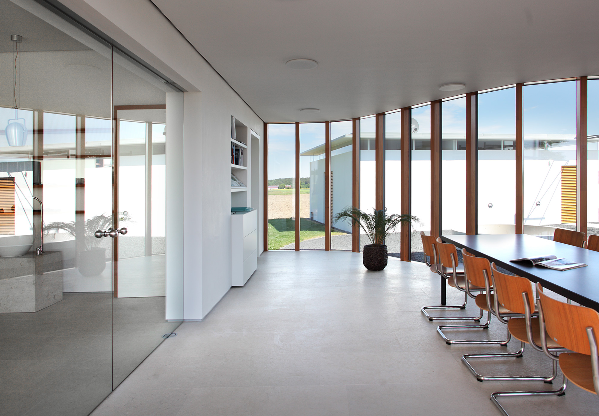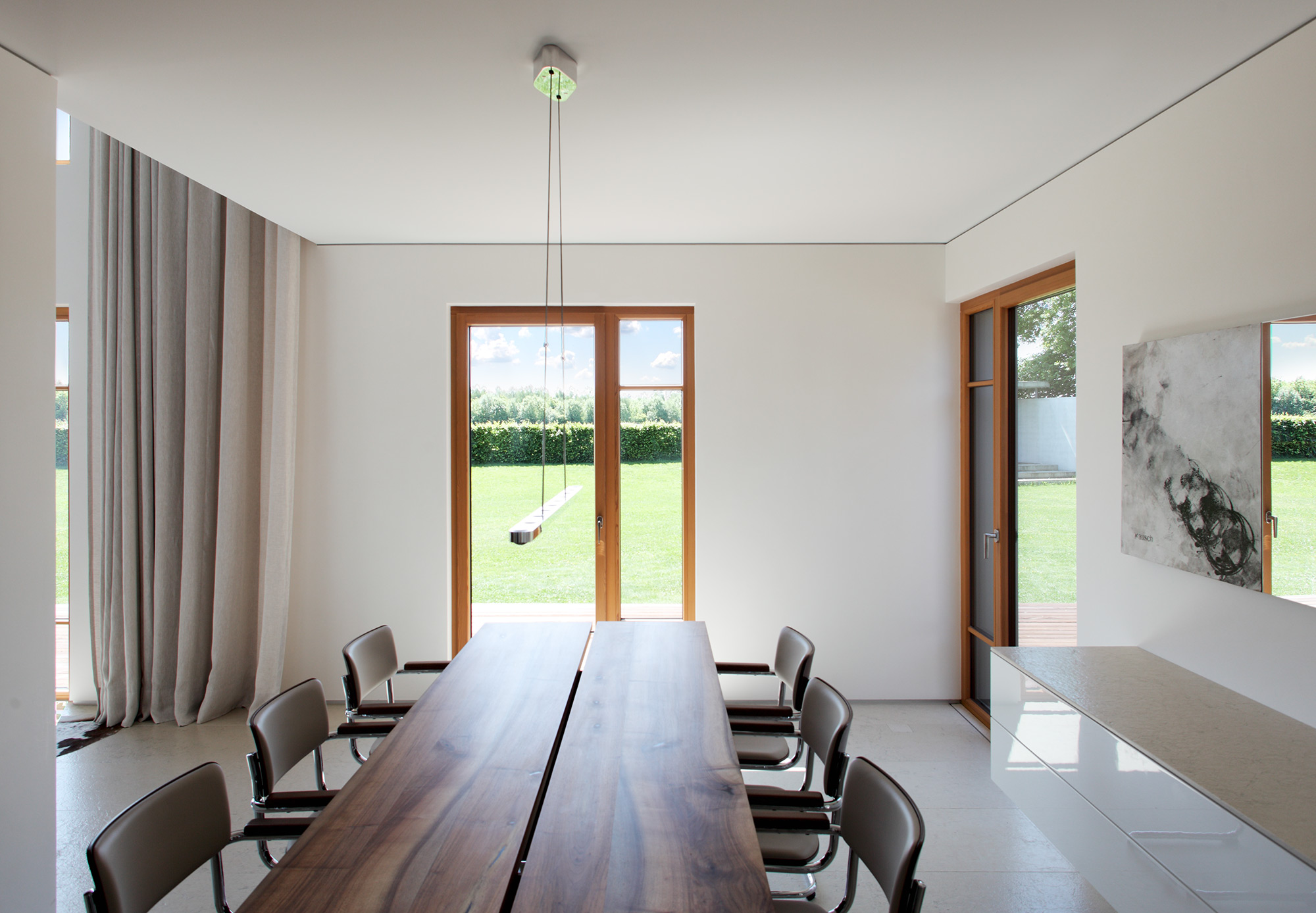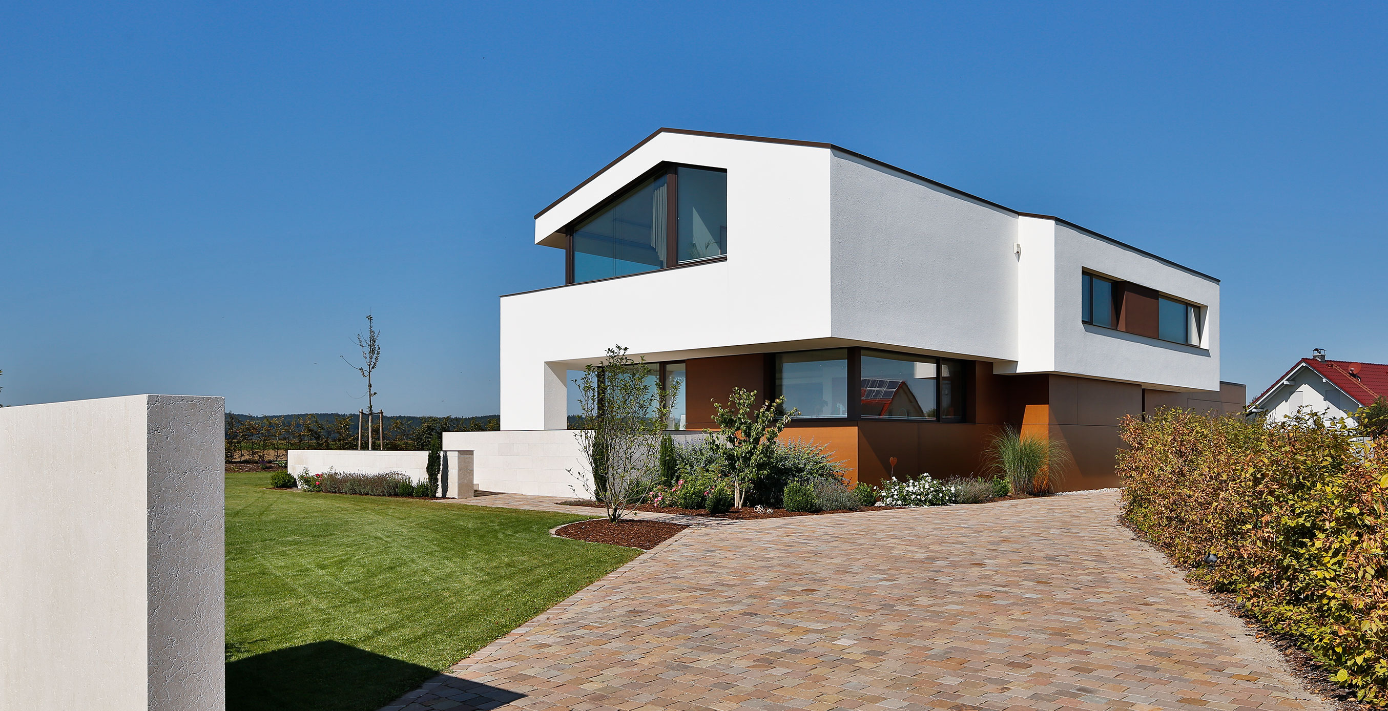 einen weiten Ausblick über Felder und Wiesen bis zum Waldrand ein. Aus Rücksicht auf die Nachbarn bleiben die nah an die Grenzen gerückten Stirnseiten weitgehend fensterlos.