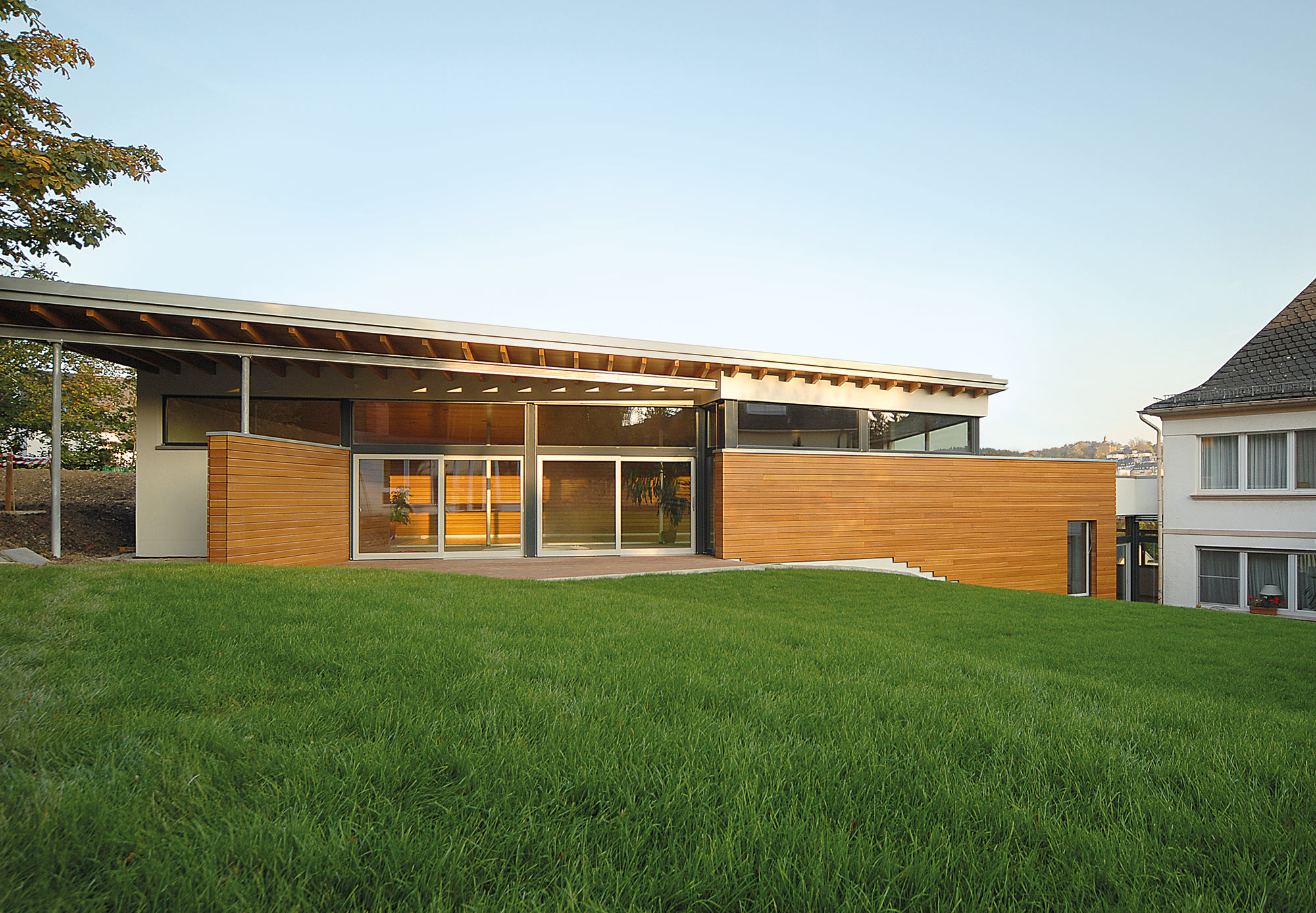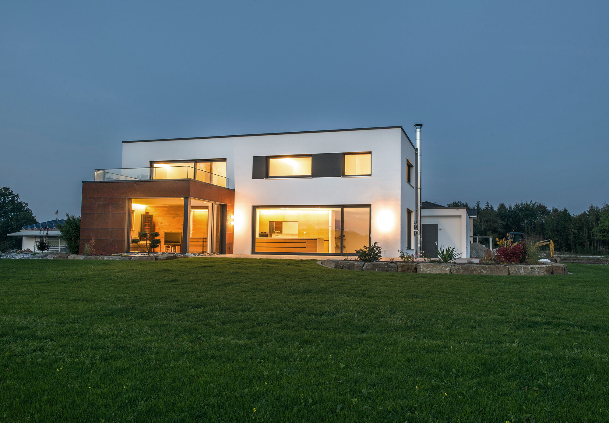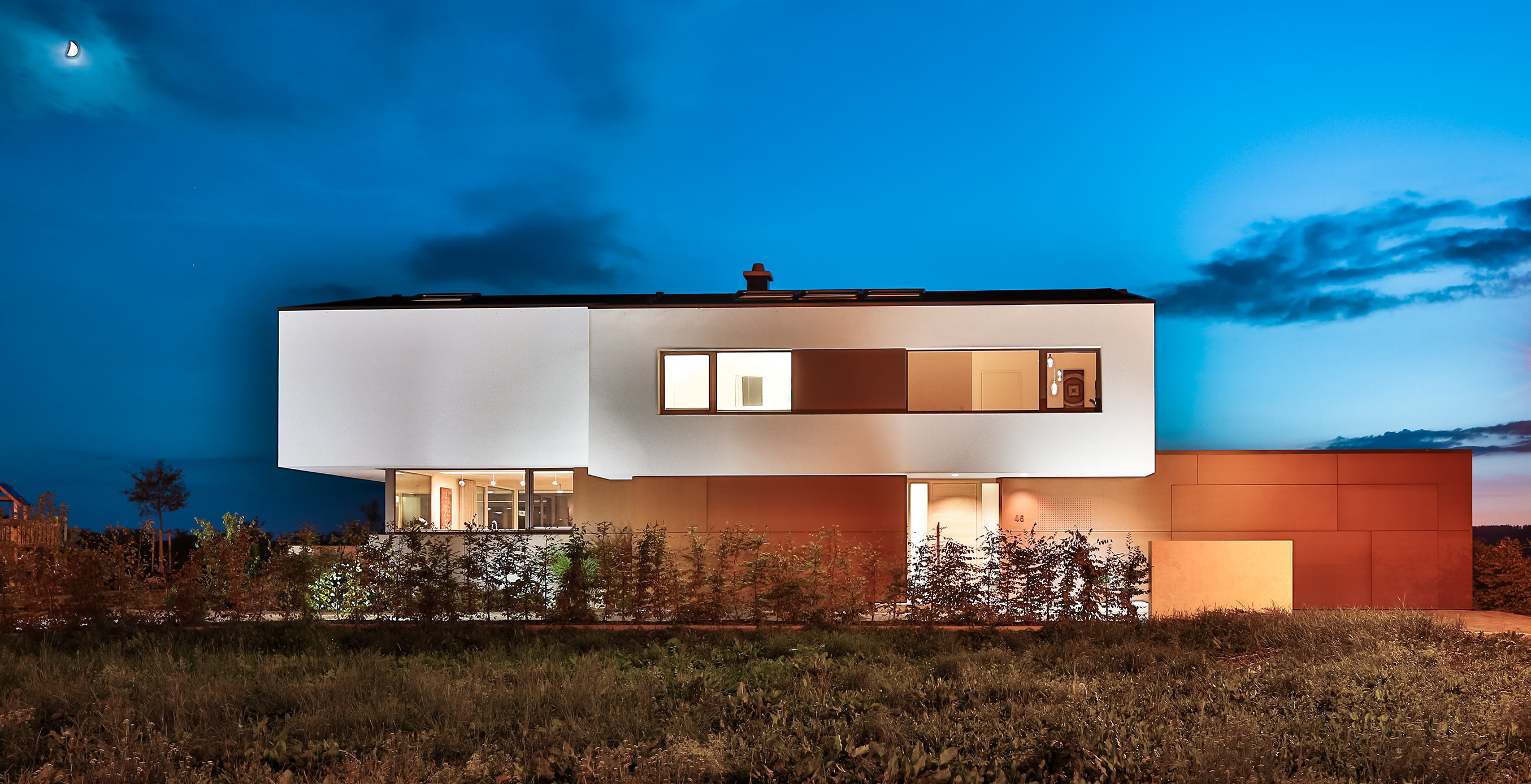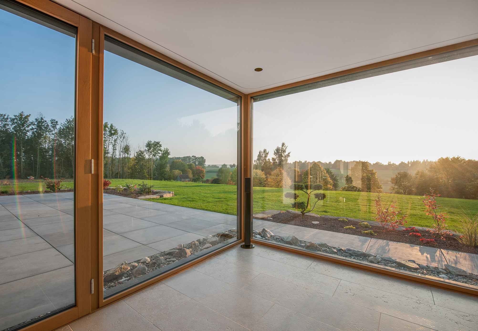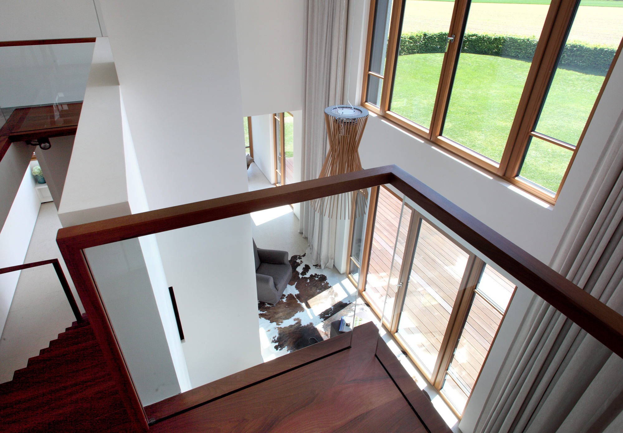 einen weiten Ausblick über Felder und Wiesen bis zum Waldrand ein. Aus Rücksicht auf die Nachbarn bleiben die nah an die Grenzen gerückten Stirnseiten weitgehend fensterlos.