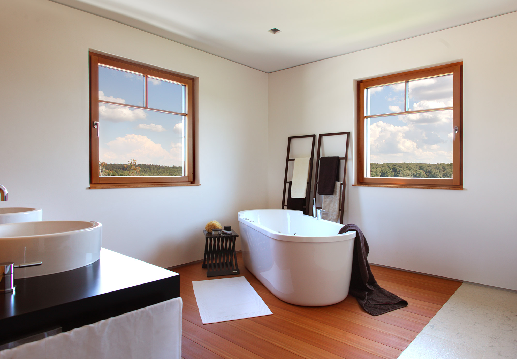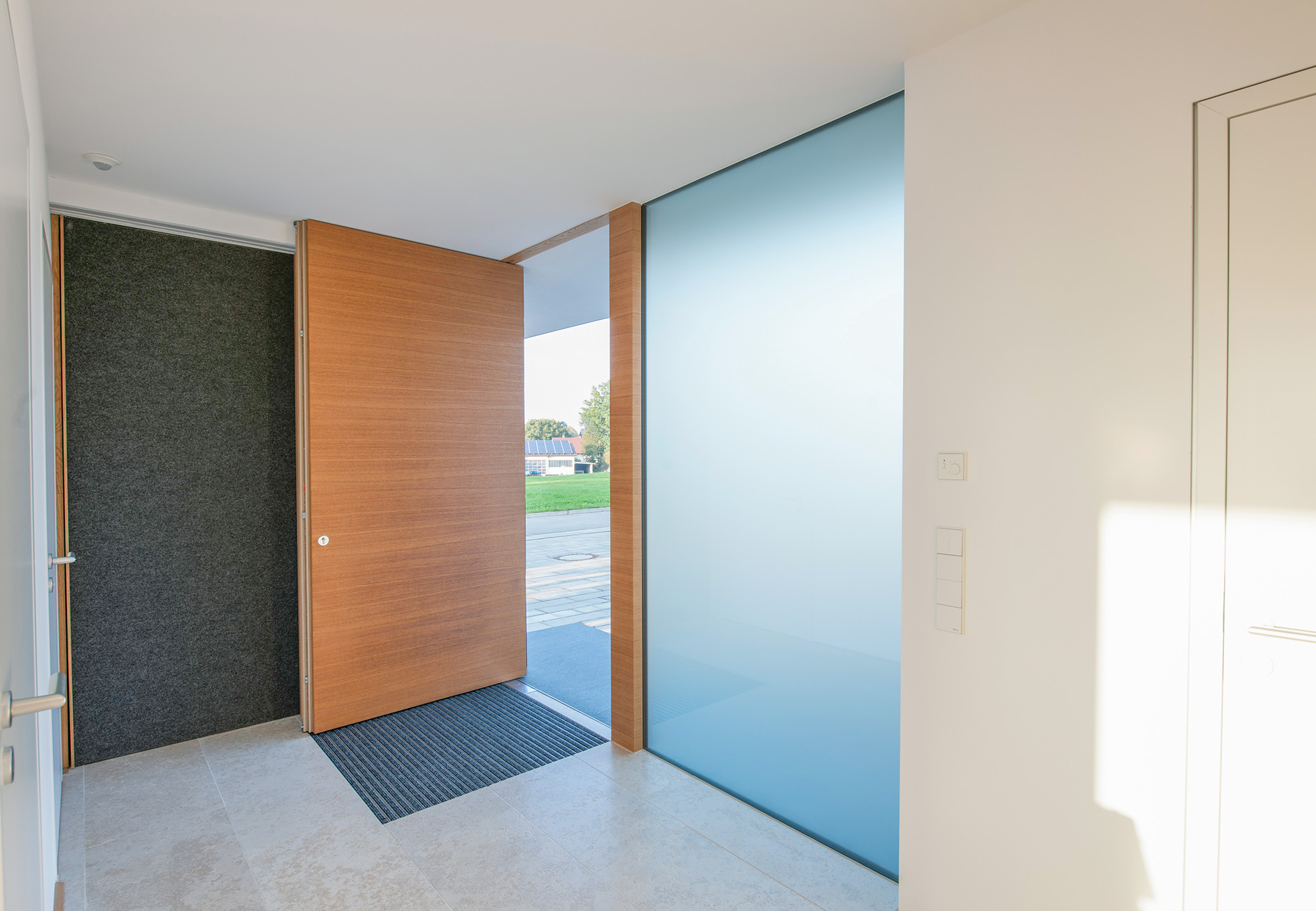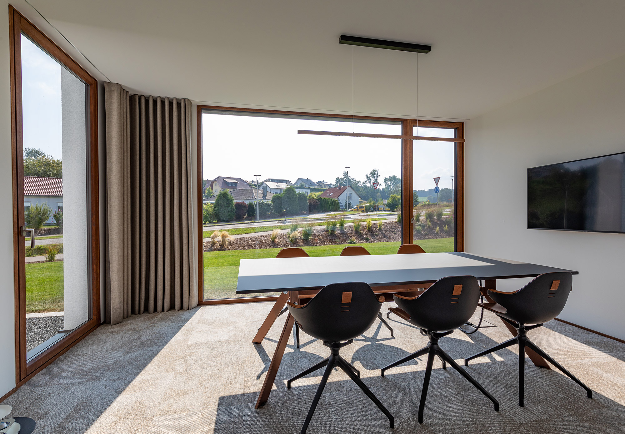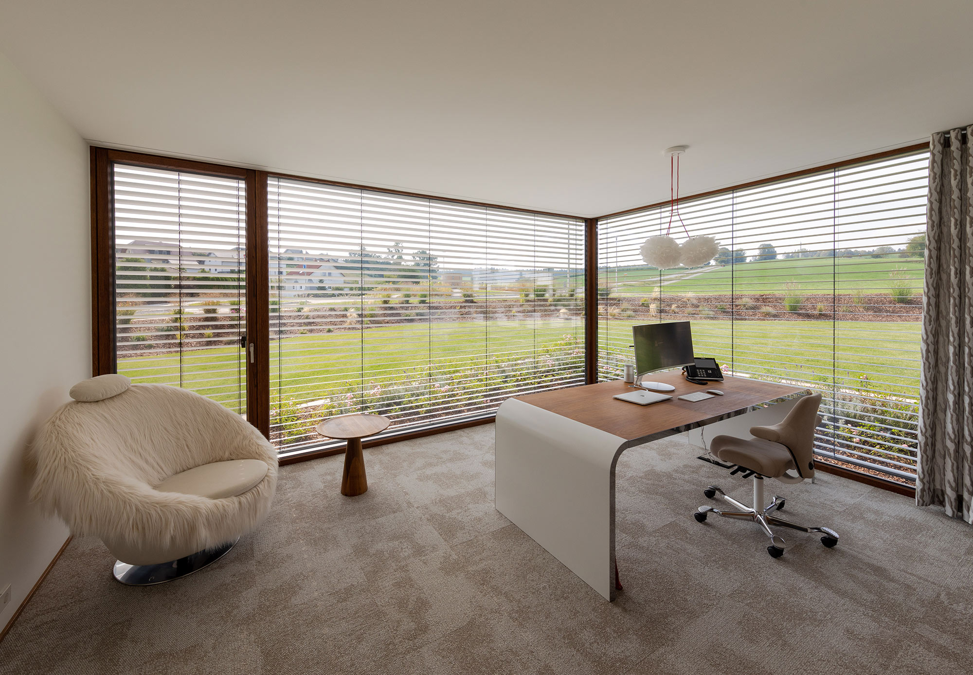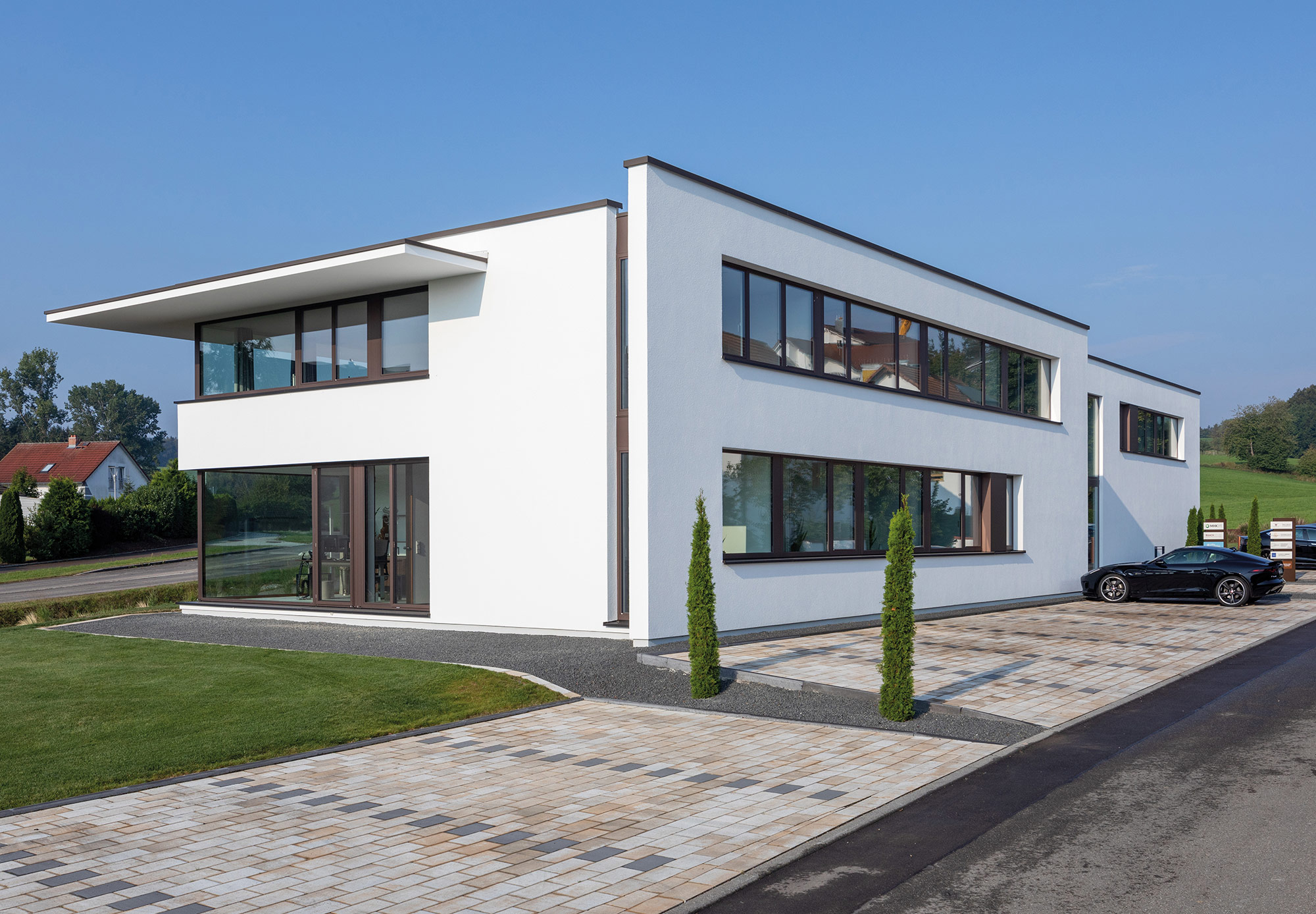 einen weiten Ausblick über Felder und Wiesen bis zum Waldrand ein. Aus Rücksicht auf die Nachbarn bleiben die nah an die Grenzen gerückten Stirnseiten weitgehend fensterlos.