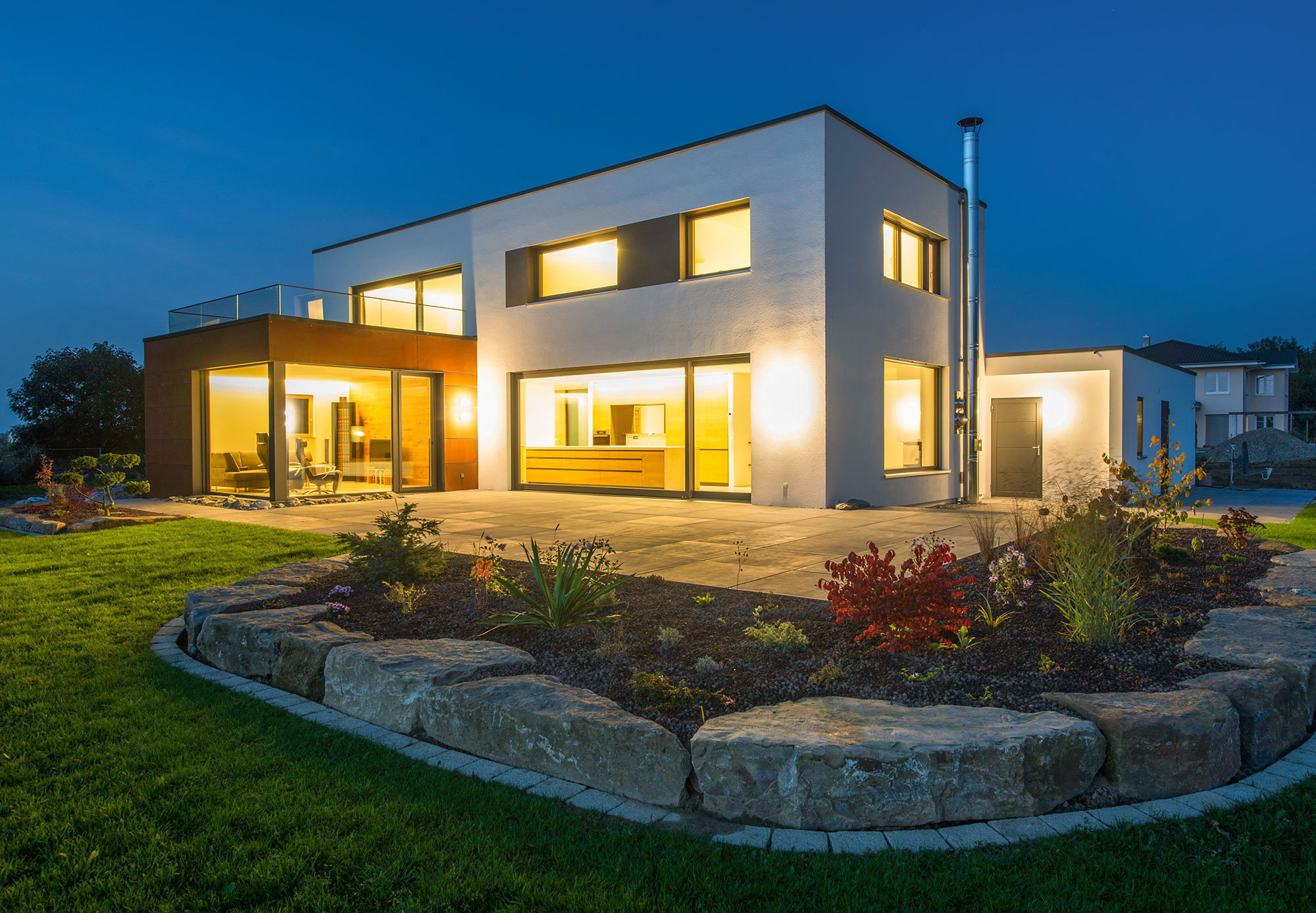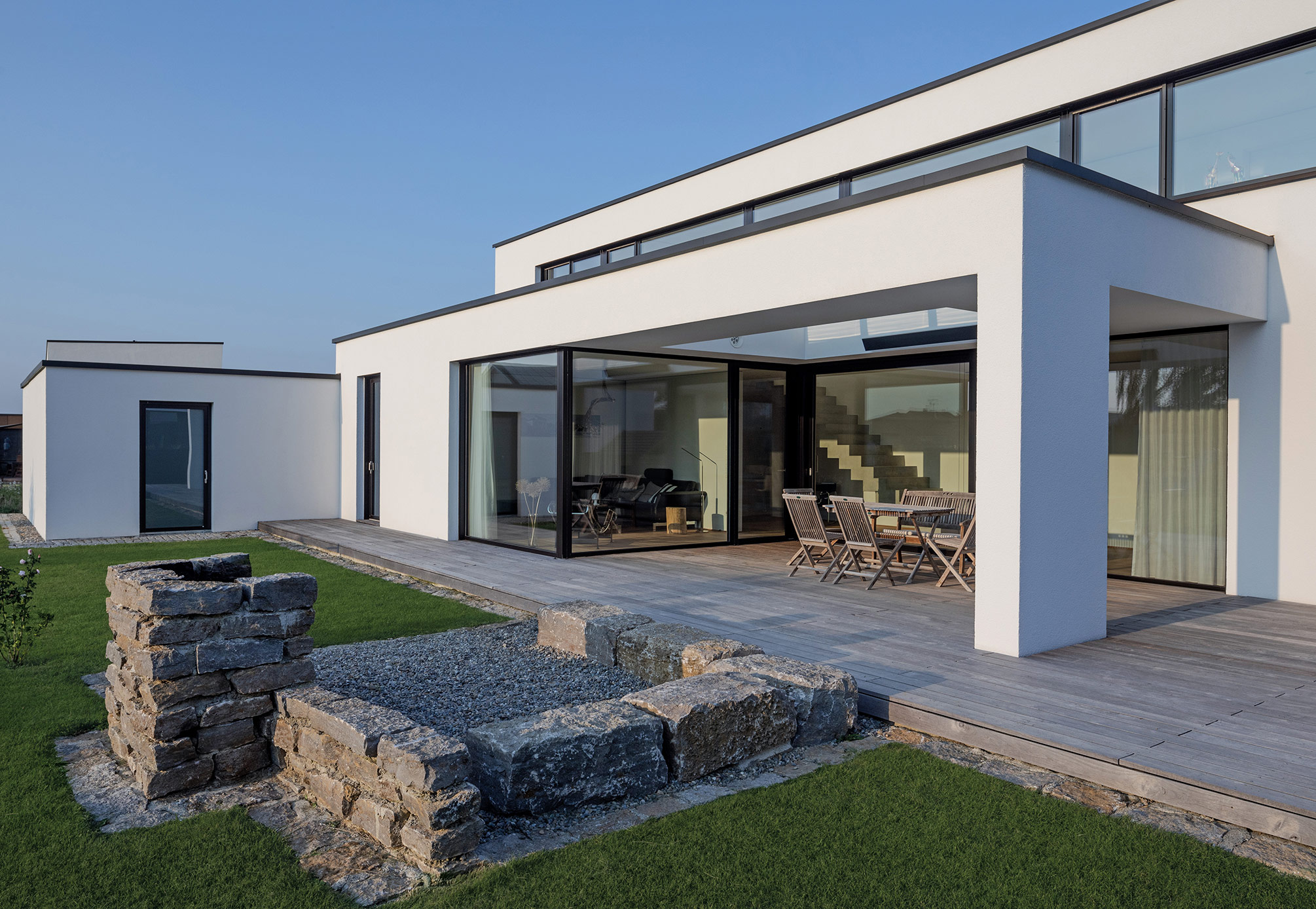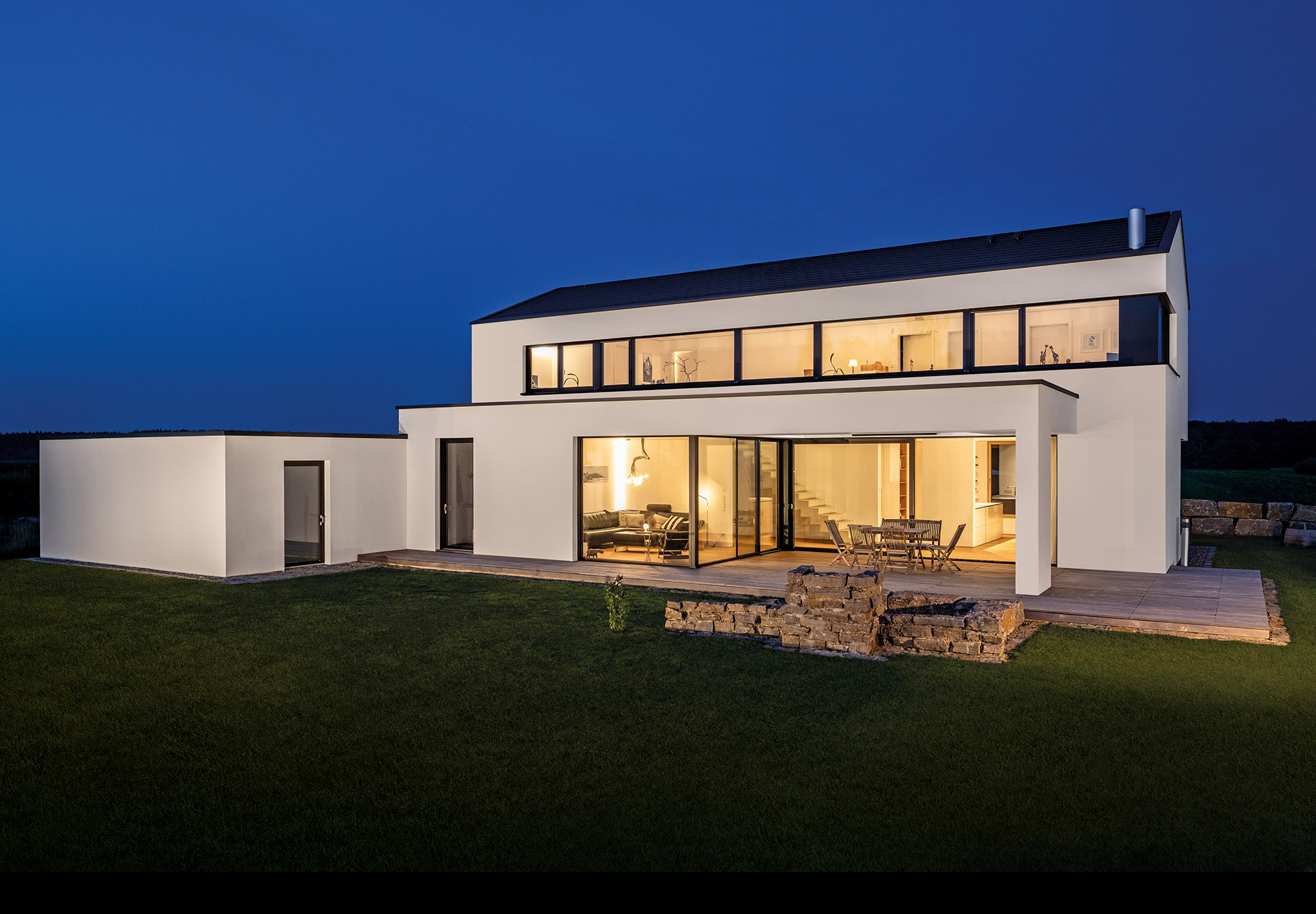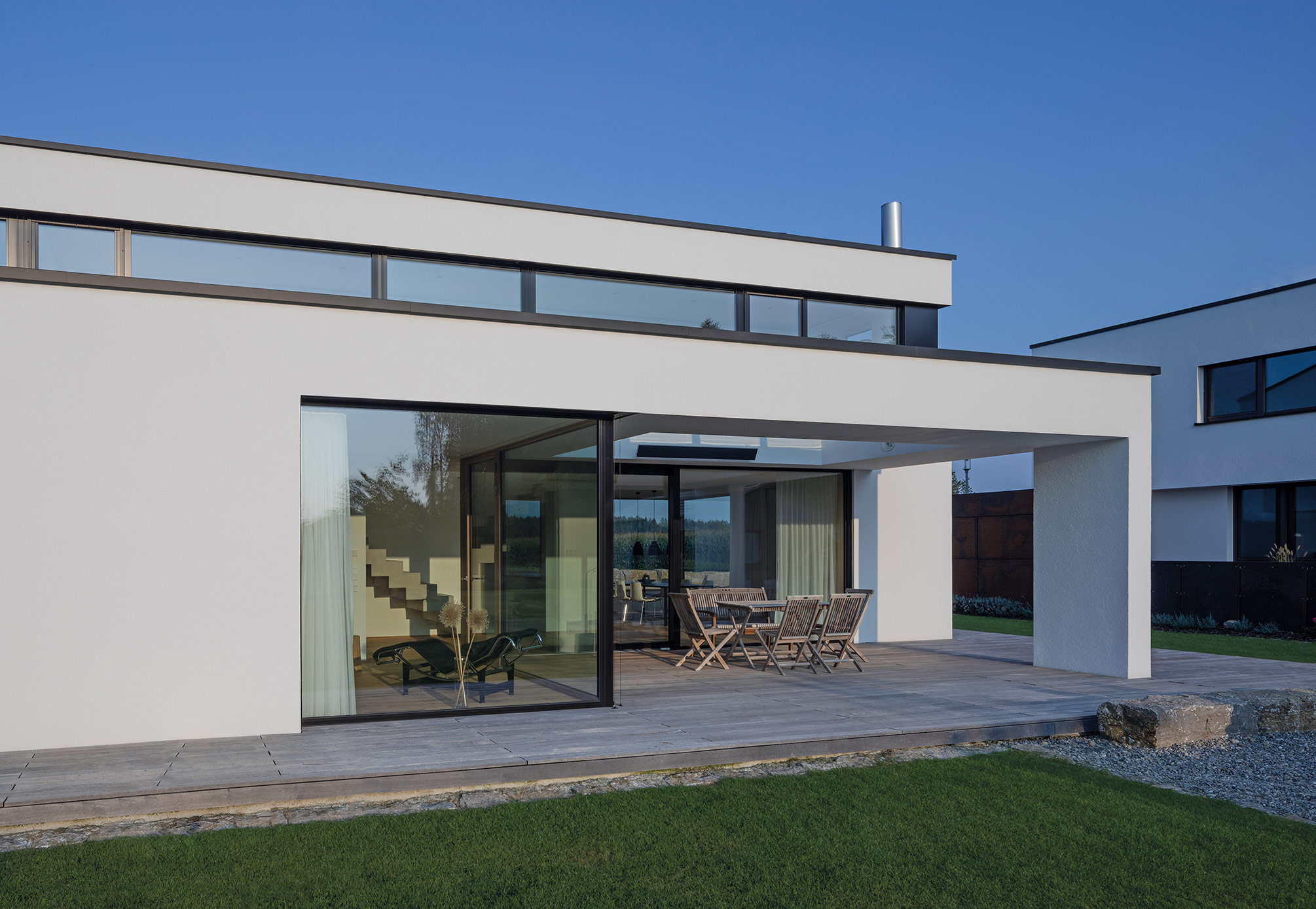Zum Garten hin öffnet sich das Bauwerk im Esszimmer mit einer großen Verglasung in die Weite des Illertals und fängt immer wieder einen schönen Sonnenuntergang ein. Eine hochliegende Terrasse in Stein vor dem Esszimmer biete den freien Blick, die tiefliegende Terrasse in Holz vor dem Wohnzimmer schafft Geborgenheit und Rückzug.