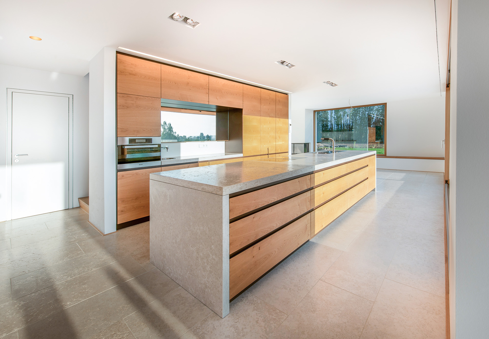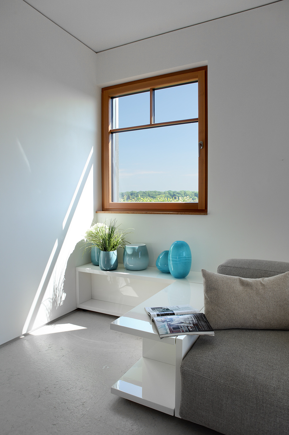 Das breit angelegte Fensterband schafft durch seine erhöhte Position im oberen Stockwerk Distanz zum Spazierweg, fängt aber gleichzeitig Richtung Osten