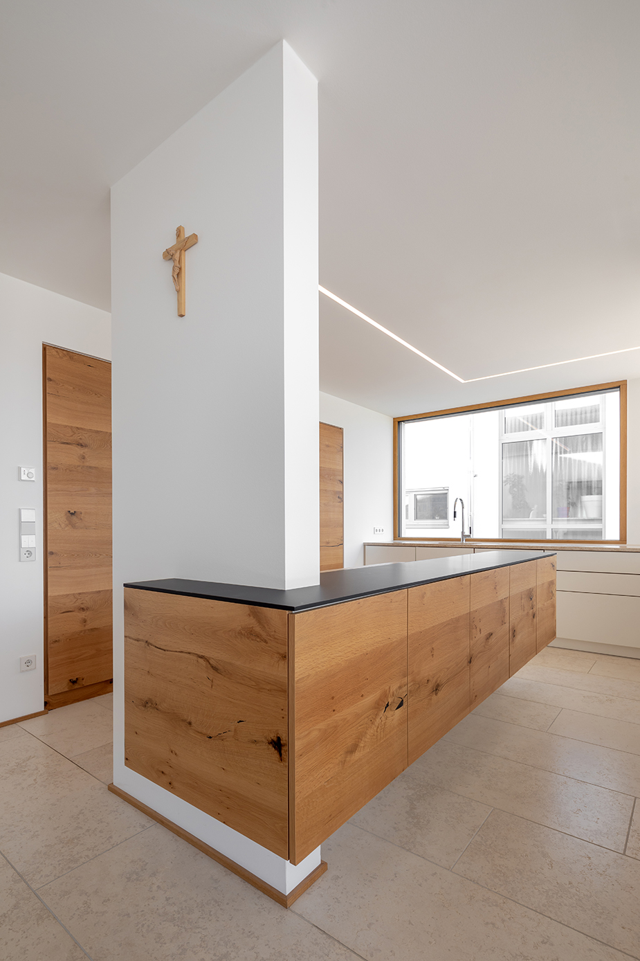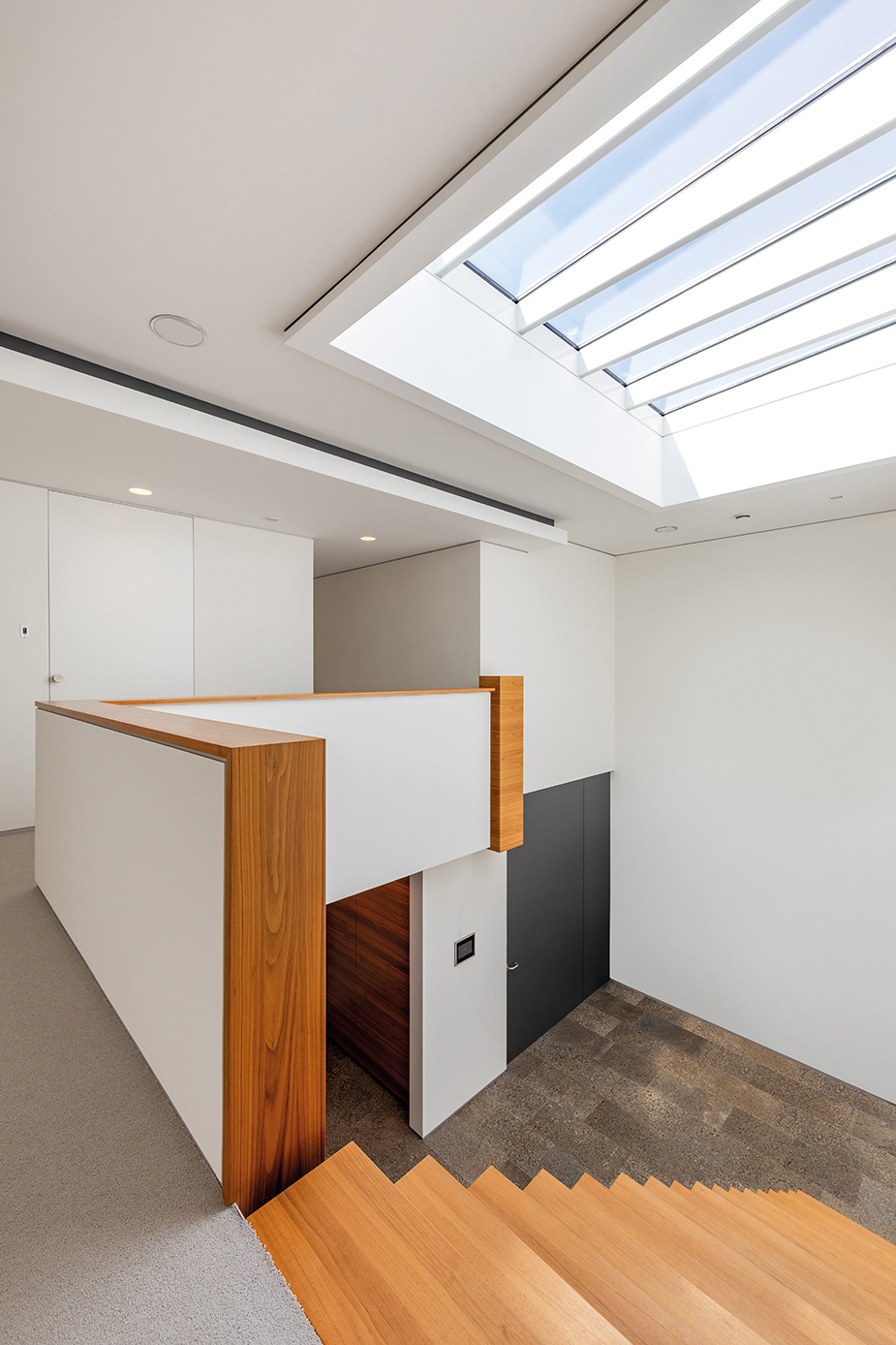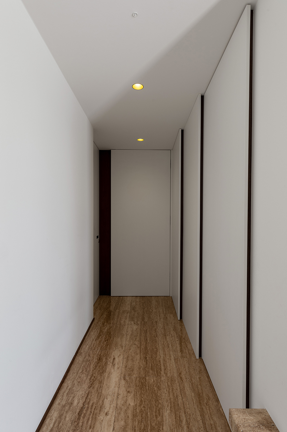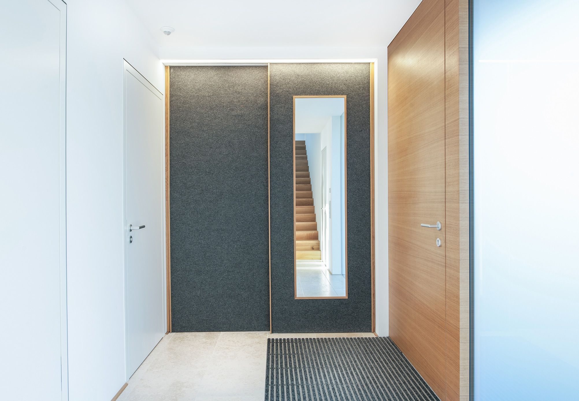 Nach der Haustüre beginnt eine lange Erschließungsachse, an der die privaten Zimmer aufgegliedert sind. Einbauschränke nehmen unzählige Dinge des Alltags auf und sorgen für den nötigen Stauraum. Der Innenraum wurde so entworfen, dass er dem 3. Lebensabschnitt ebenso wie der Gestaltung gerecht wird.