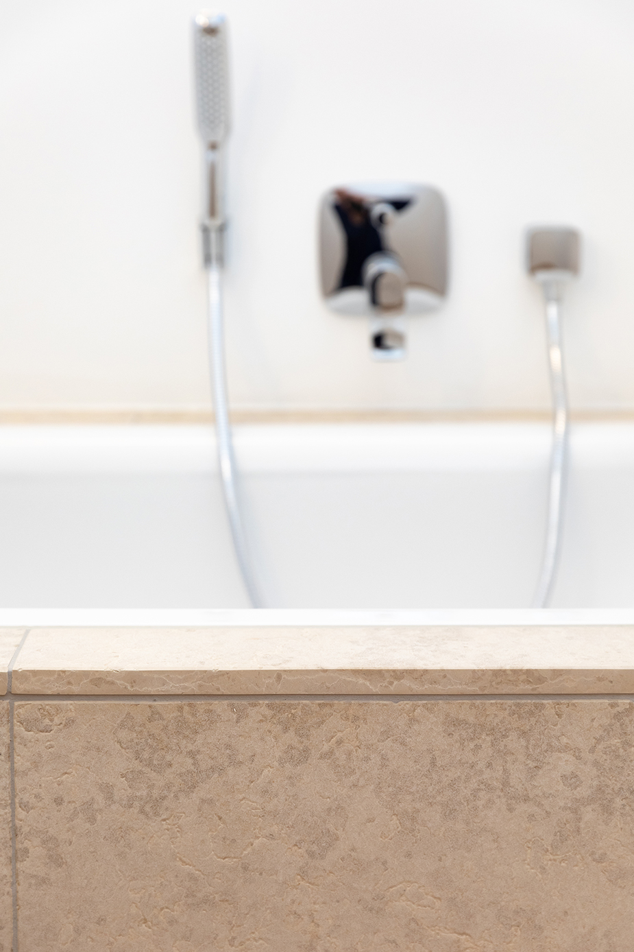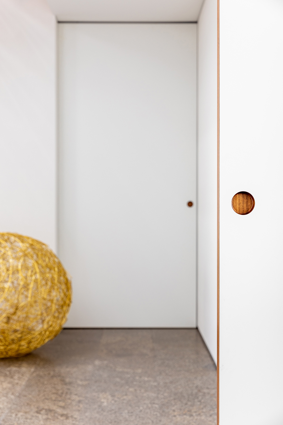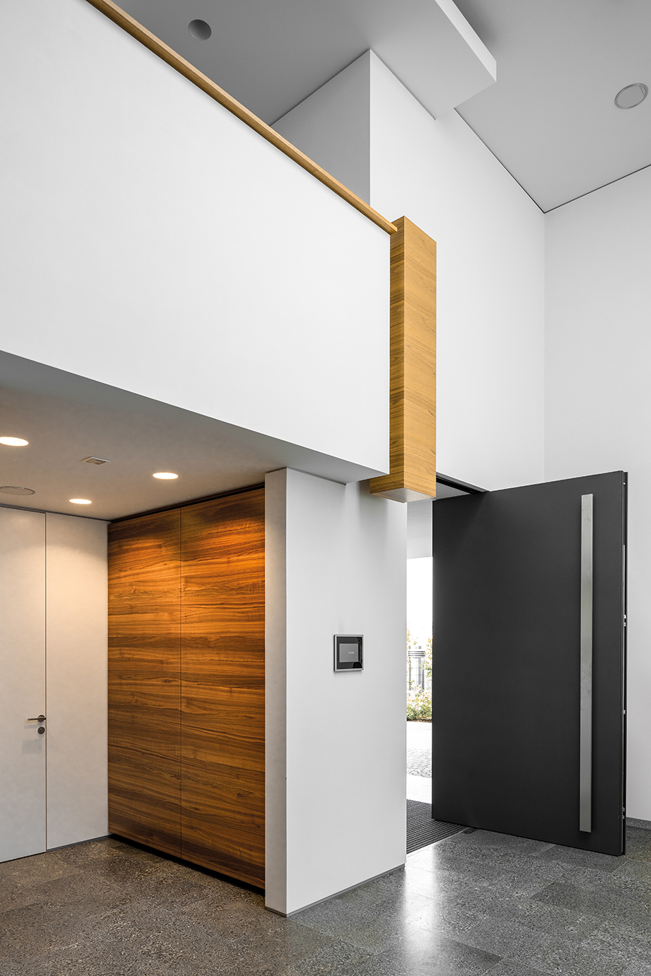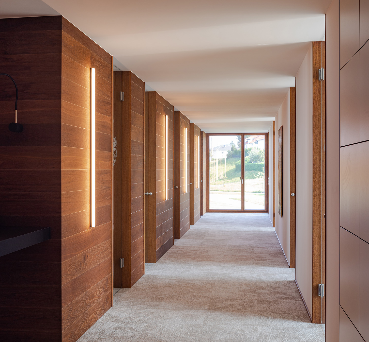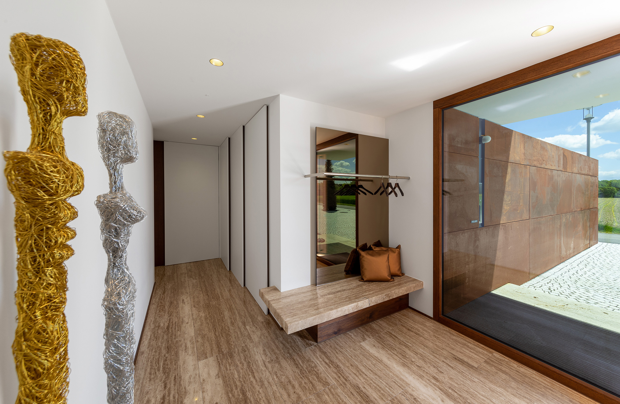 Nach der Haustüre beginnt eine lange Erschließungsachse, an der die privaten Zimmer aufgegliedert sind. Einbauschränke nehmen unzählige Dinge des Alltags auf und sorgen für den nötigen Stauraum. Der Innenraum wurde so entworfen, dass er dem 3. Lebensabschnitt ebenso wie der Gestaltung gerecht wird.