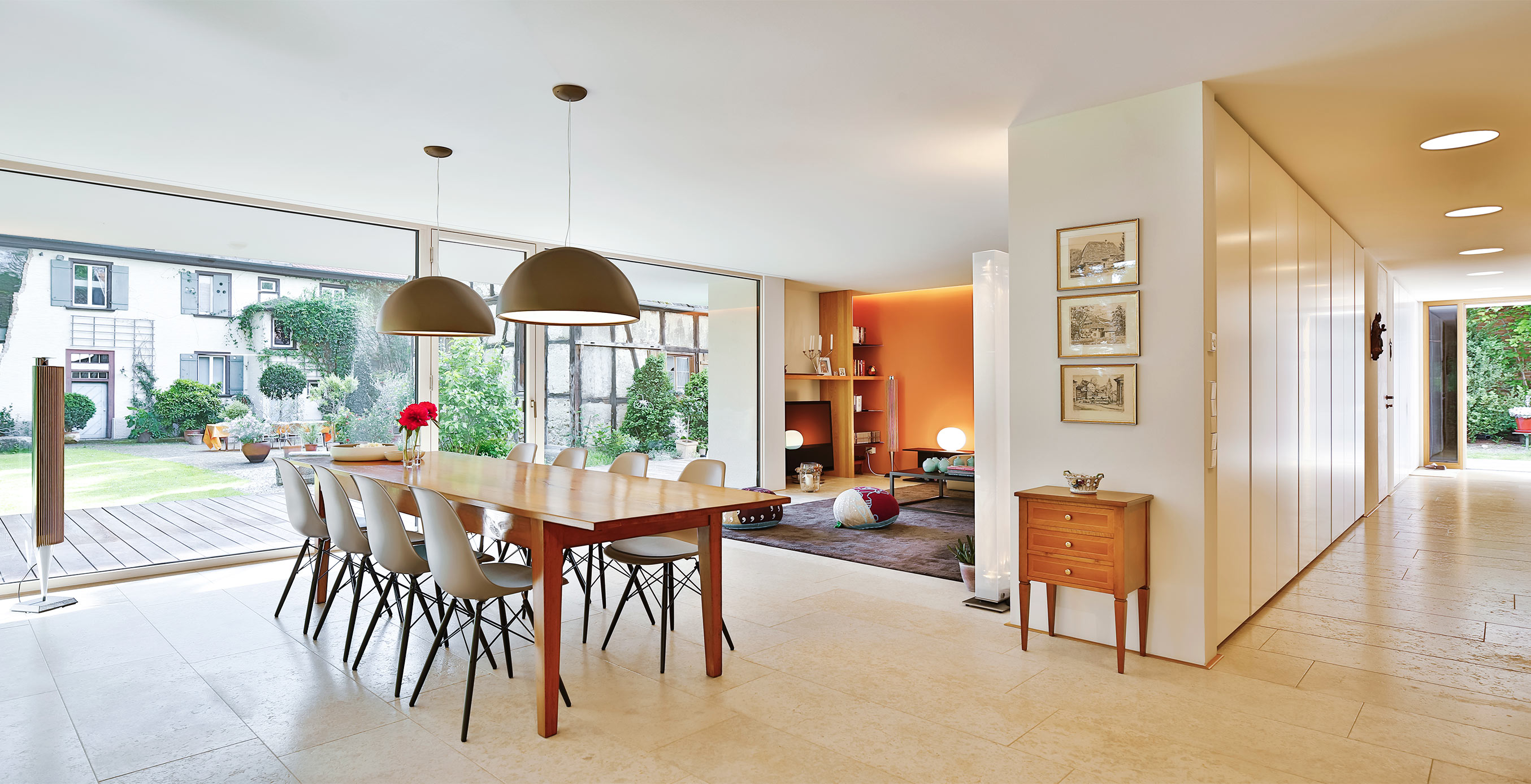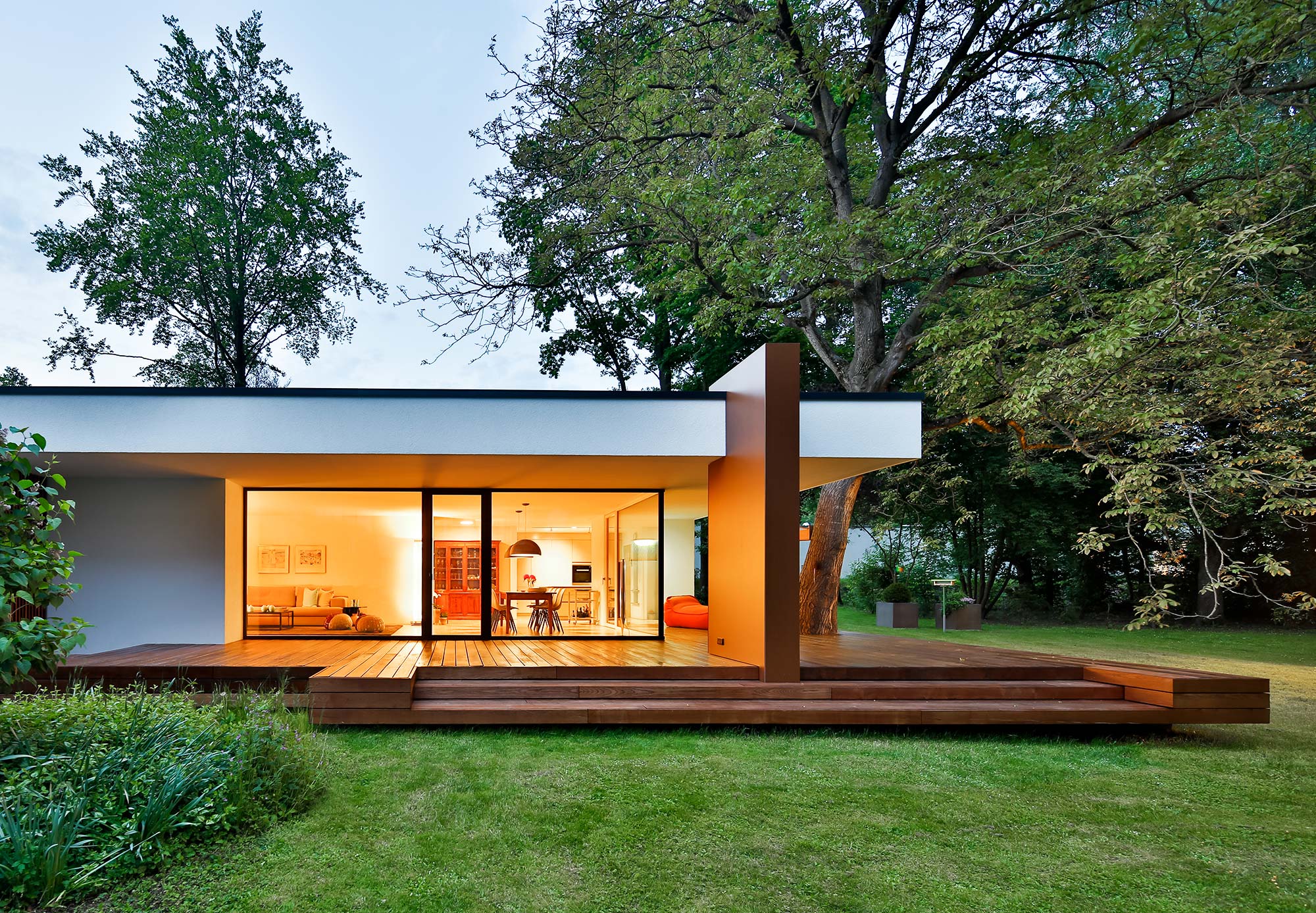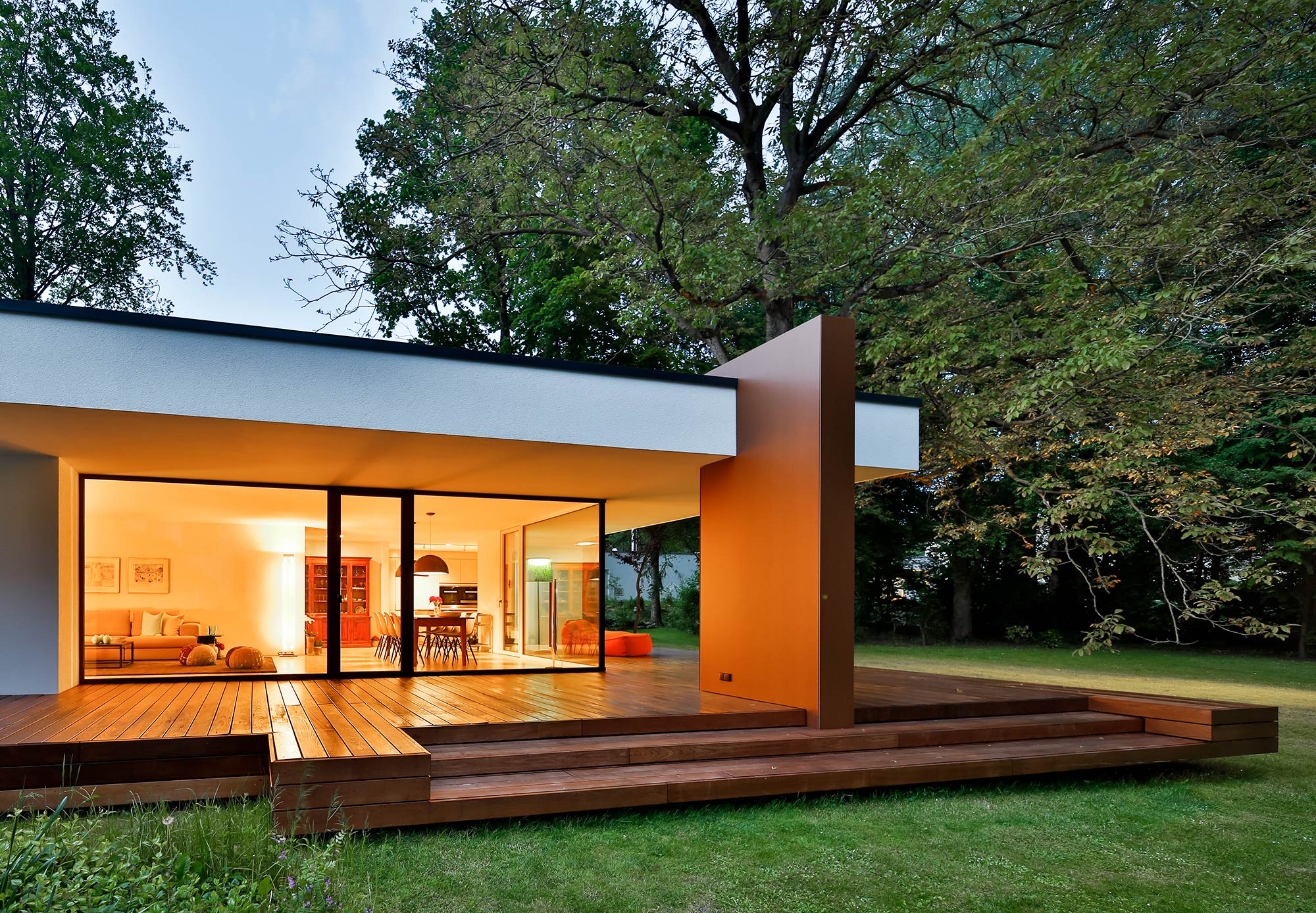 Die filigrane Verglasung im Esszimmer wurde so weit eingerückt, dass ein weitläufiger, überdachter Zwischenbereich auf einer feinen Eschenholzterrasse entsteht. Der weite Überstand der Decke macht einen zusätzlichen Sonnenschutz überflüssig – somit bleibt der Blick in den Garten frei und die Jahreszeiten erlebbar.