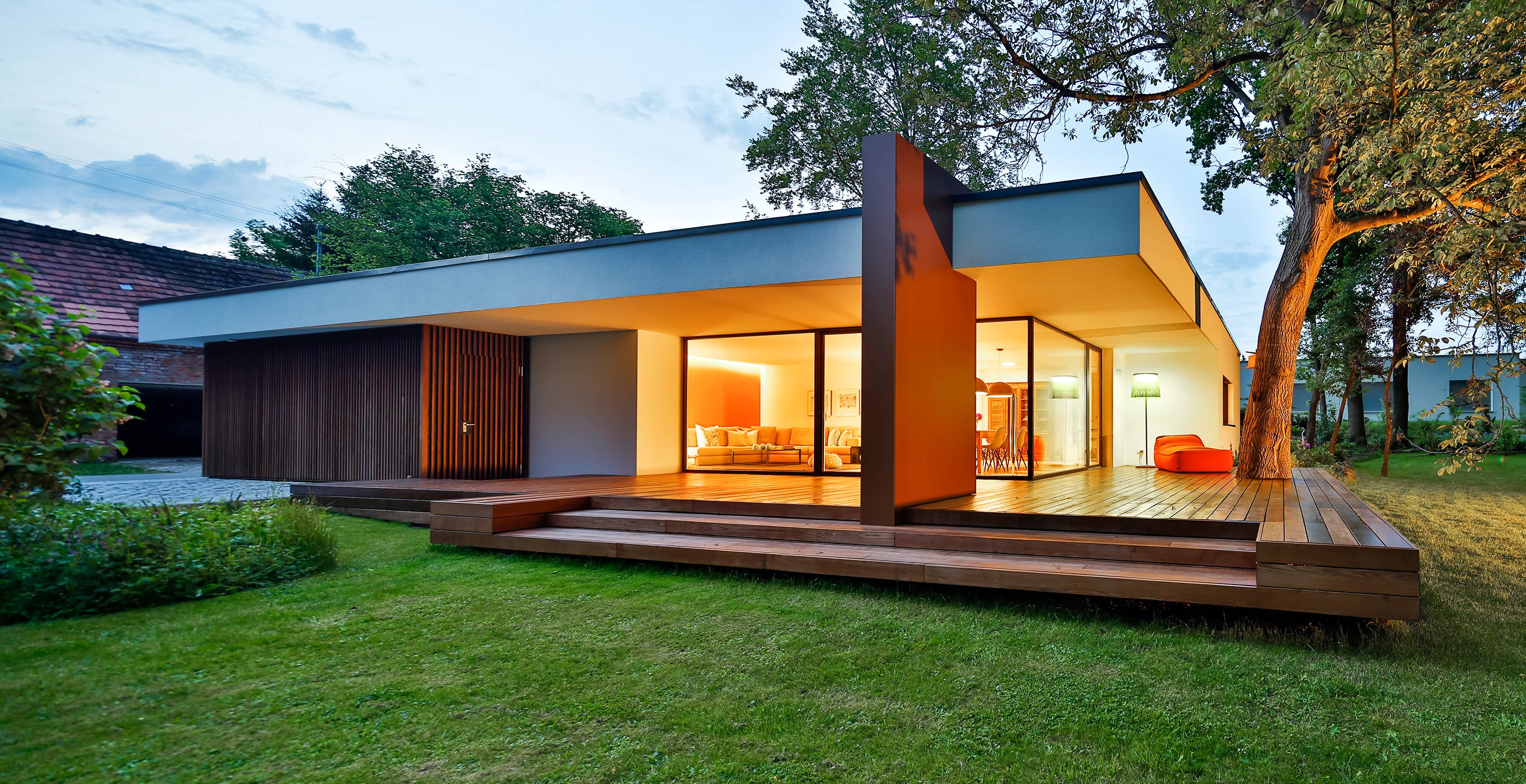 Als klassisches Satteldach streckt sich der Hauptbaukörper über die Breite des Grundstücks und fängt auf der Gartenseite Ausblicke und Licht ein. Für zahlreiche Aufenthalte mit dem Garten wurde ein aufwendiger Außensitzplatz geschaffen, der mit einer verglasten Öffnung nach oben und einer integrierten Beschattung viele Möglichkeiten der Steuerung erlaubt und für die dunkle Jahreszeit ermöglicht, dass auch die dahinter liegenden Räume genügend Tageslicht erhalten.