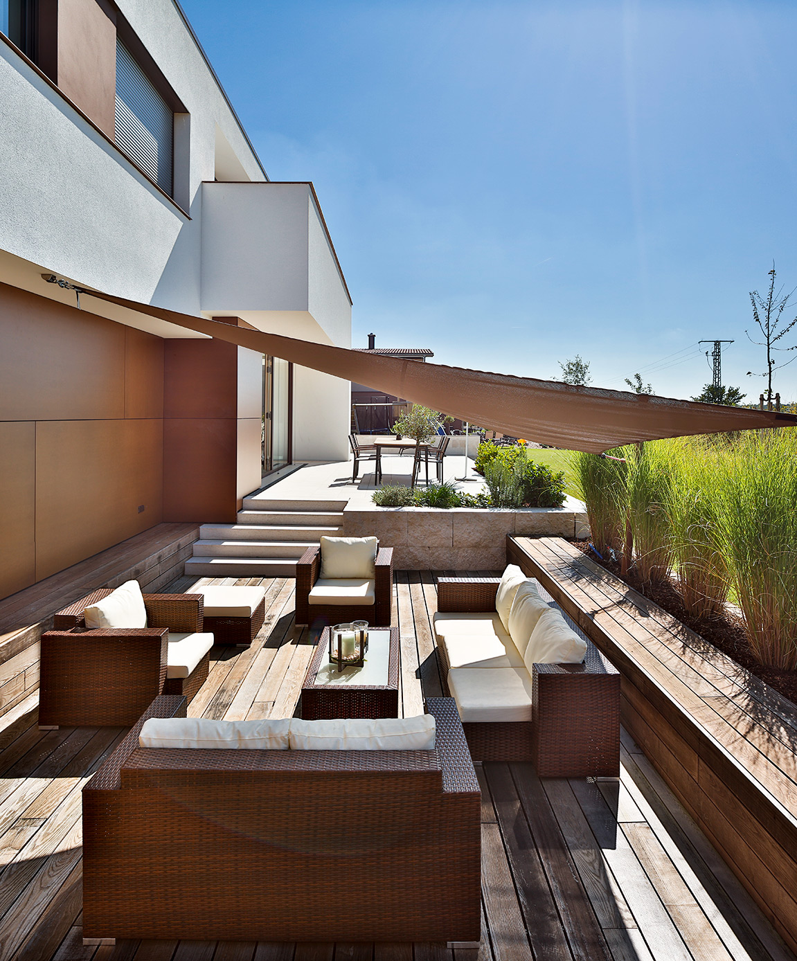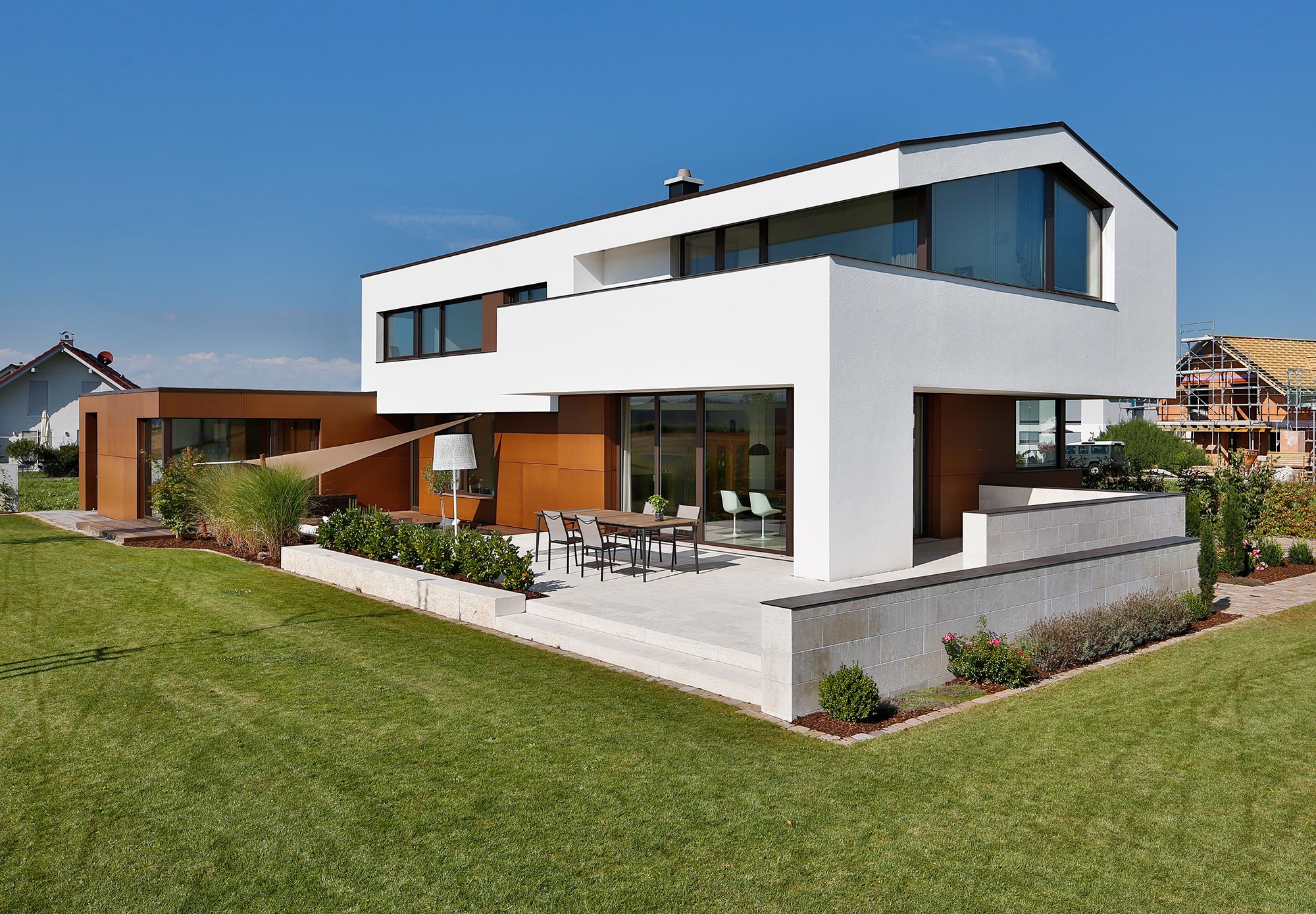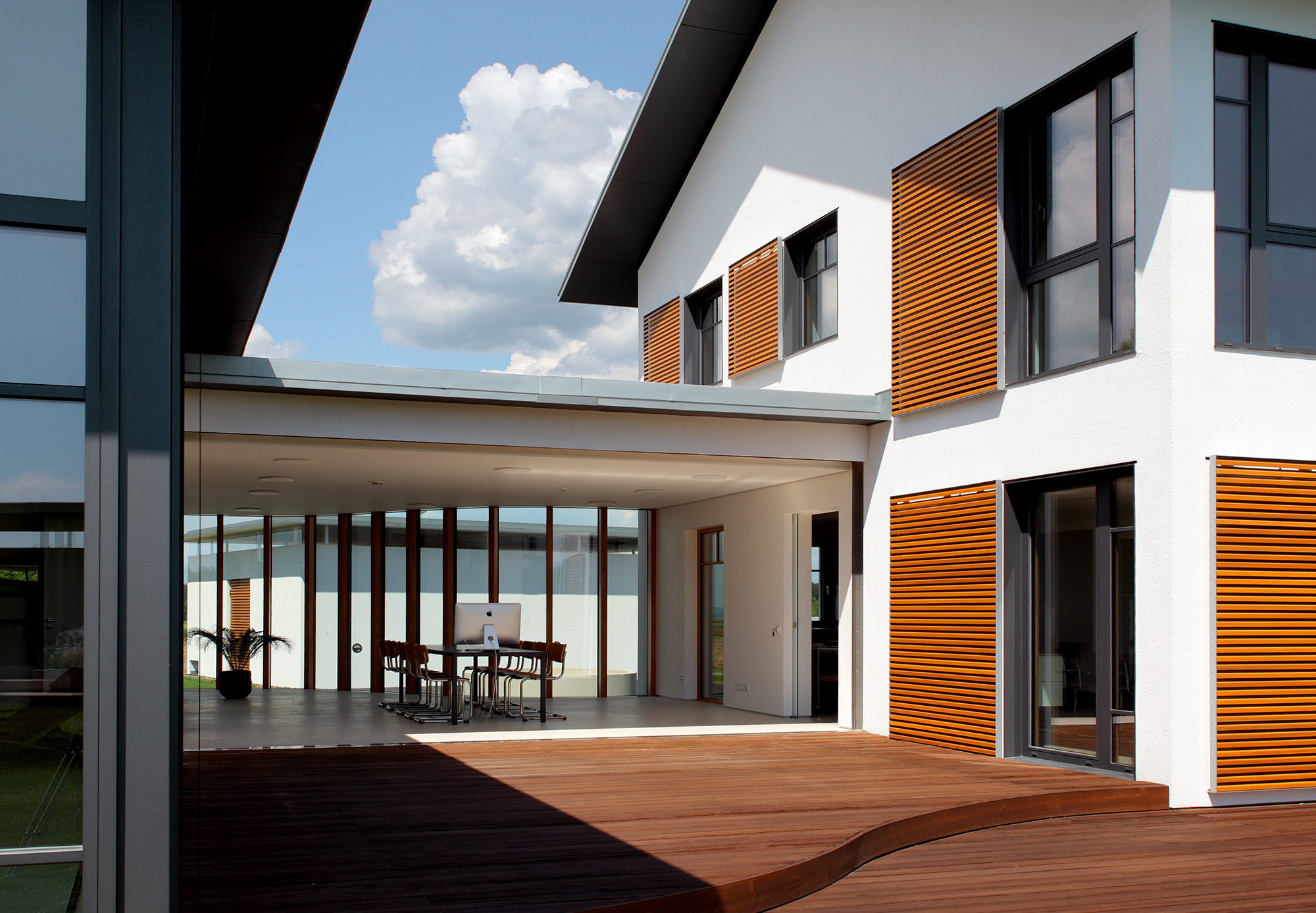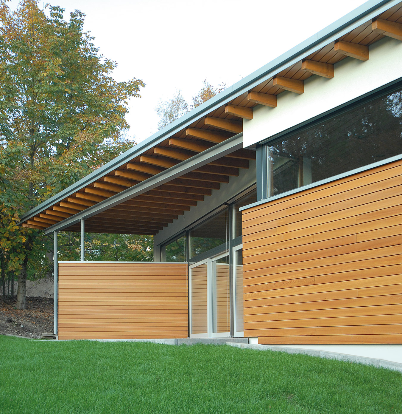 Am Ende des Baukörpers ergibt sich durch den großzügigen Rücksprung ein überdachter Sitzplatz mit Mittagsschatten und Abendsonne.
