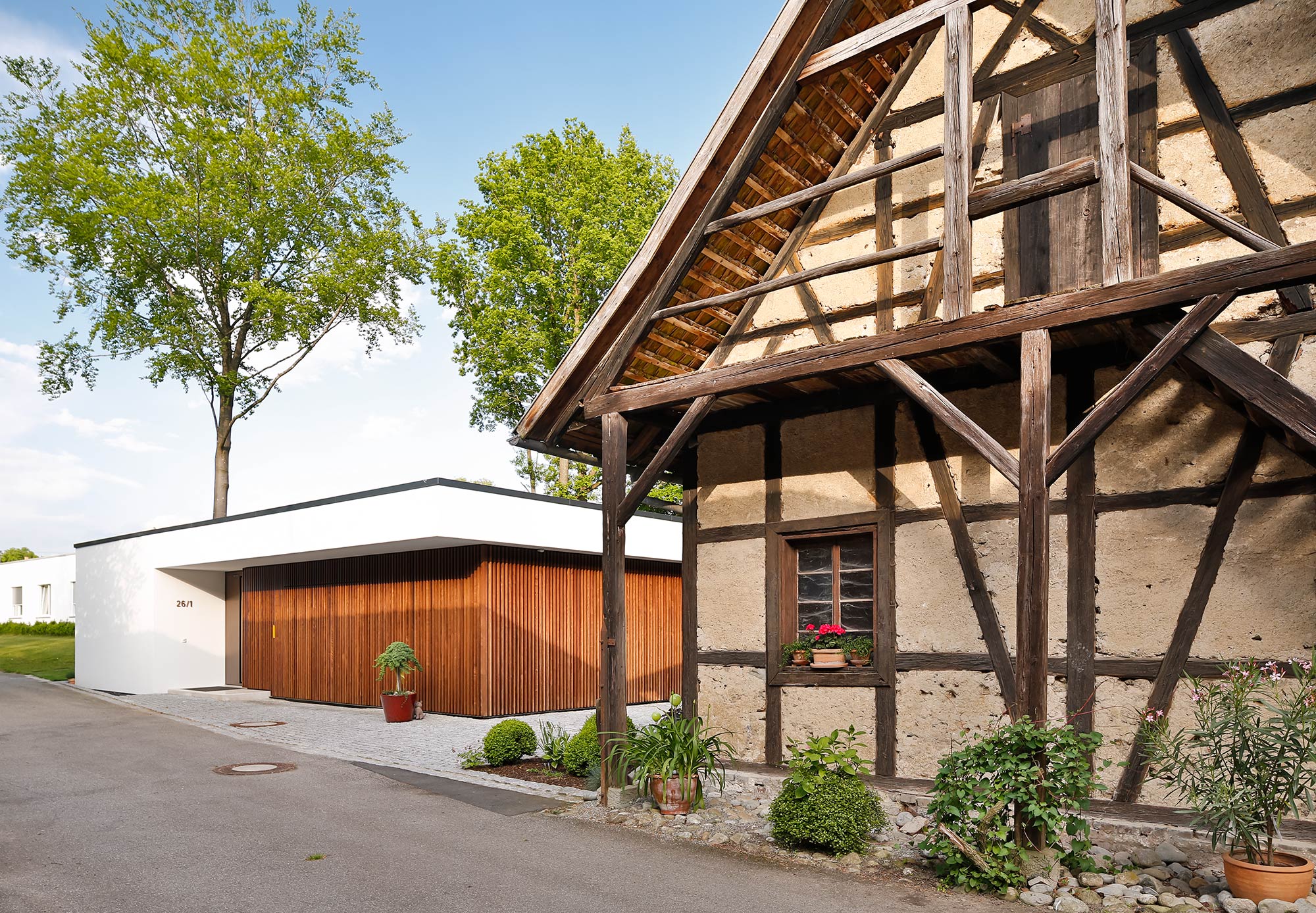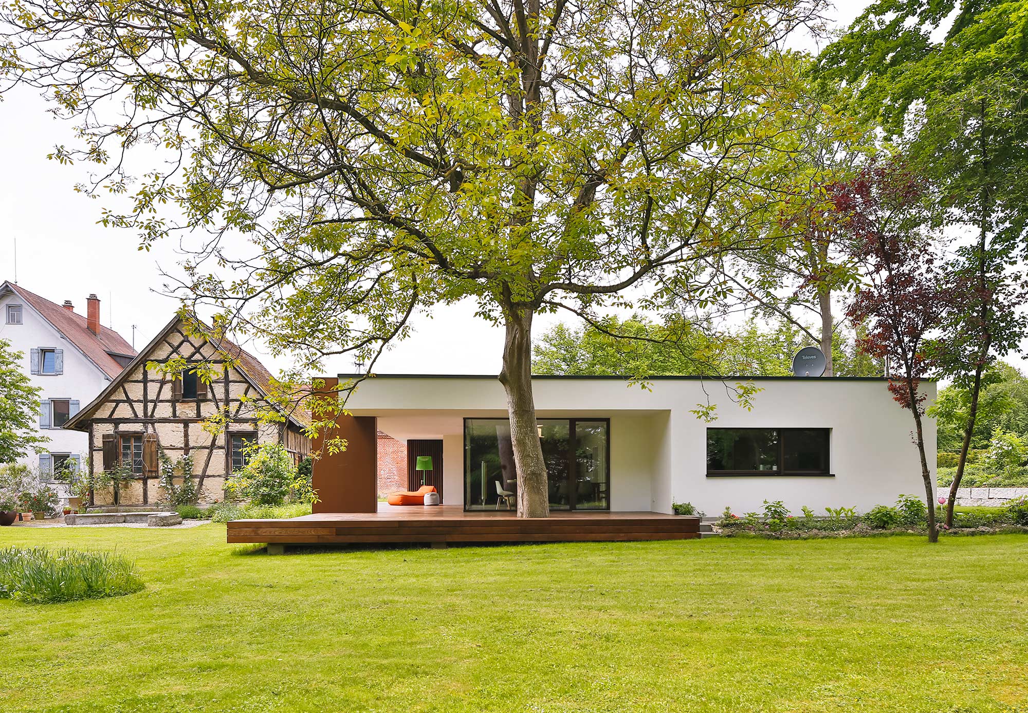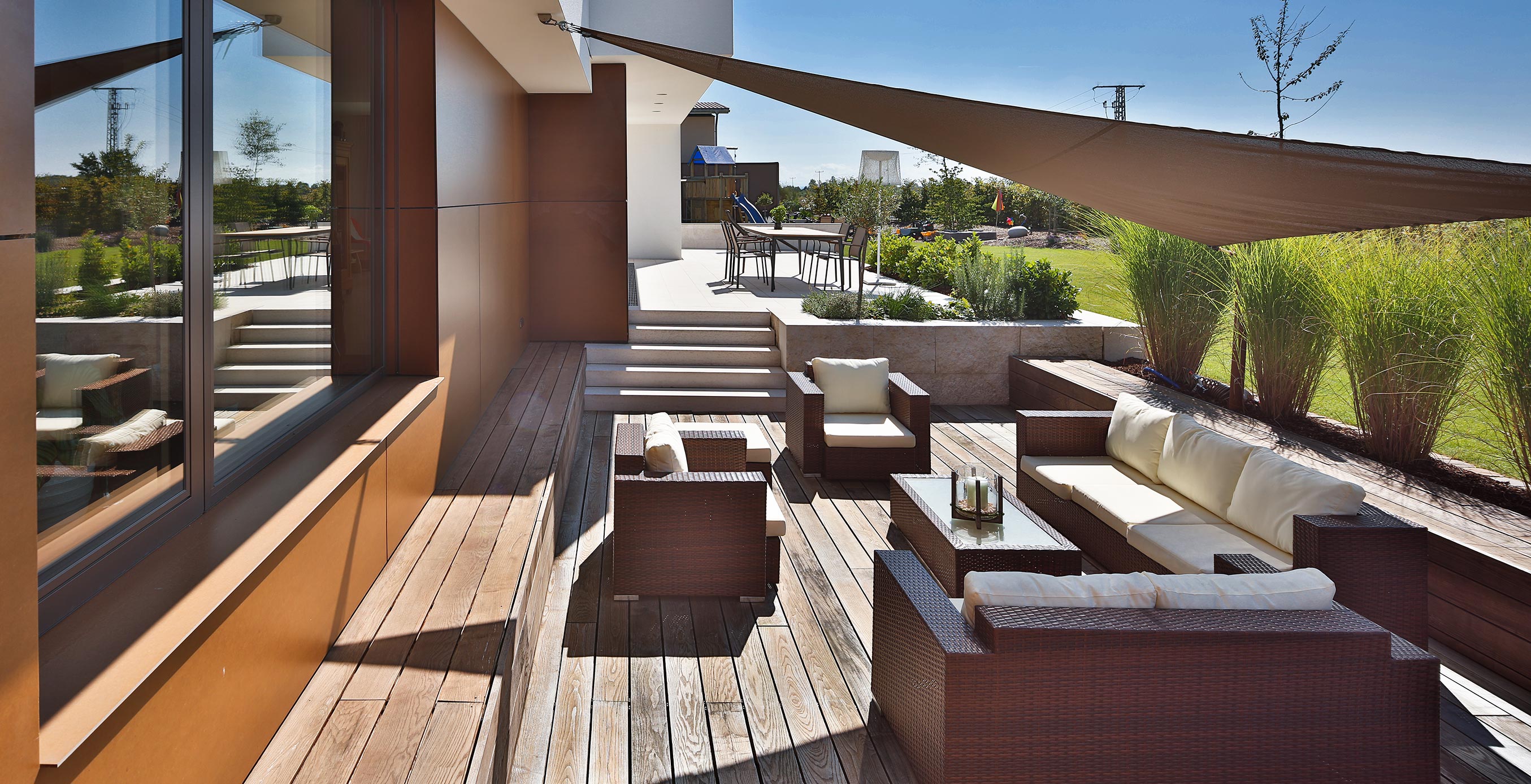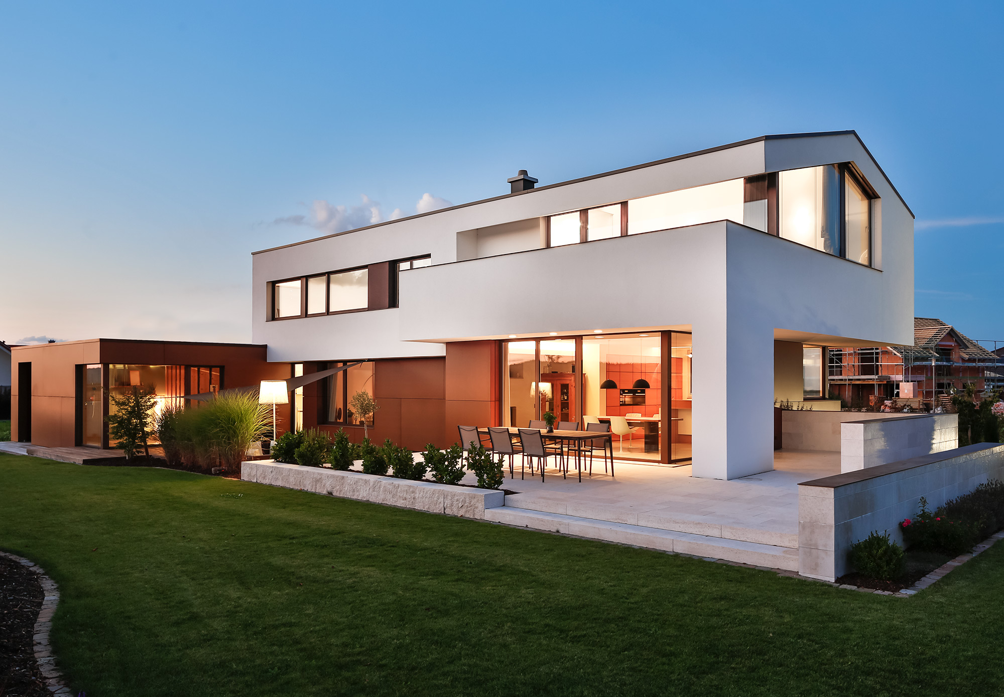 Am Ende des Baukörpers ergibt sich durch den großzügigen Rücksprung ein überdachter Sitzplatz mit Mittagsschatten und Abendsonne.