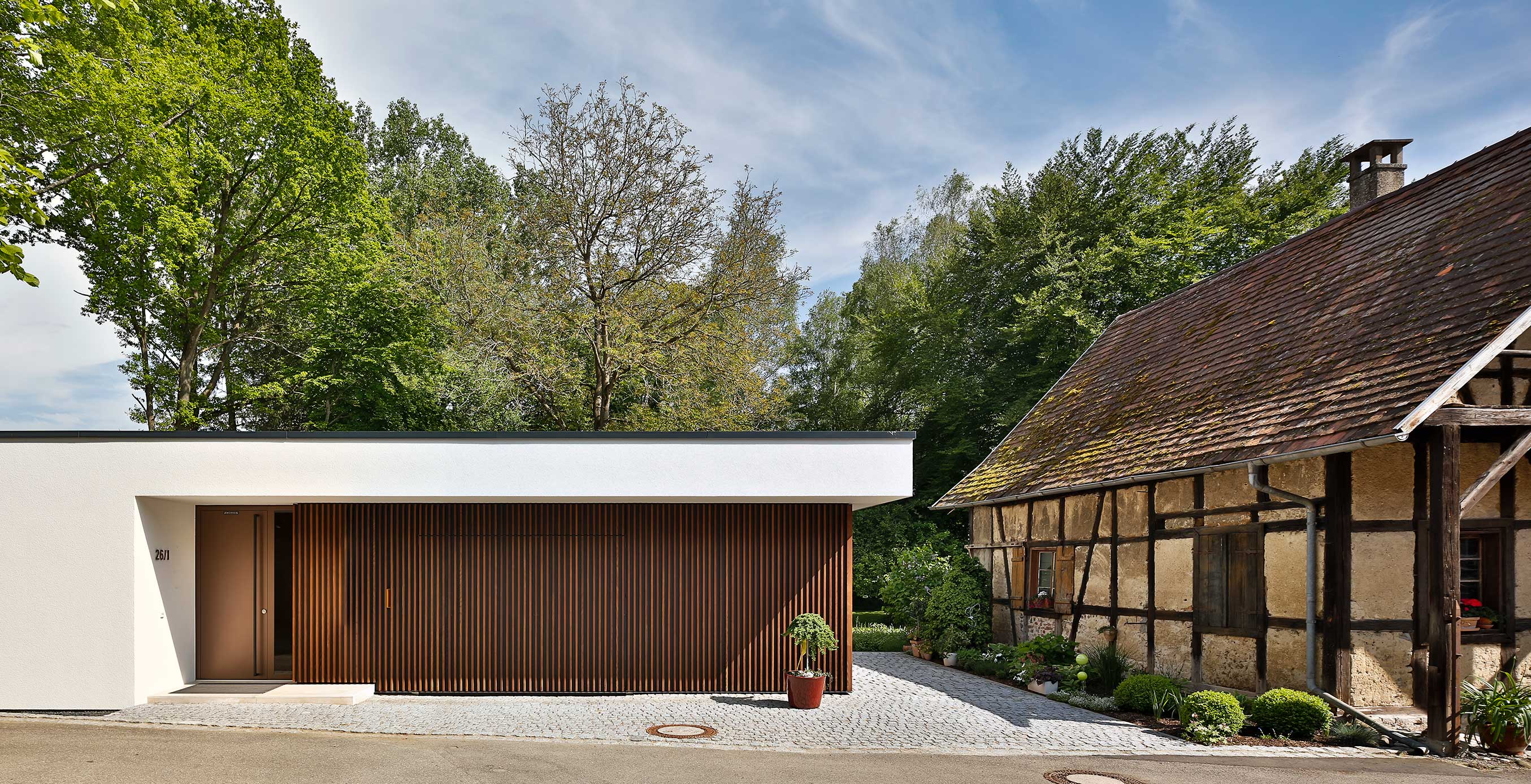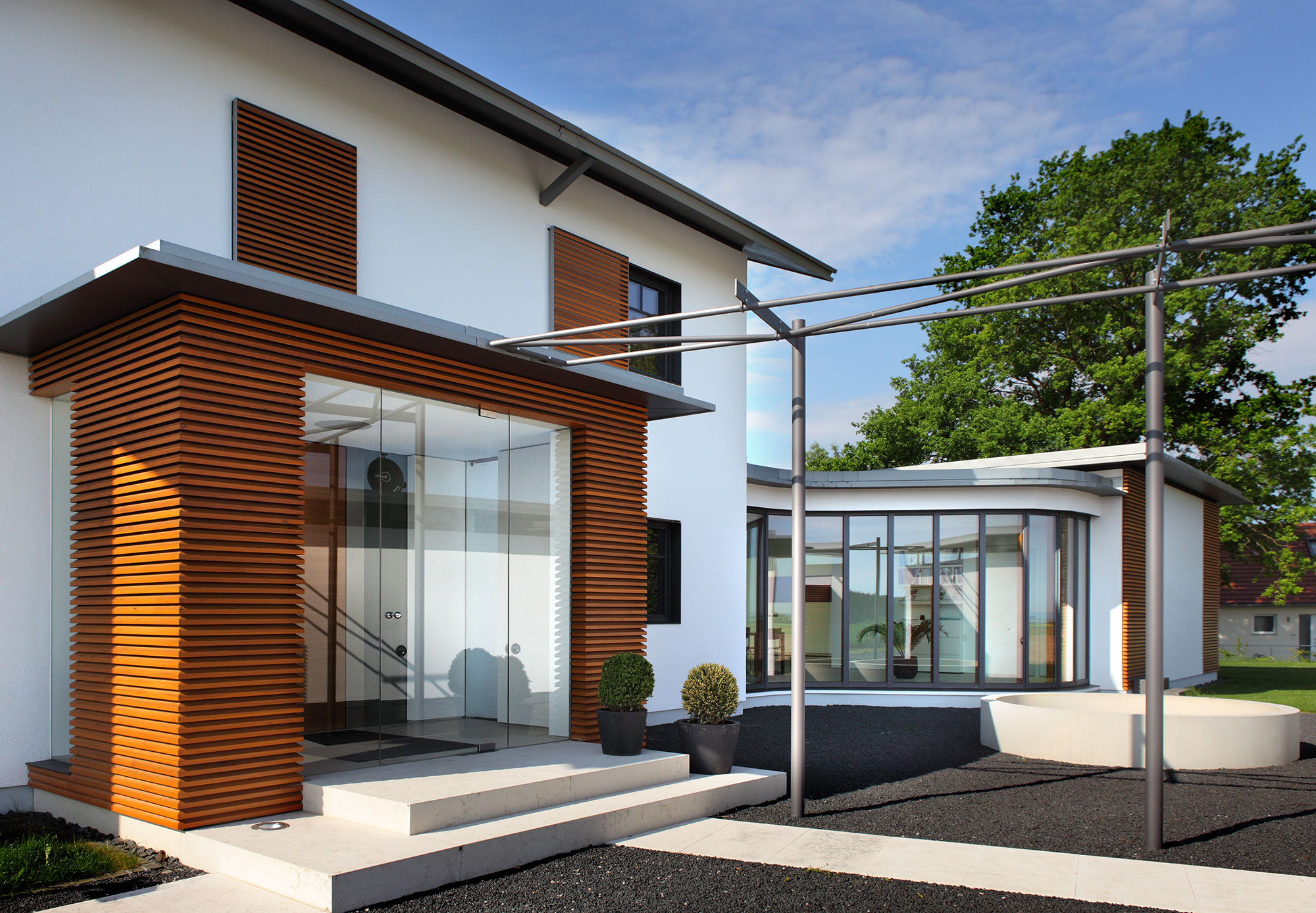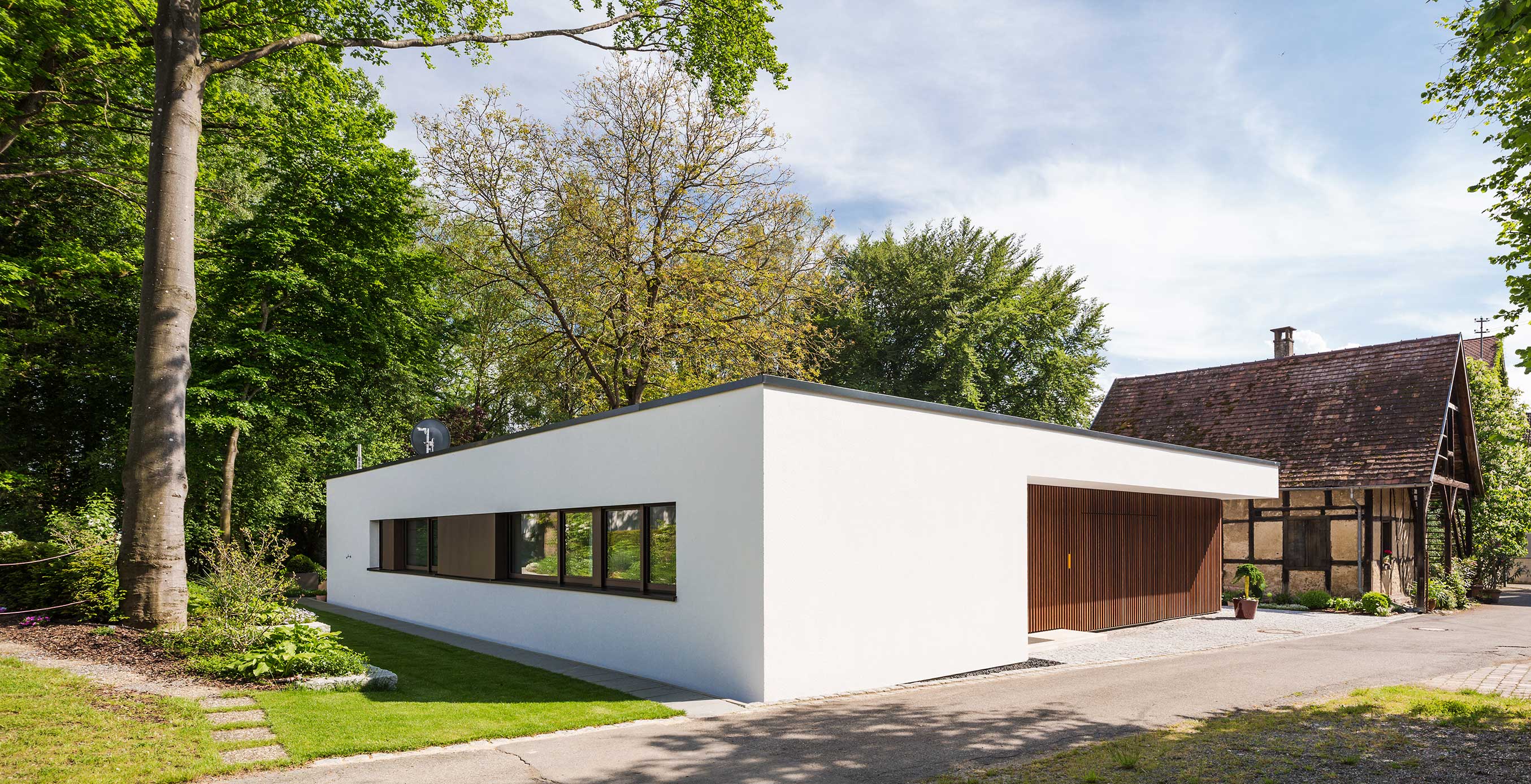 In der Tradition des Altenteils wurde ein kleines Bauwerk in ein parkähnliches Grundstück eingebettet. Auf der Eingangsseite wird durch Lamellen aus heimischem Eschenholz die Fassade gegliedert, auch das Garagentor versteckt sich hinter dieser Fassade.