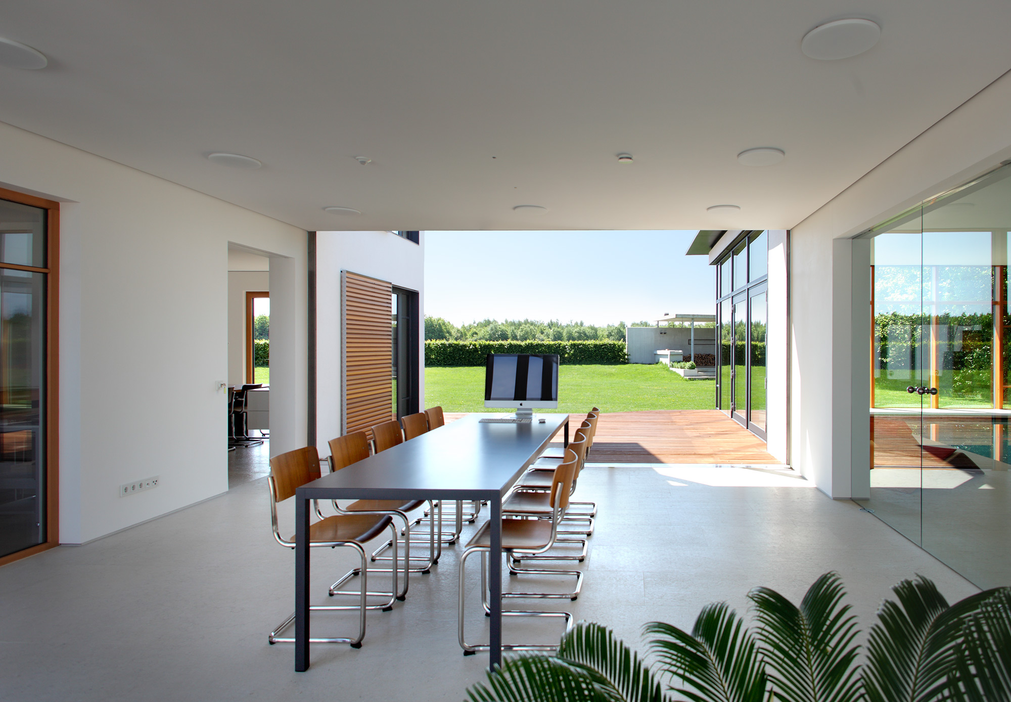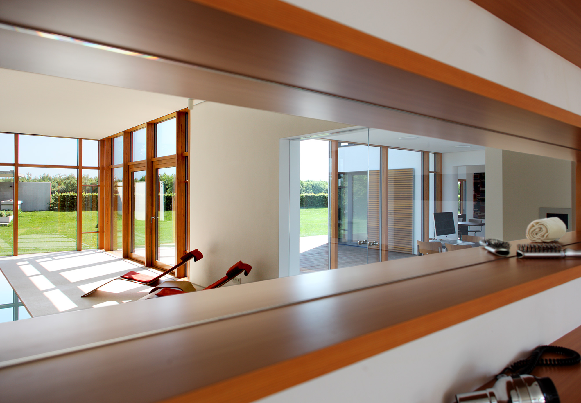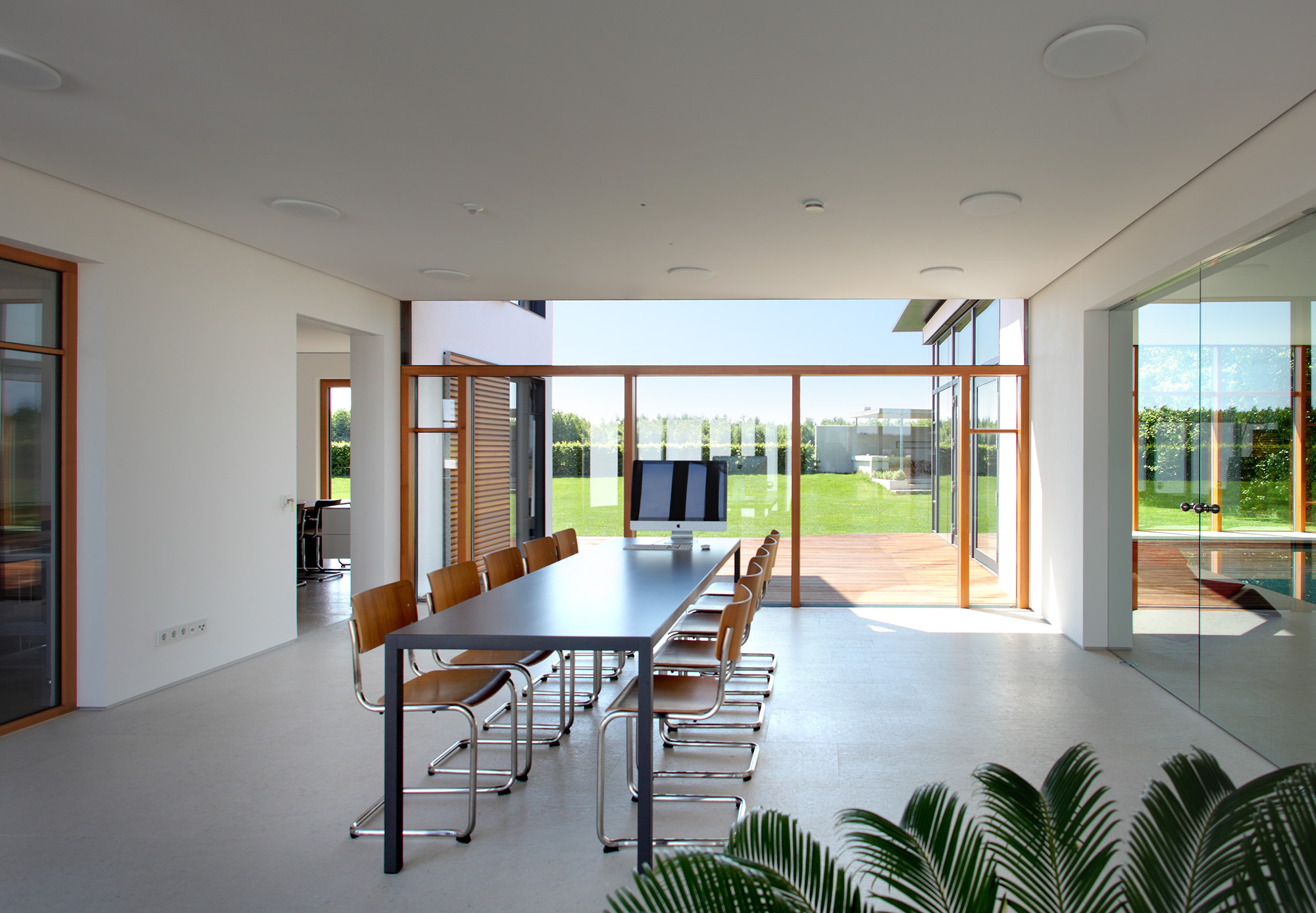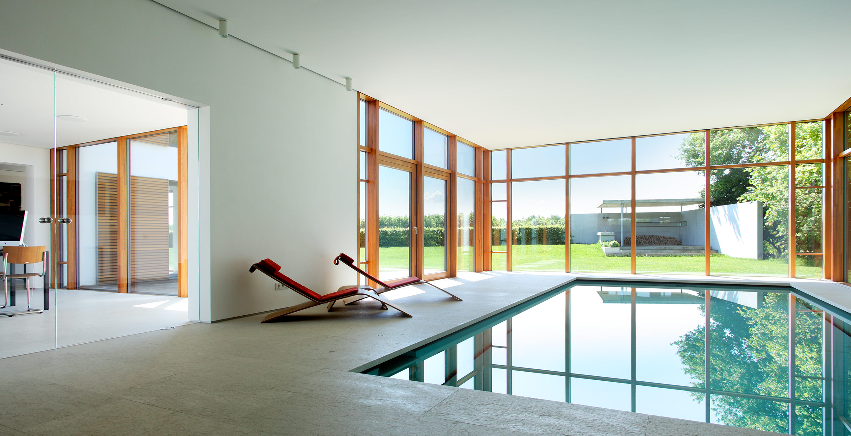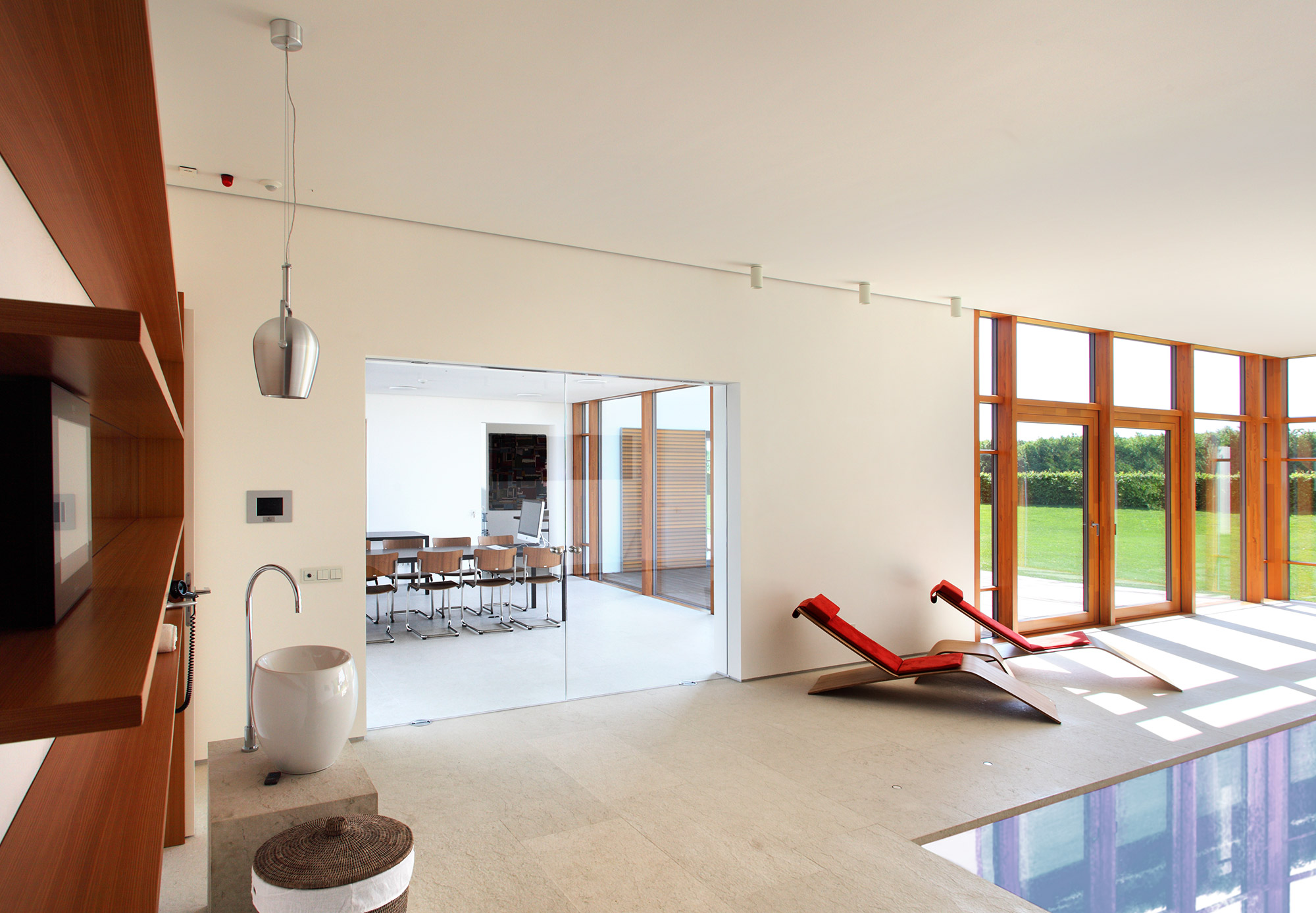 Im Innenraum offenbart sich ein klassischer Innenausbau nach bester Handwerkskunst und ein sorgsam abgestimmtes Farb- und Materialkonzept. Nichts ist zufällig, alles hat eine tiefere Bedeutung. Liebe zum Detail in Verbindung mit ausgeklügelten technischen Lösungen sorgt für Raffinesse. Gemeinsam mit dem wohldurchdachten Grundriss wird das Haus somit auch repräsentativen Anforderungen gerecht. Die Schwimmhalle kann dazu mit ihrem stufenlos verstellbaren Schwimmbadboden innerhalb weniger Minuten die Verwandlung vom Becken zum Veranstaltungsraum realisieren. Im Gartenzimmer kann eine gesamte Glasfront im Boden verschwinden und die Grenzen zwischen Innen- und Außenraum aufheben.