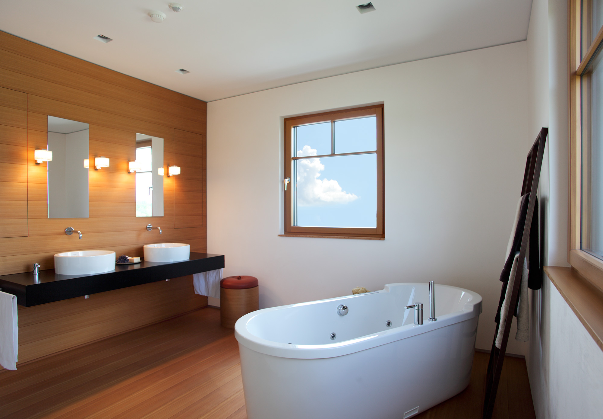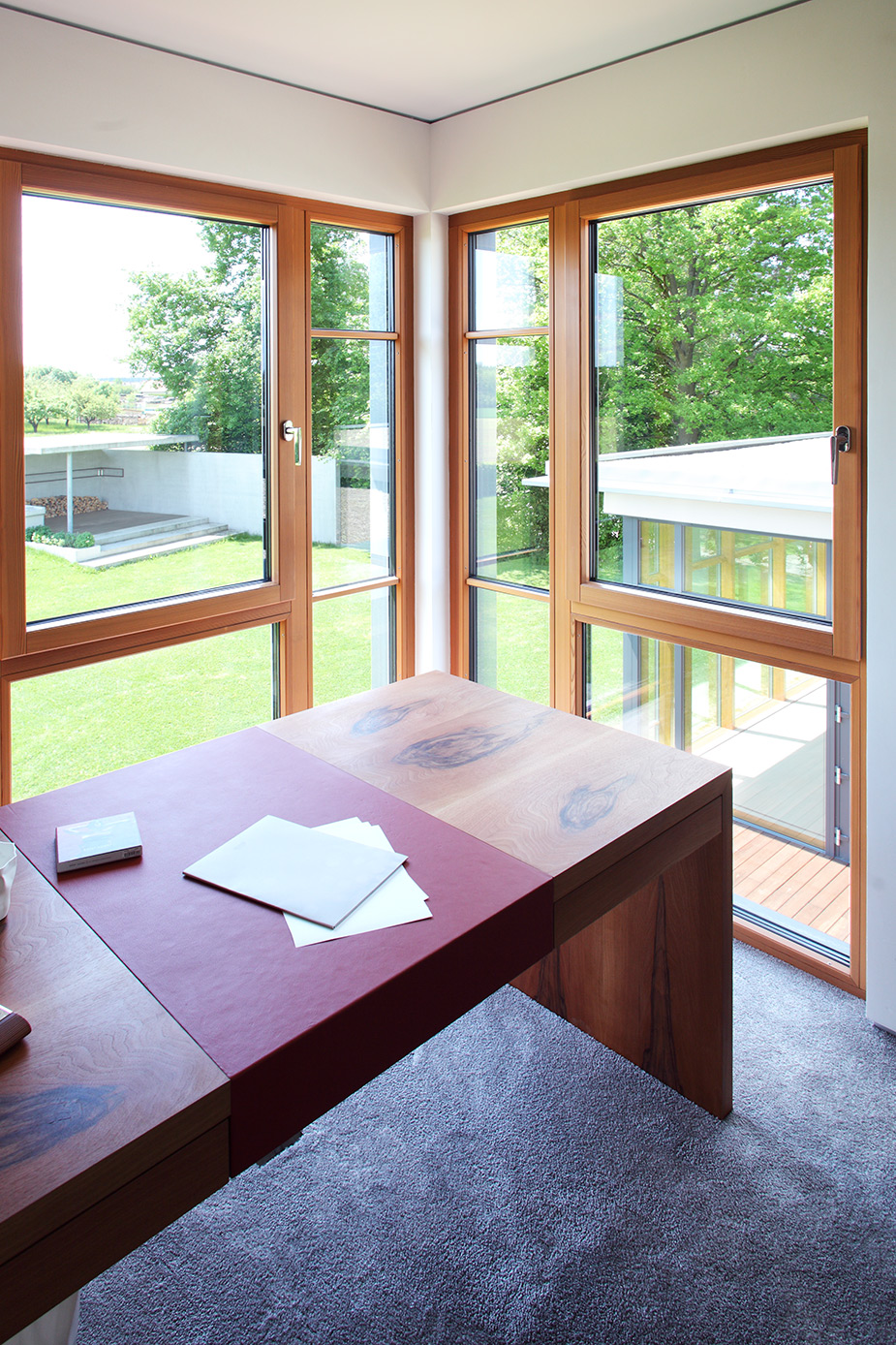 Durch sorgfältig geplante Öffnungen entstehen differenzierte Lichtsituationen und reizvolle Ausblicke in die großzügige Gartenlandschaft. Schiebetüren ermöglichen die freie Verbindung auf die Terrassen. Auch das Materialkonzept unterstützt die Verzahnung von Aussen- und Innenraum. Bestimmend hierbei ist heimisches Lärchenholz in höchster Güte. Durch strengste Auswahl und sorgfältige Verarbeitung nimmt es die klare Formensprache auf.