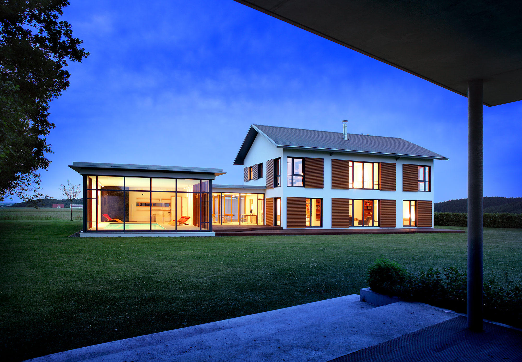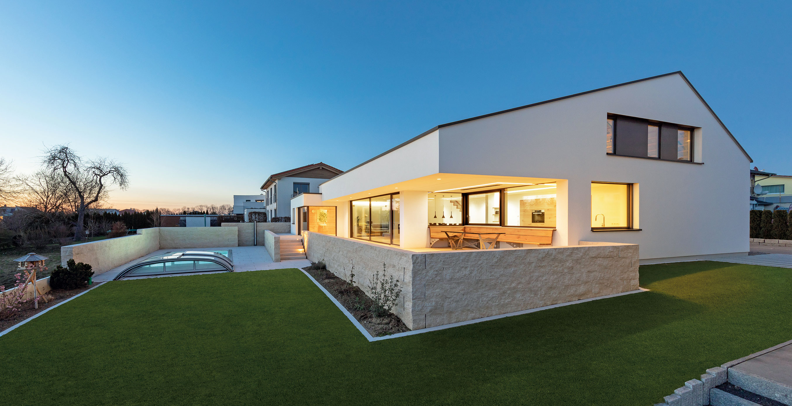 Die aufwändige Beleuchtung in Garten, Schwimmhalle und Becken schafft dazu den passenden Rahmen. Der Entwurf stammt von der architekturwerkstatt infra plan um Uli Lingemann.