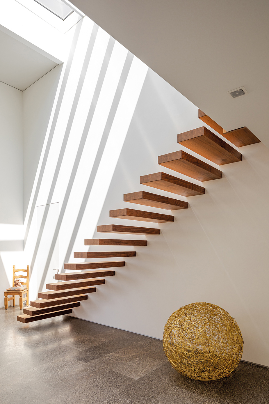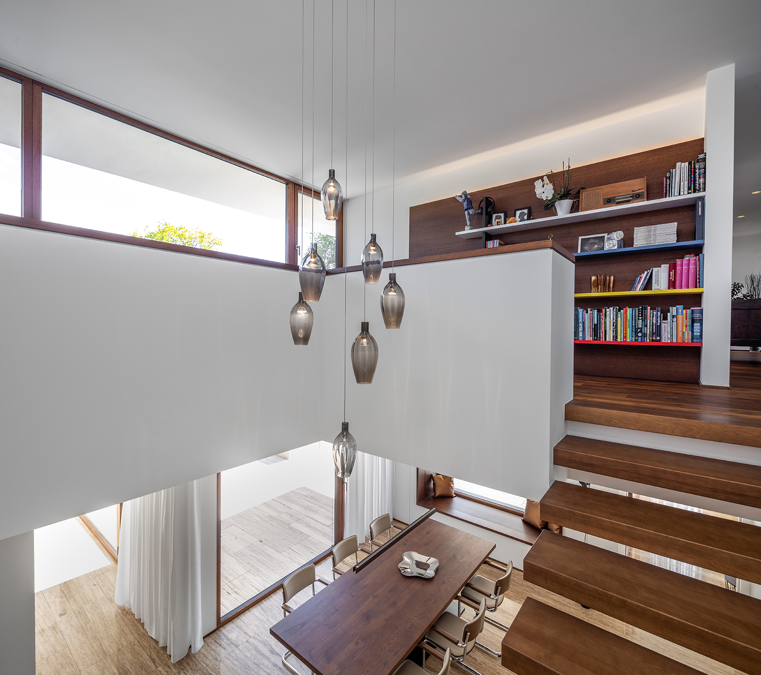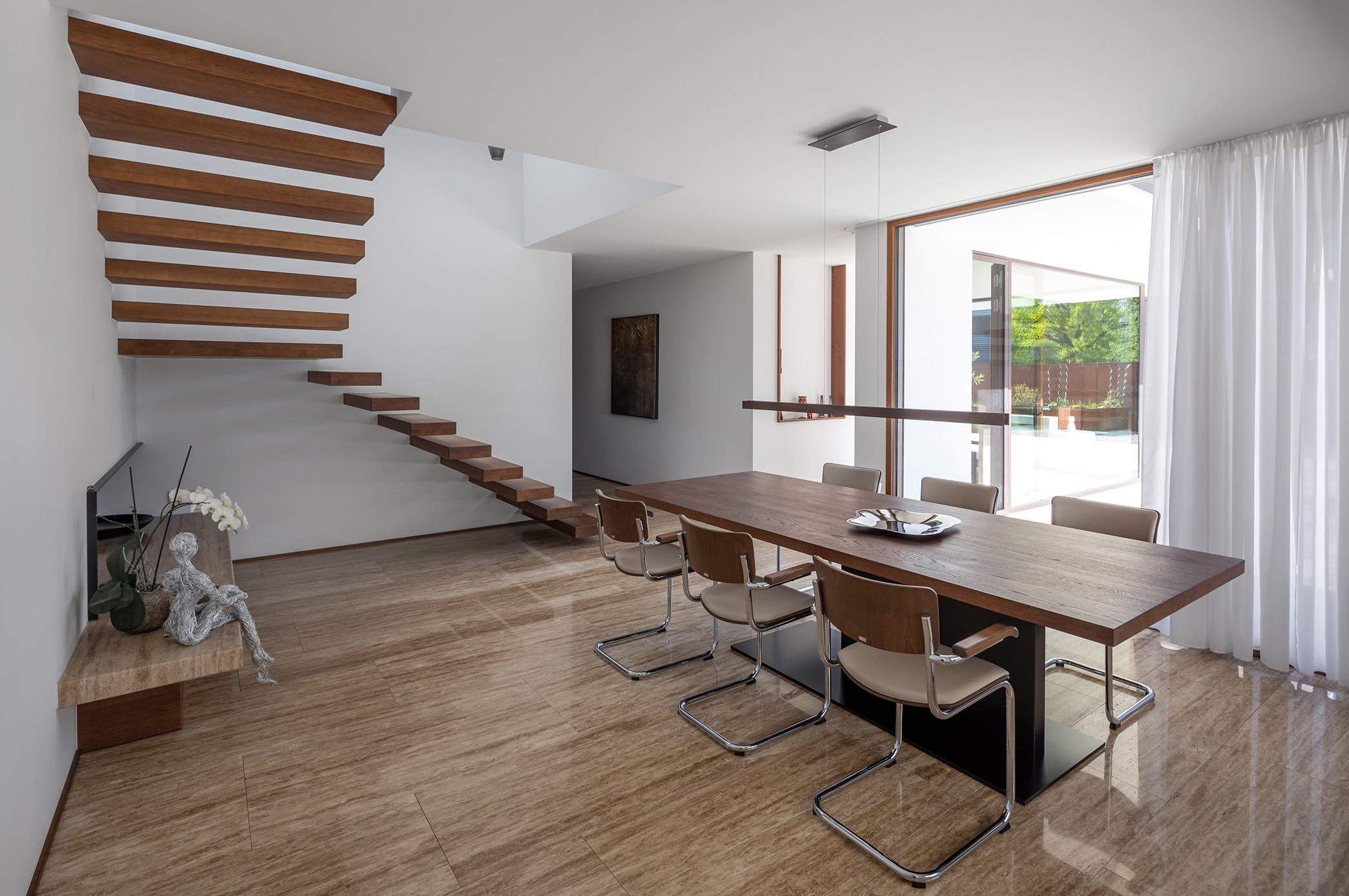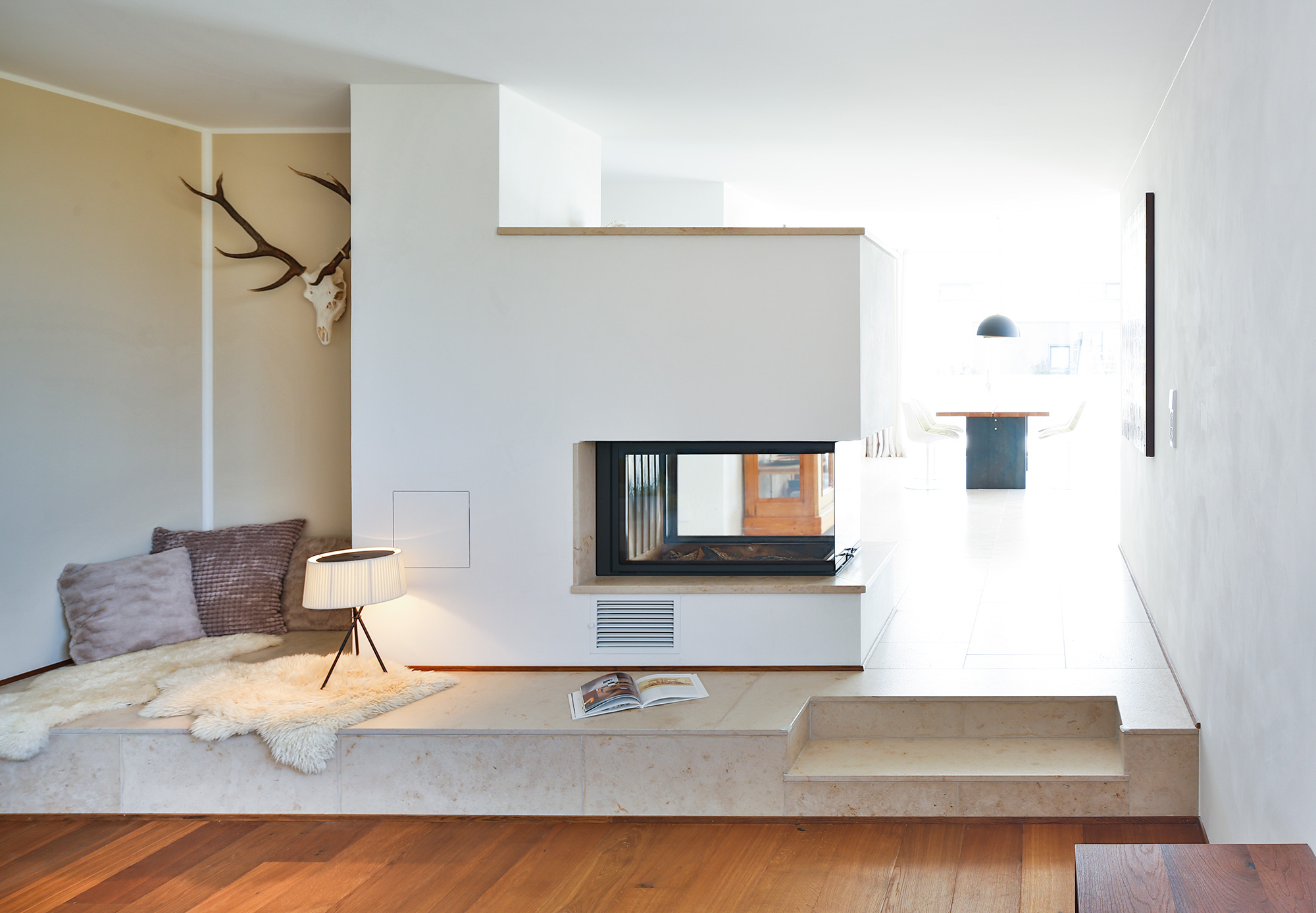 Im Zentrum des Baukörpers wurde das Esszimmer mit dem weitenden Luftraum und der frei auskragender Treppe angelegt, darunter findet ein eingebauter Kamin seinen Platz