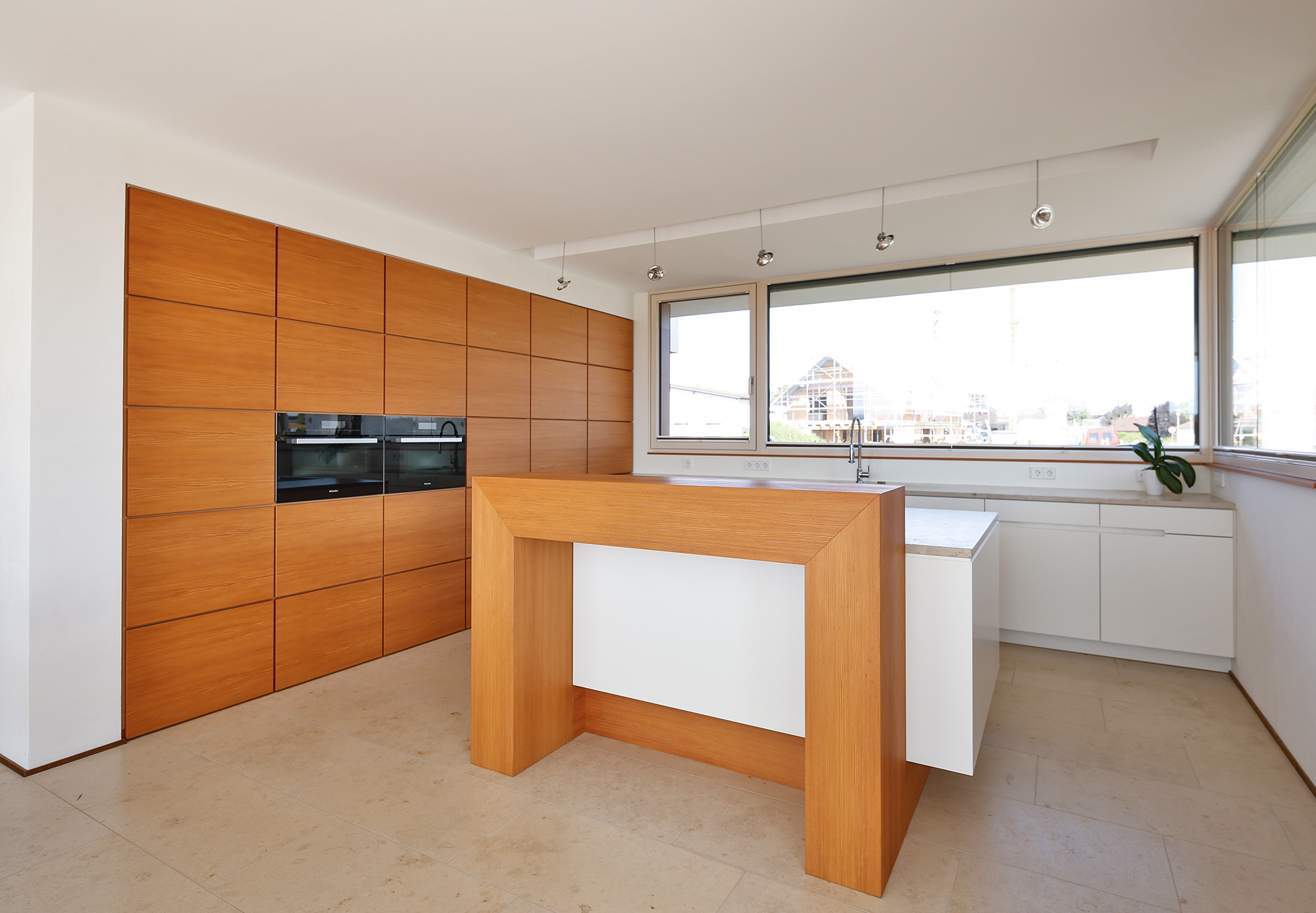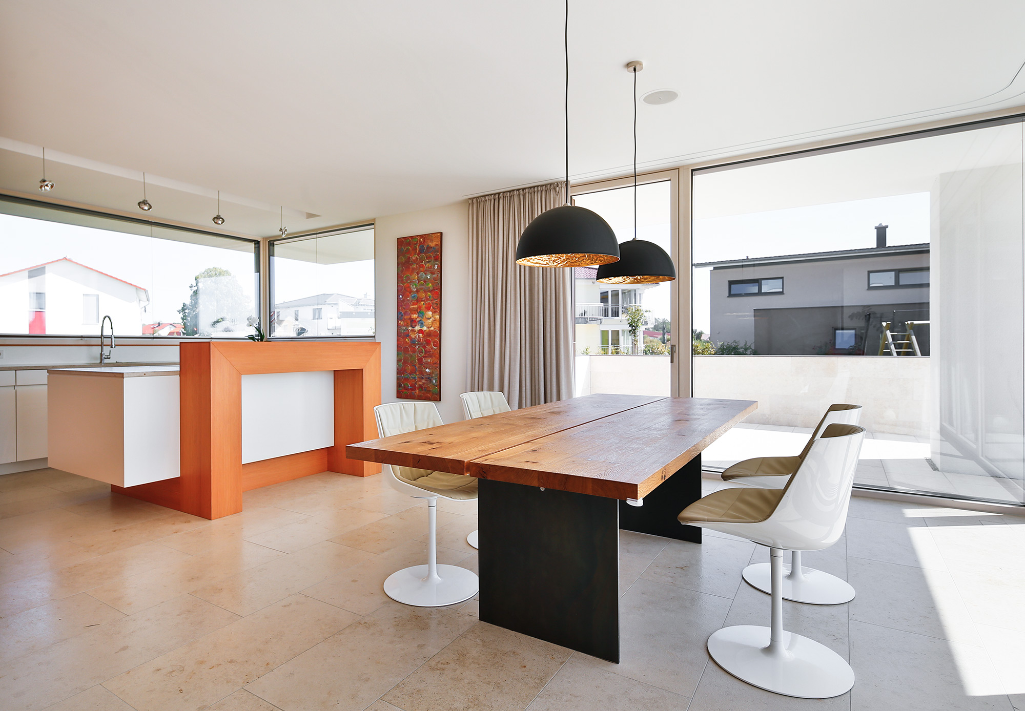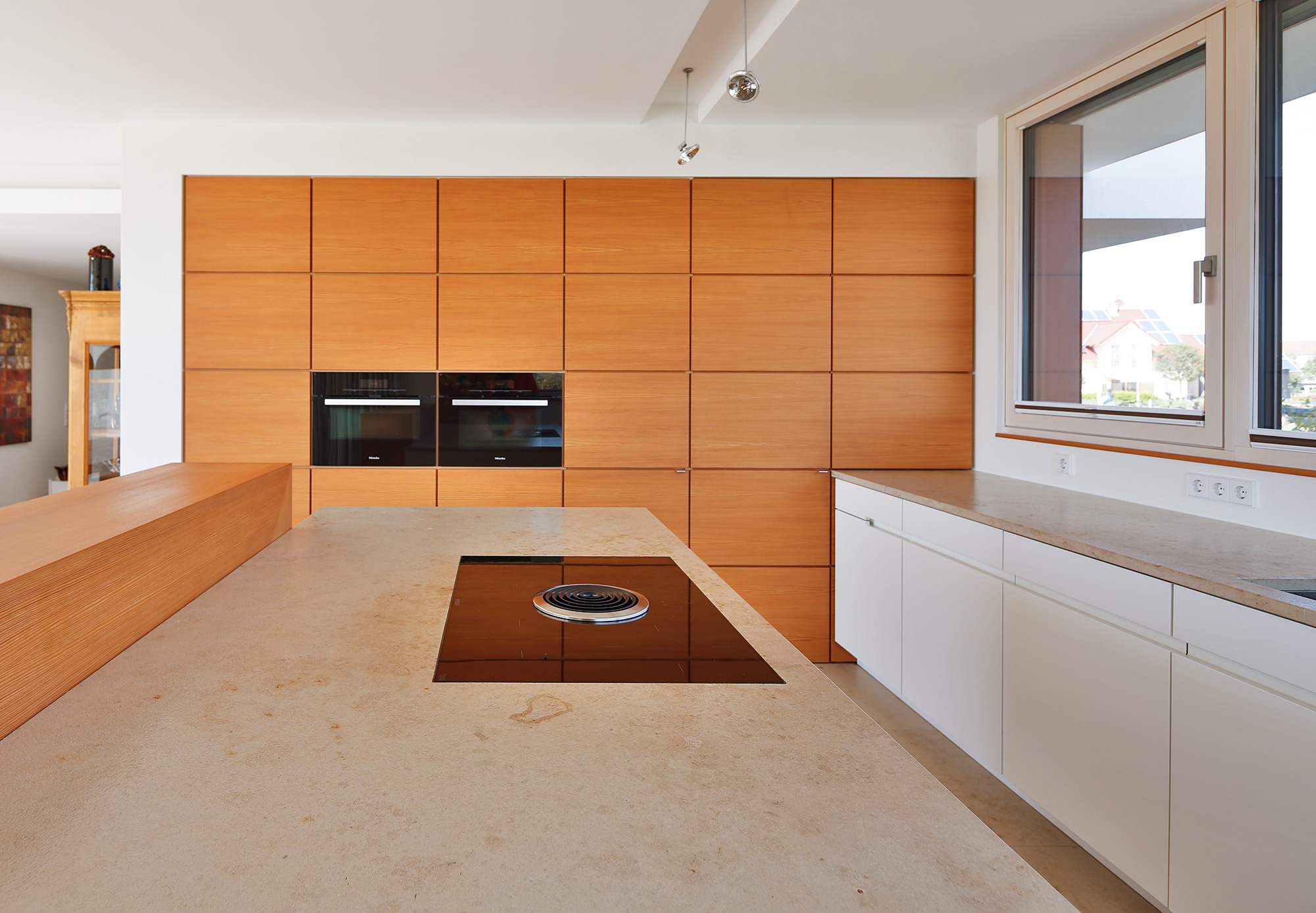 Die Küche wurde wie ein leichter Pavillon zur Straße hin neben den Hauptbaukörper gesetzt und genießt so den Sonnenstand vom Aufgang bis zum Untergang,