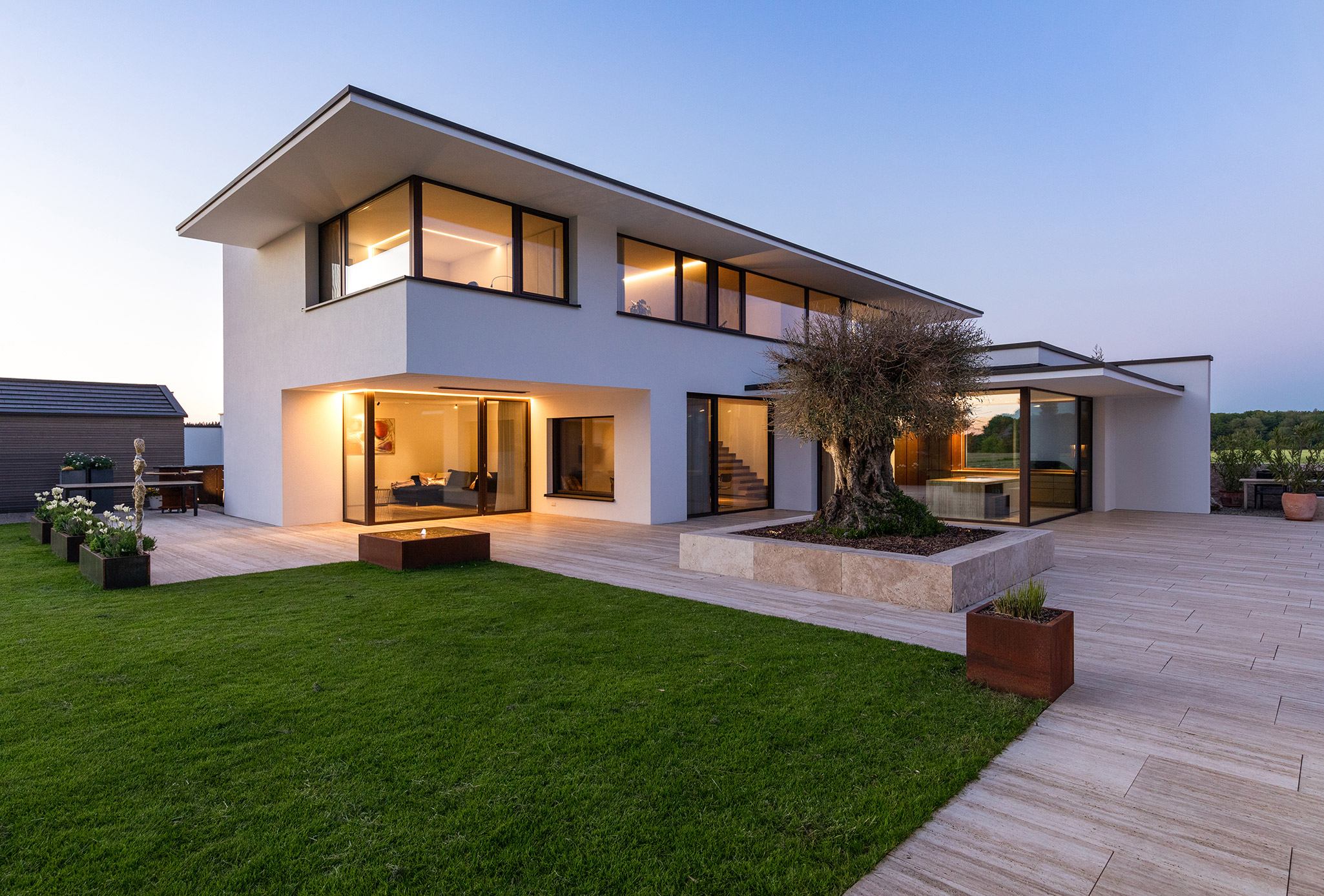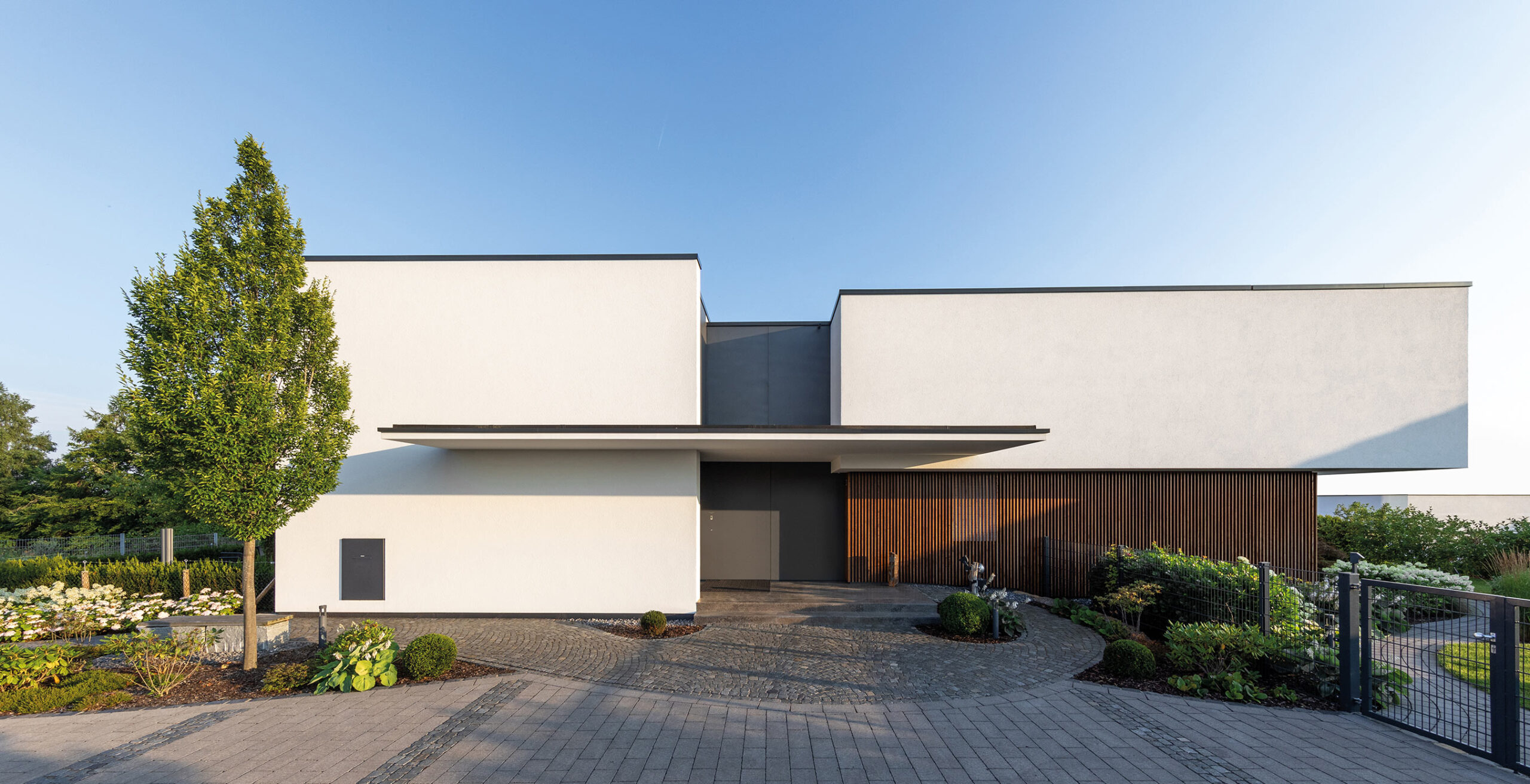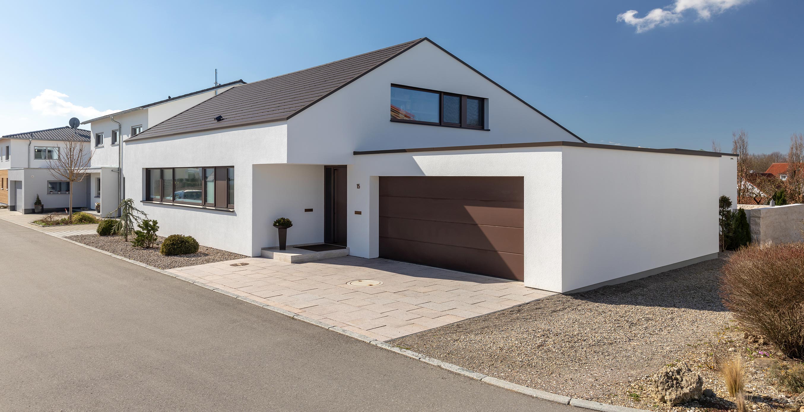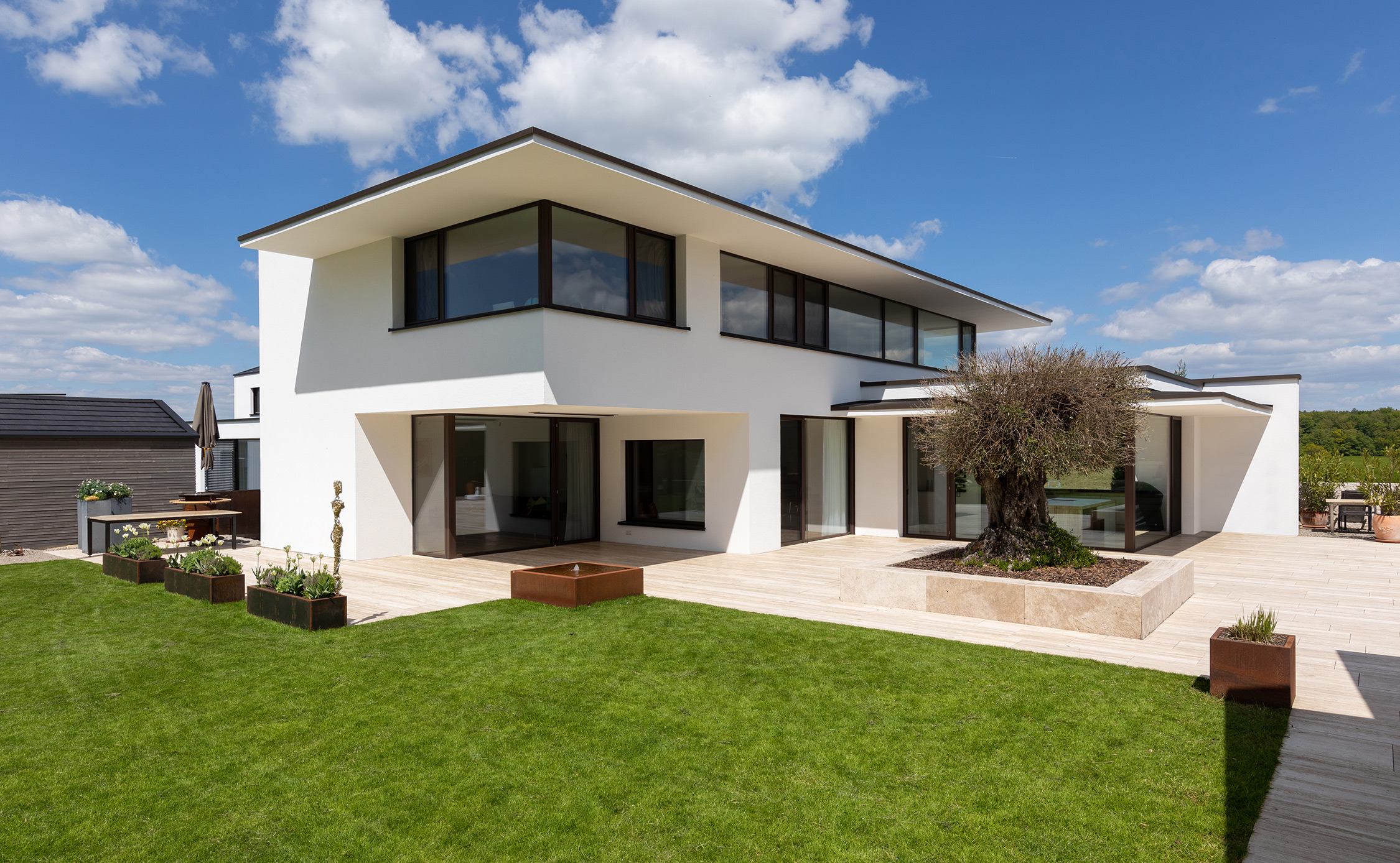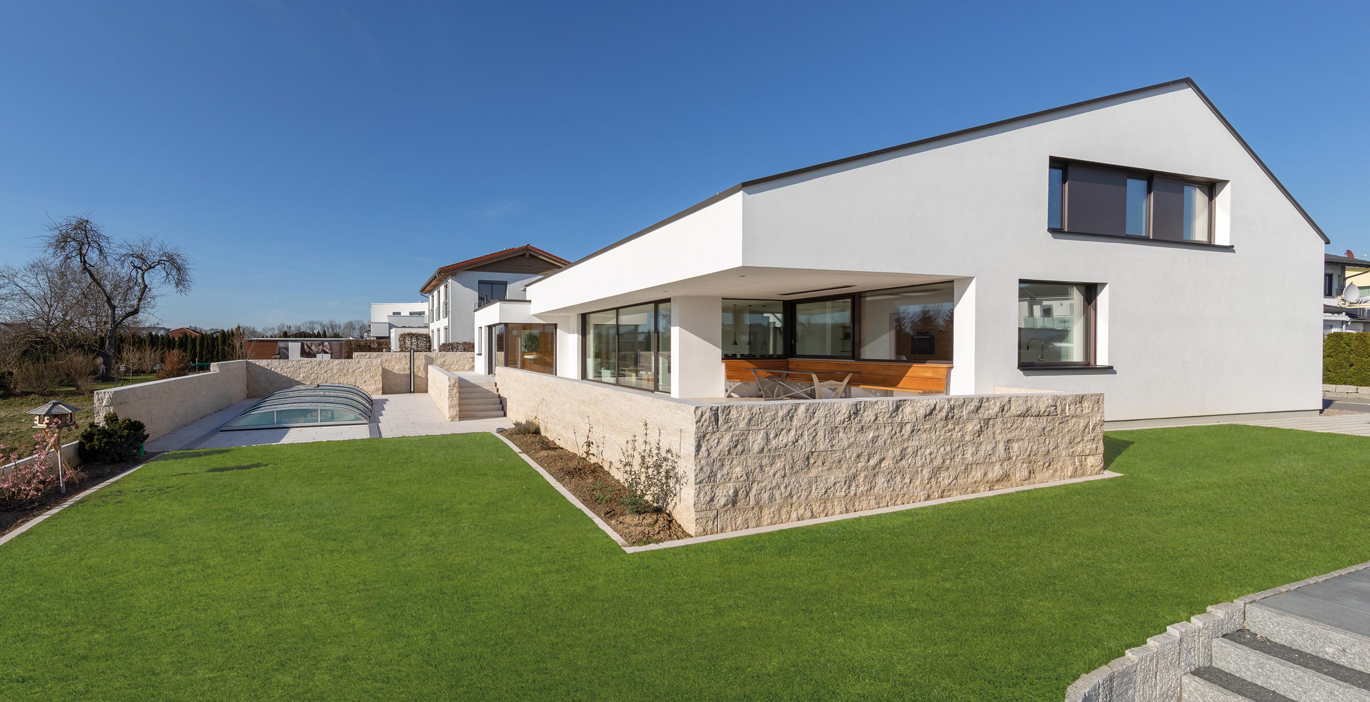 Zur Straße geschlossen, dafür weit aufgespannt zur Gartenseite, wo über zehn Meter Fensterfront raumhoch und ohne Zwischenstütze eine großzügige Verbindung zum Garten schaffen.
