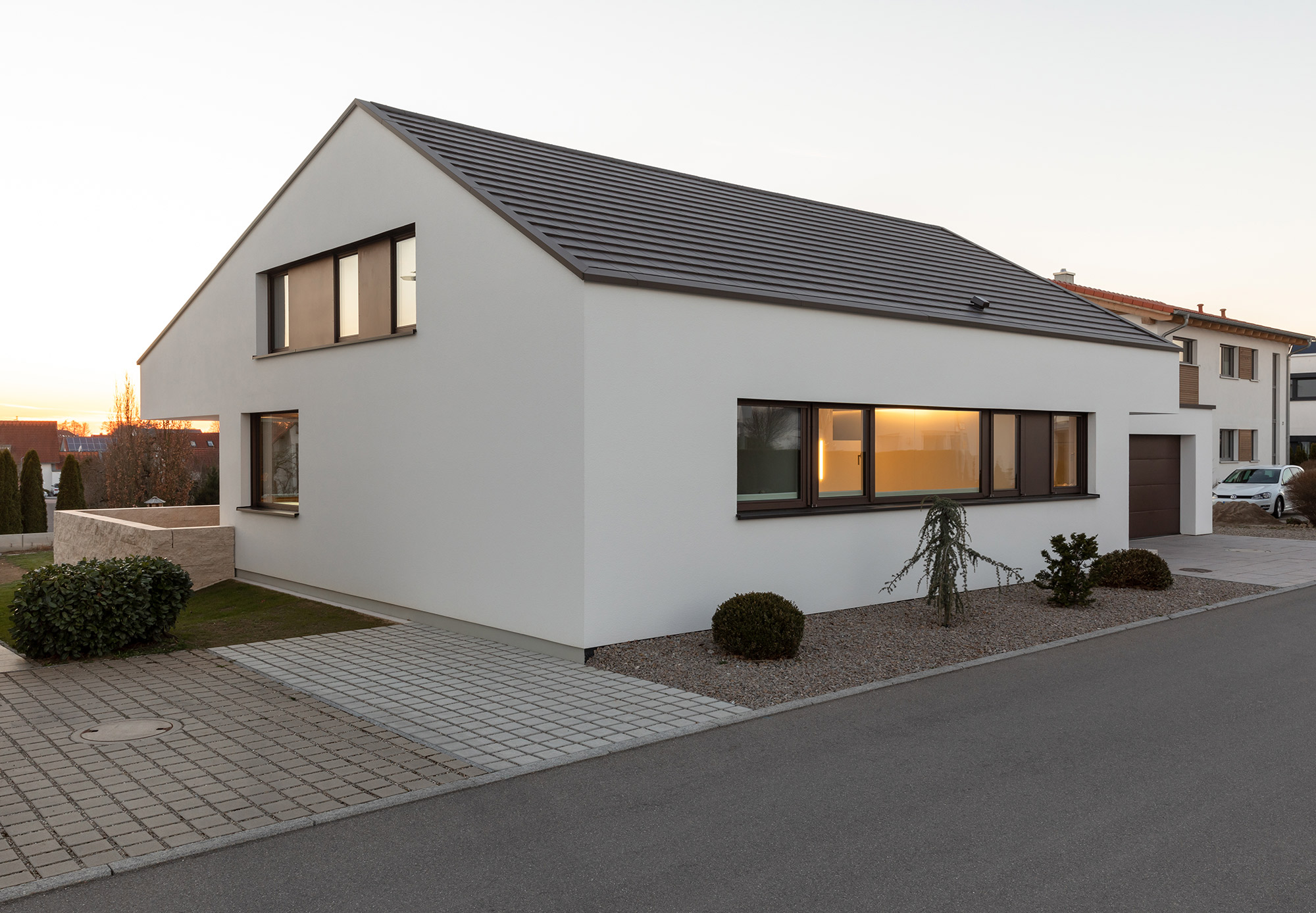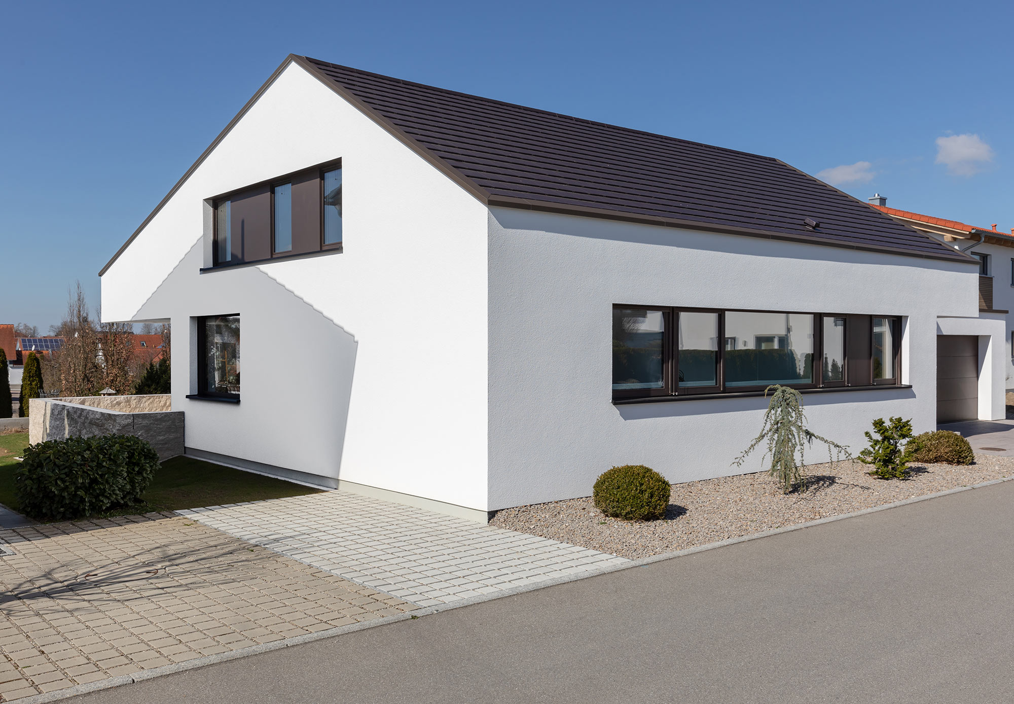Durch Vor- und Rücksprünge ergibt sich ein fortwährendes Spiel von Licht und Schatten. Sensible Bereich wie Wohn- und Esszimmer sind dabei soweit zurückgenommen, dass sie von der Straße aus kaum einsehbar sind.