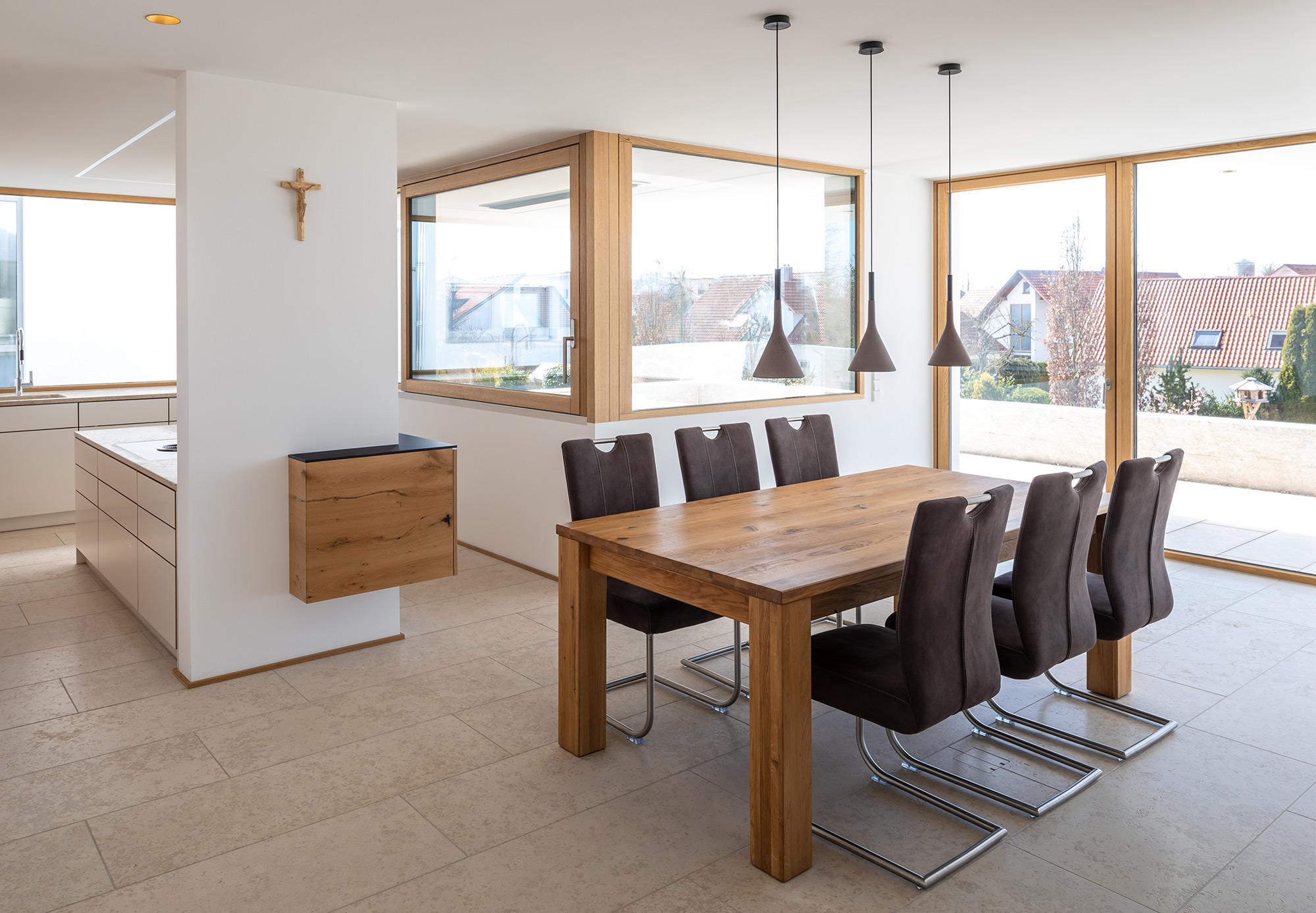 bietet darüber hinaus den dahinter liegenden Räumen aber Blickschutz von der Straße. Esszimmer und Wohnzimmer sind jeweils zweiseitig zur Mittags- und Abendsonne hin geöffnet.