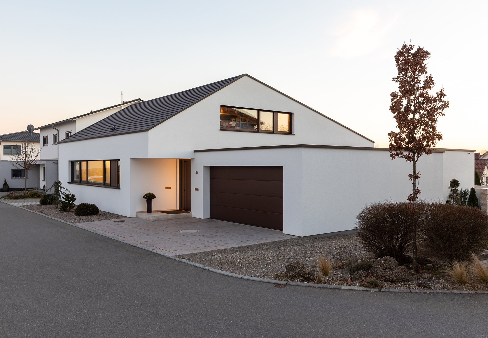 Der Entwurf folgt dem langgezogenen Bauplatz. Das Erdgeschoss ist dabei als dunkler Sockel ausgebildet, welcher in seiner Farbigkeit die Verbindung zum Grund sucht. Dabei nimmt er Bauelemente wie Garagentor, Fenster oder Briefeinwurf in sich auf, um Ordnung zu schaffen. Sofort erkennbar bleibt die Haustüre, die sich bewusst als Eingang in Eichenholz zeigt. Der obere Stock kragt in leichtem weiß über seinen dunklen Sockel.