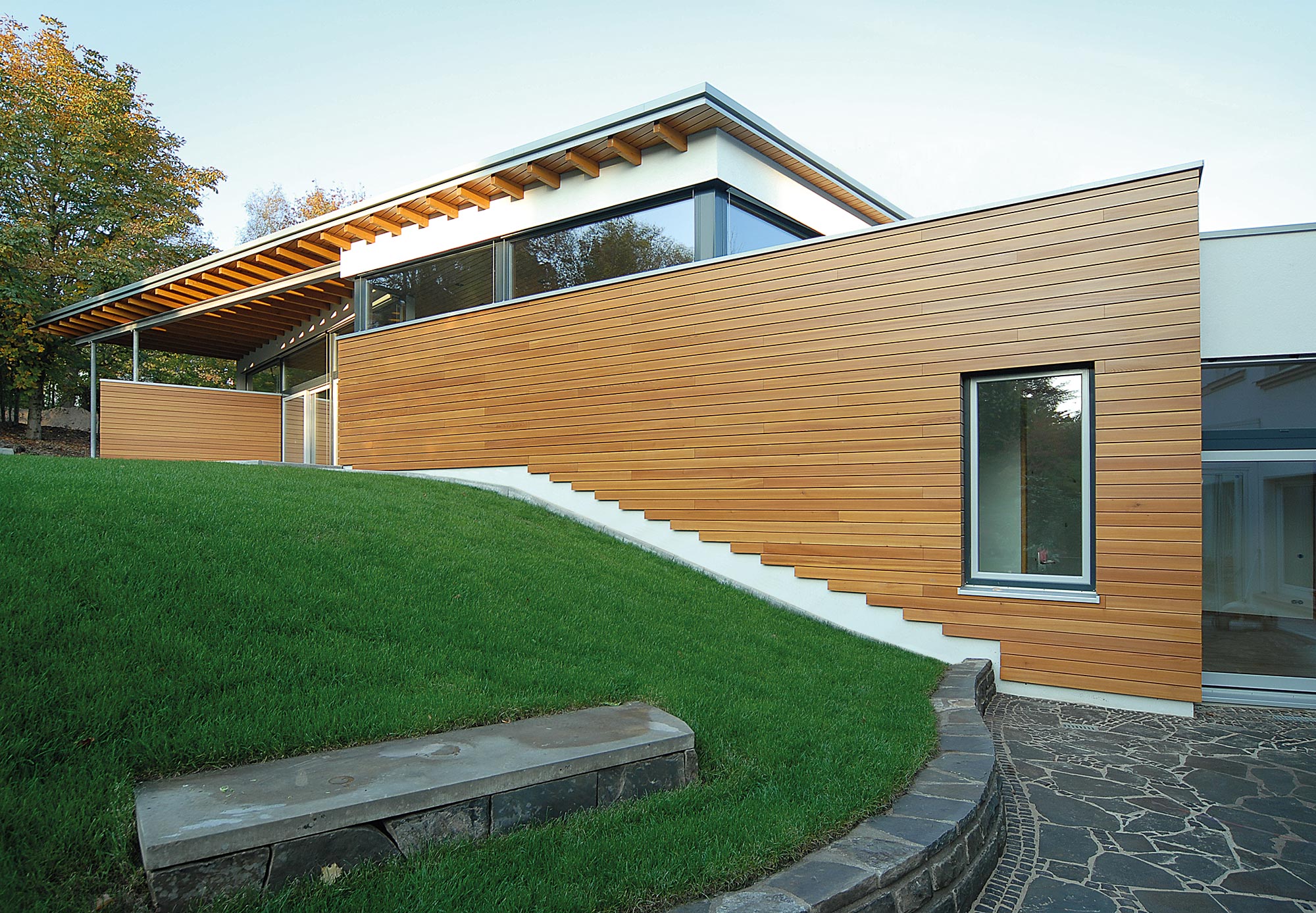 In die Hanglage eingebettet entwickelt sich das Bauwerk anhand des anspruchs- vollen Geländeverlaufs. Zur Straße nach Norden hin gibt sich der Baukörper verschlossen und erzeugt über Kubatur und Materialwahl eine Schichtung, die das Volumen in die Maßstäbe der Umgebung gliedern soll. Ein Fensterband über drei Stockwerke inszeniert im Innenraum den Sonnenuntergang. Auf Süd- und West- seite öffnen deckenhohe Glasflächen die Räume in den Außenraum. Als feine Details fallen neben den waagrechten Balkonlamellen und den filigranen Flachdächern die Ganzglasecken auf.