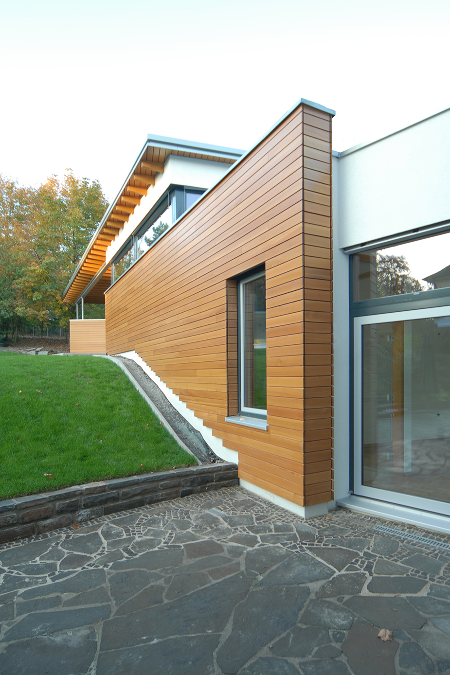 Das spitz zulaufende und leicht abfallende Grundstück war bestimmend für die Staffelung in zwei Baukörper und den Versatz der Beiden in Grundriss und Höhe.