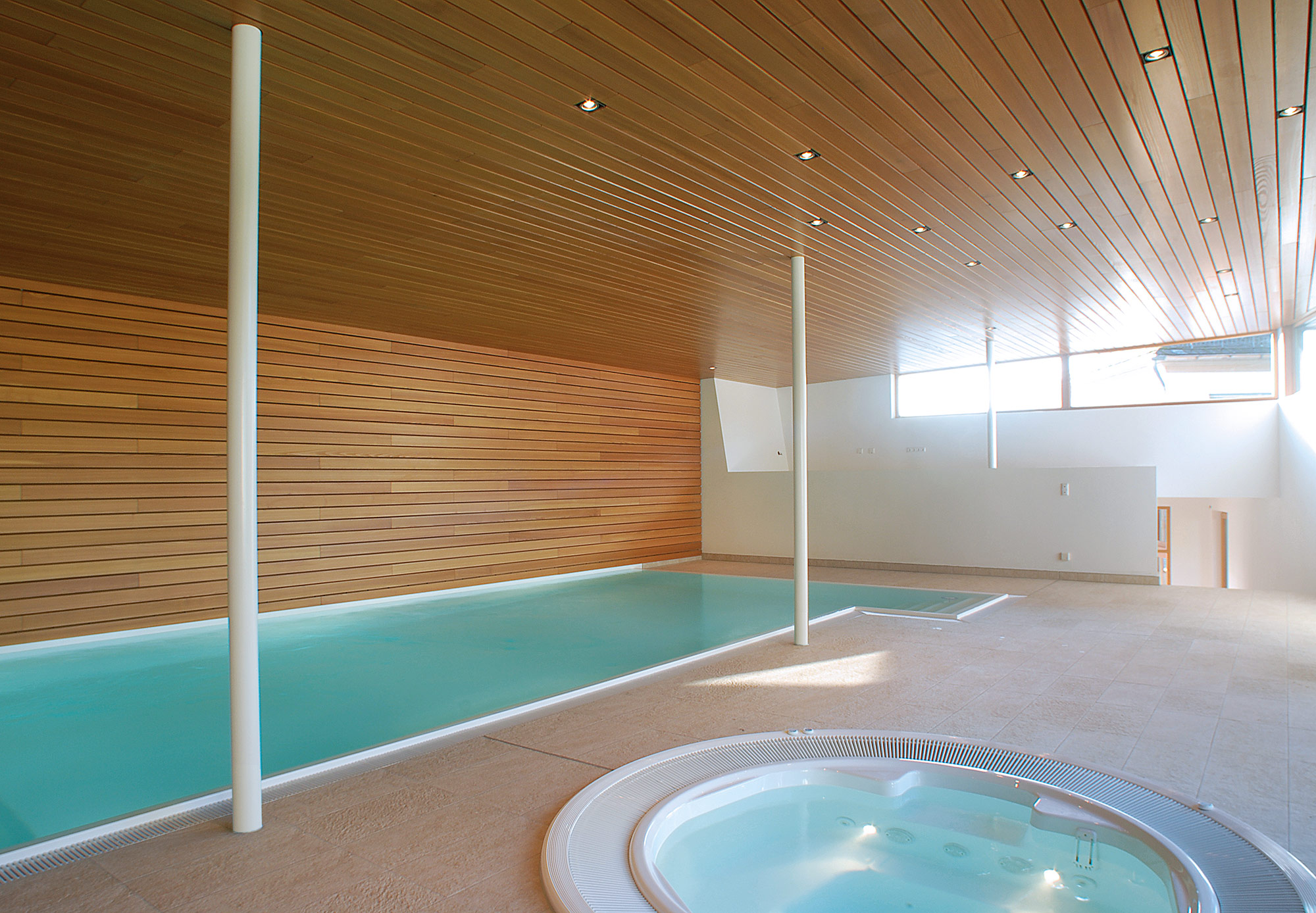 Das großzügige Becken erlaubt sowohl Bahnanschwimmen als auch den Betrieb der Gegenstromanlage. Entspannte Stunden gewährt auch der großzügige Whirlpool, vor allem am späten Abend.