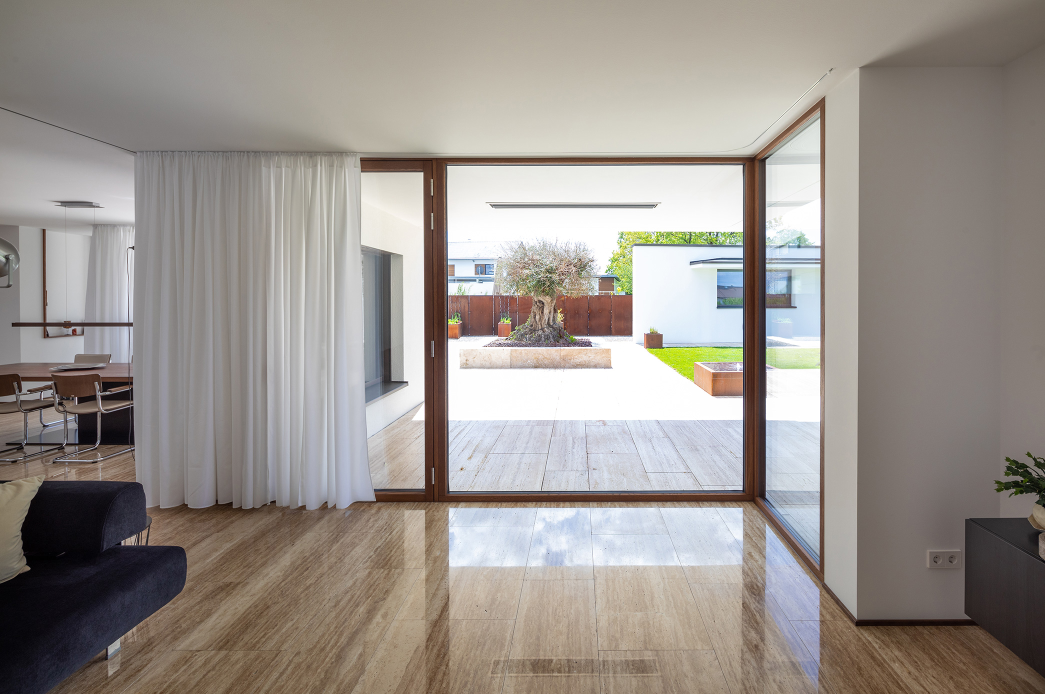Durch geschickt gesetzte Vor- und Rücksprünge im Erdgeschoss ergeben sich schöne Gliederungen im Außenraum und vielfältige Ausblicke im Innenraum.