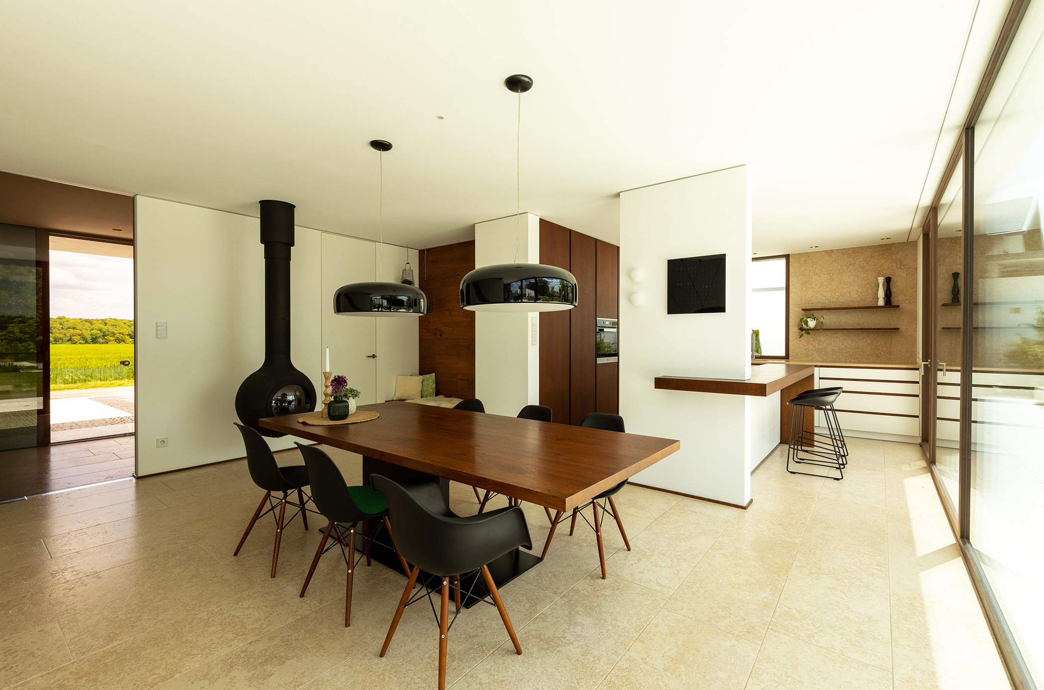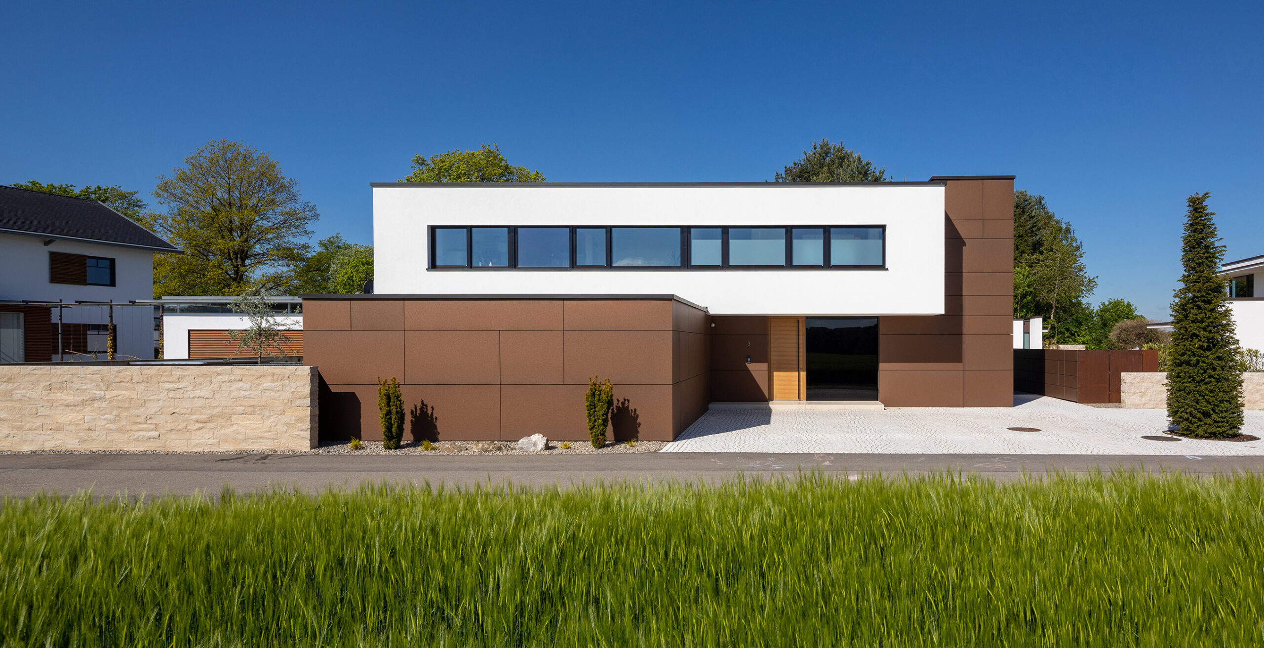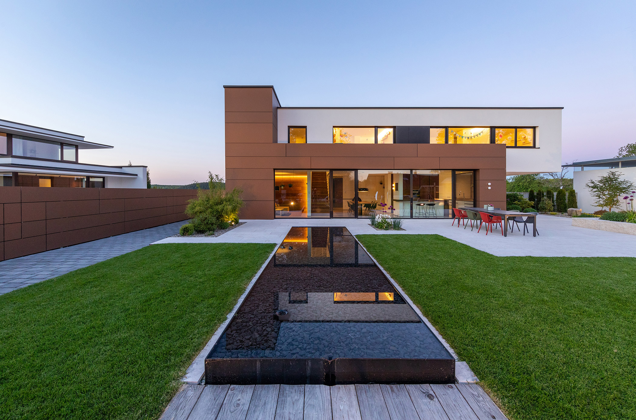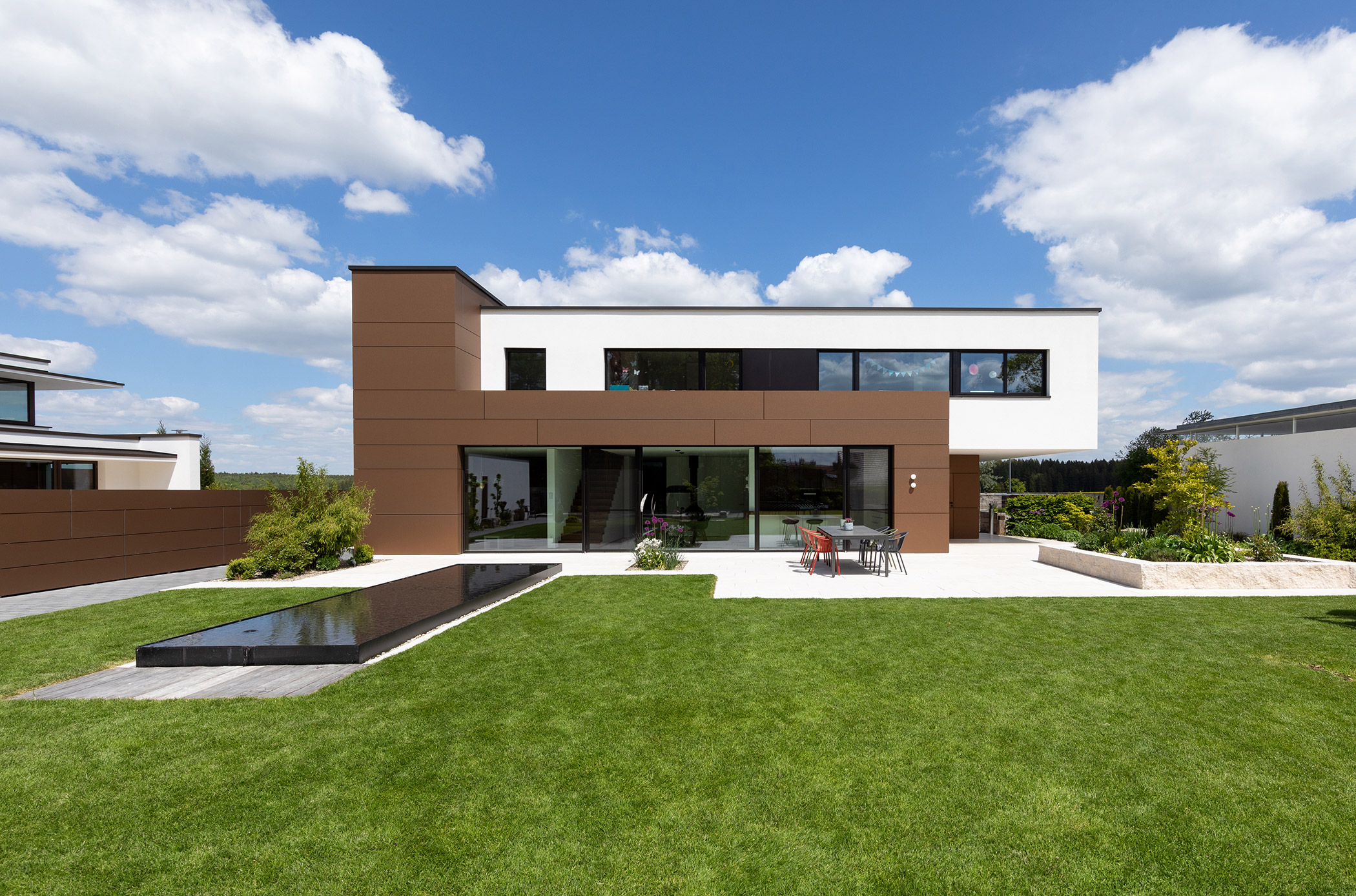 Zur Straße geschlossen, dafür weit aufgespannt zur Gartenseite, wo über zehn Meter Fensterfront raumhoch und ohne Zwischenstütze eine großzügige Verbindung zum Garten schaffen.