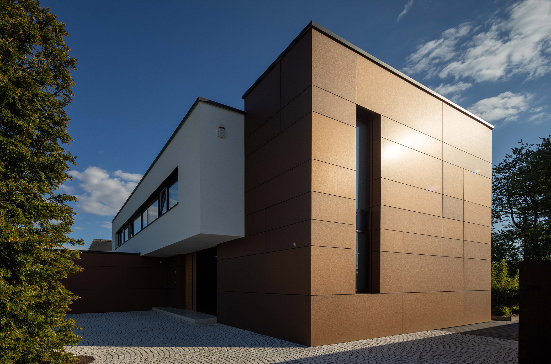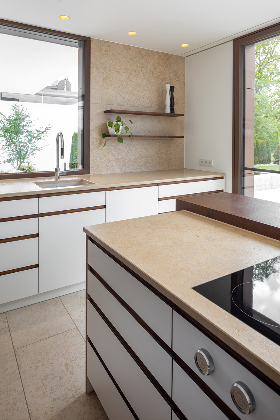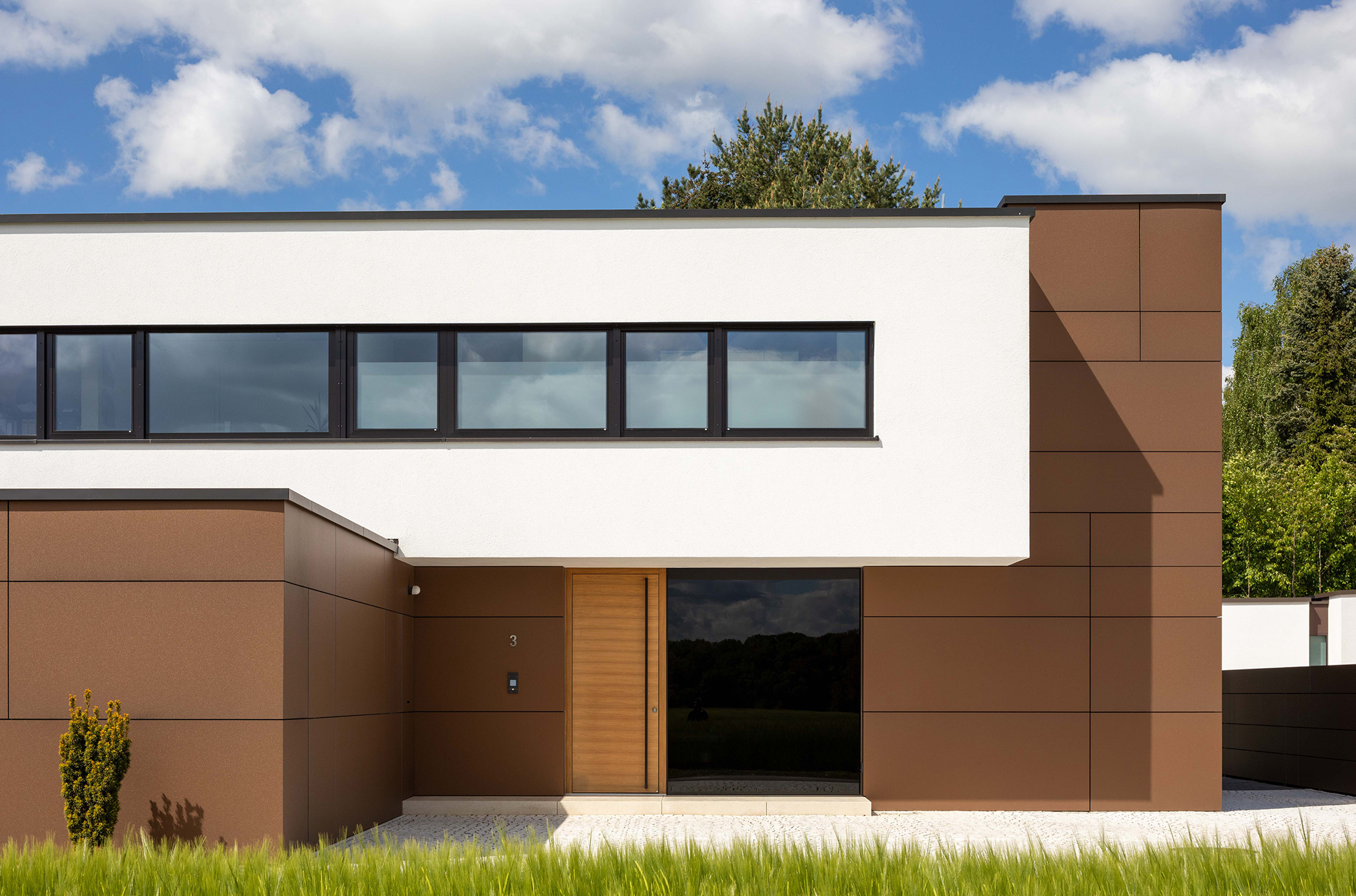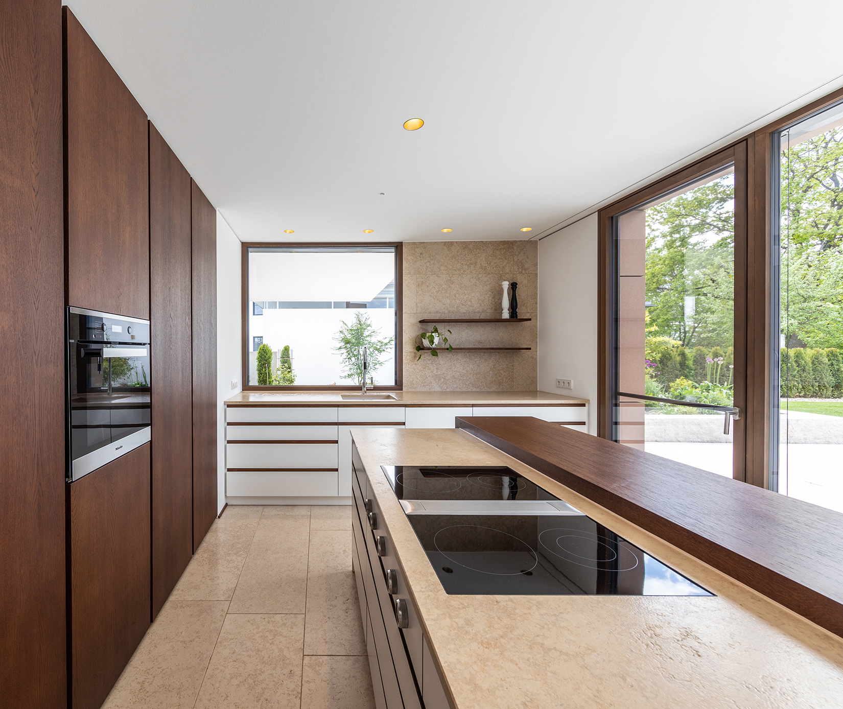 Zur Straße geschlossen, dafür weit aufgespannt zur Gartenseite, wo über zehn Meter Fensterfront raumhoch und ohne Zwischenstütze eine großzügige Verbindung zum Garten schaffen.