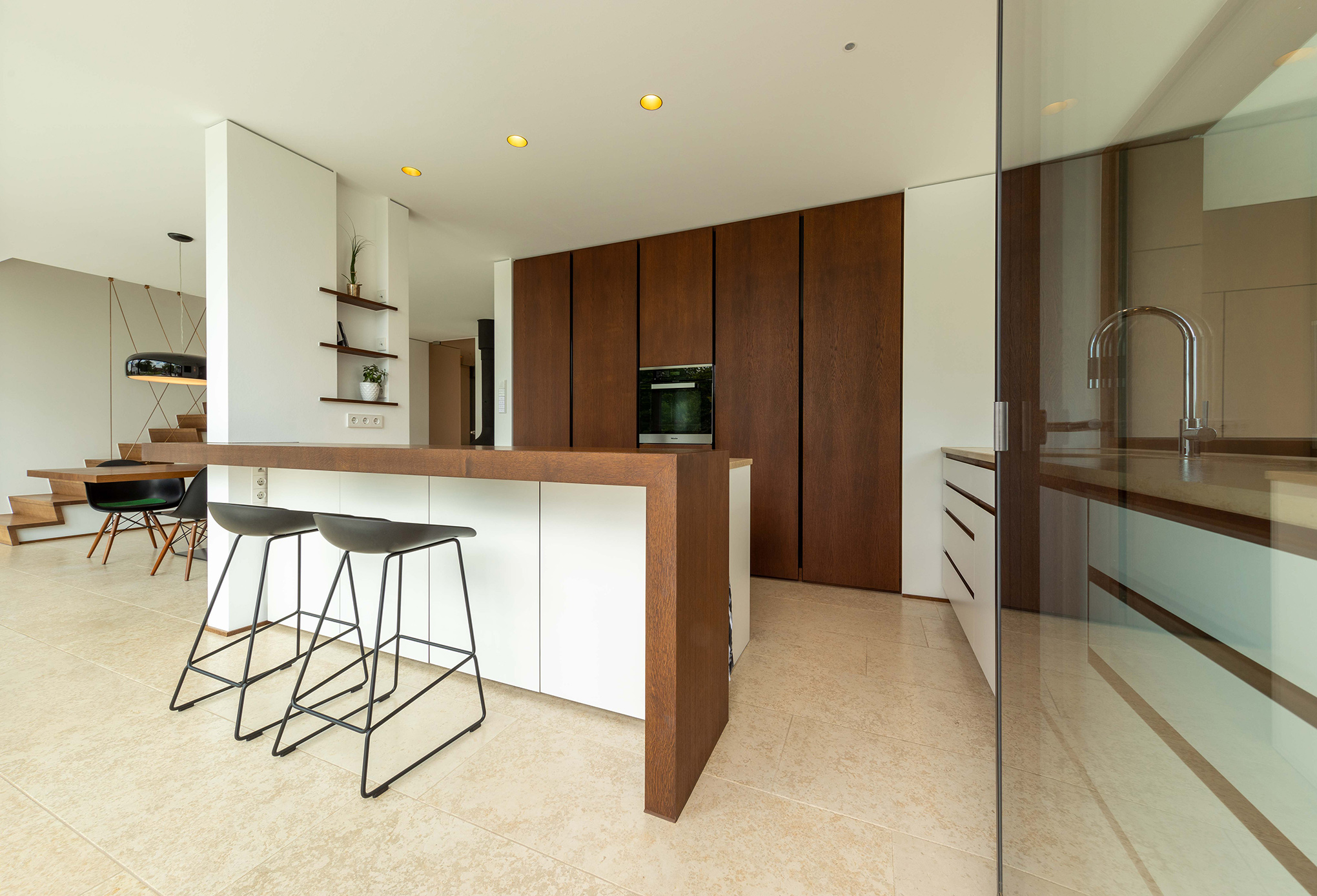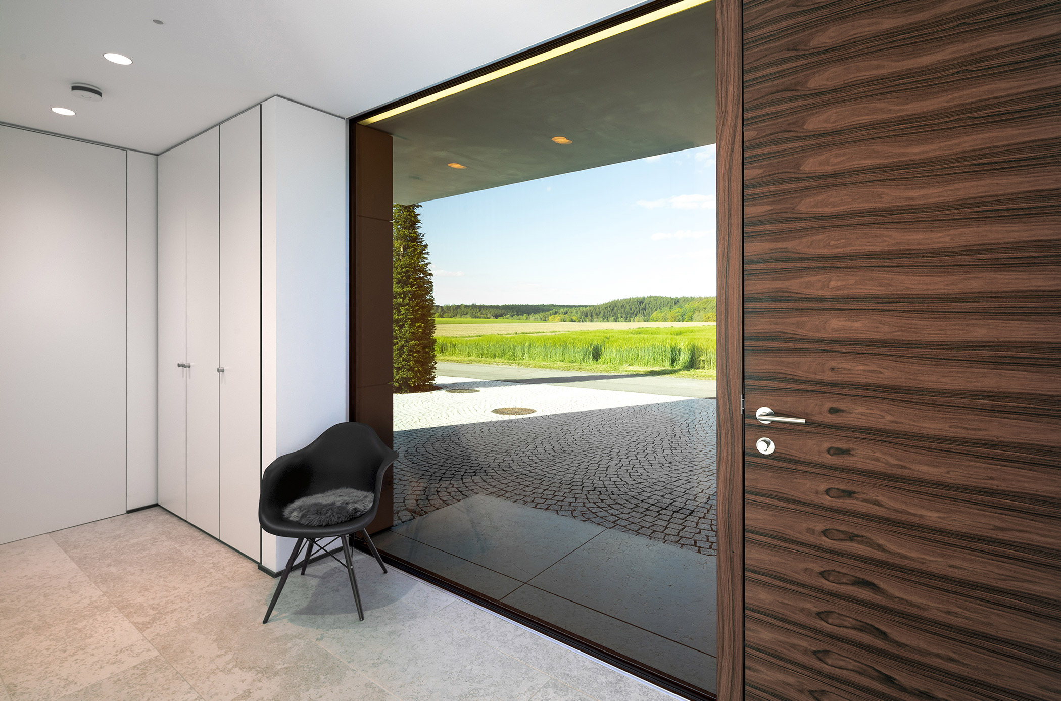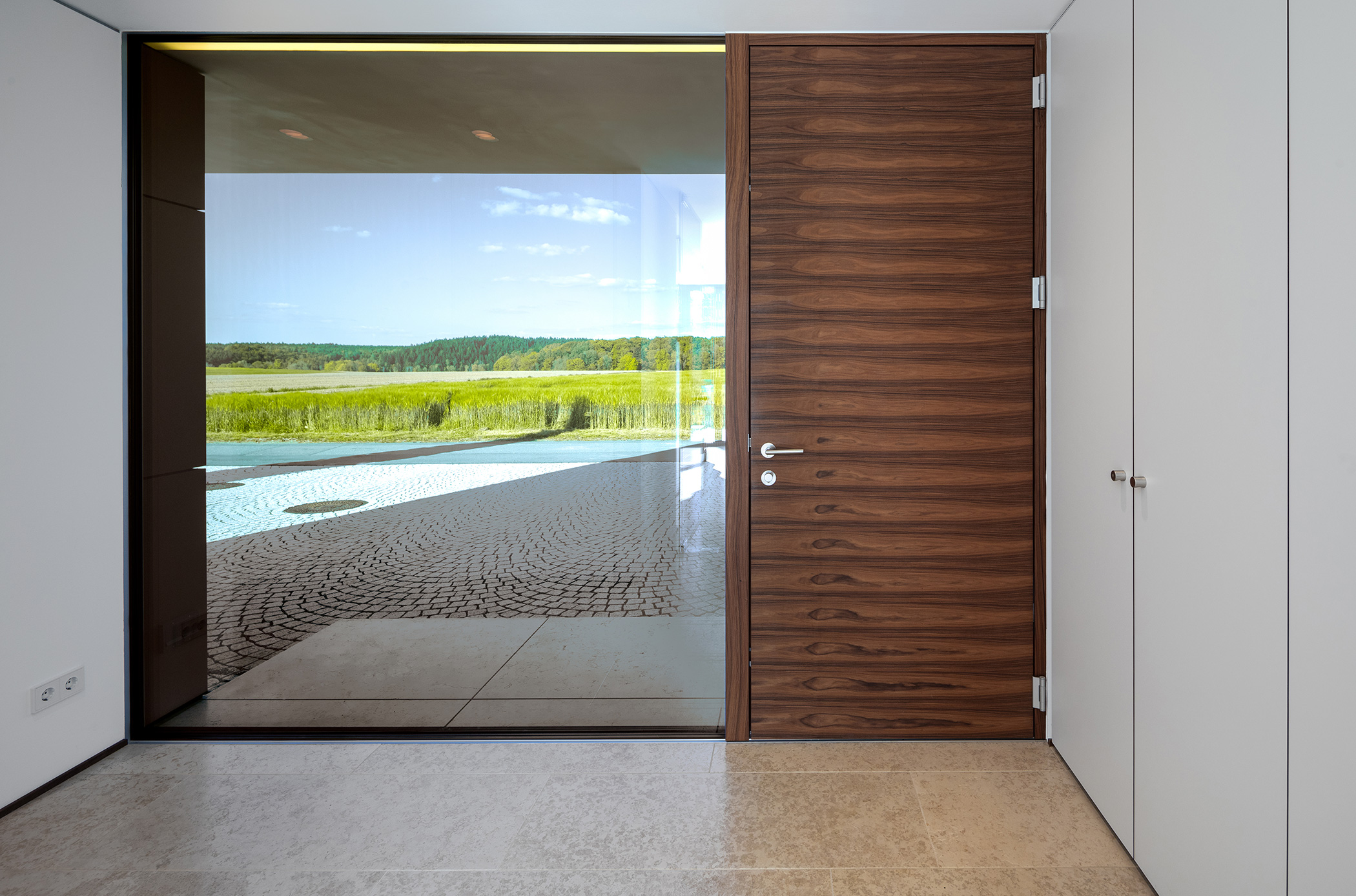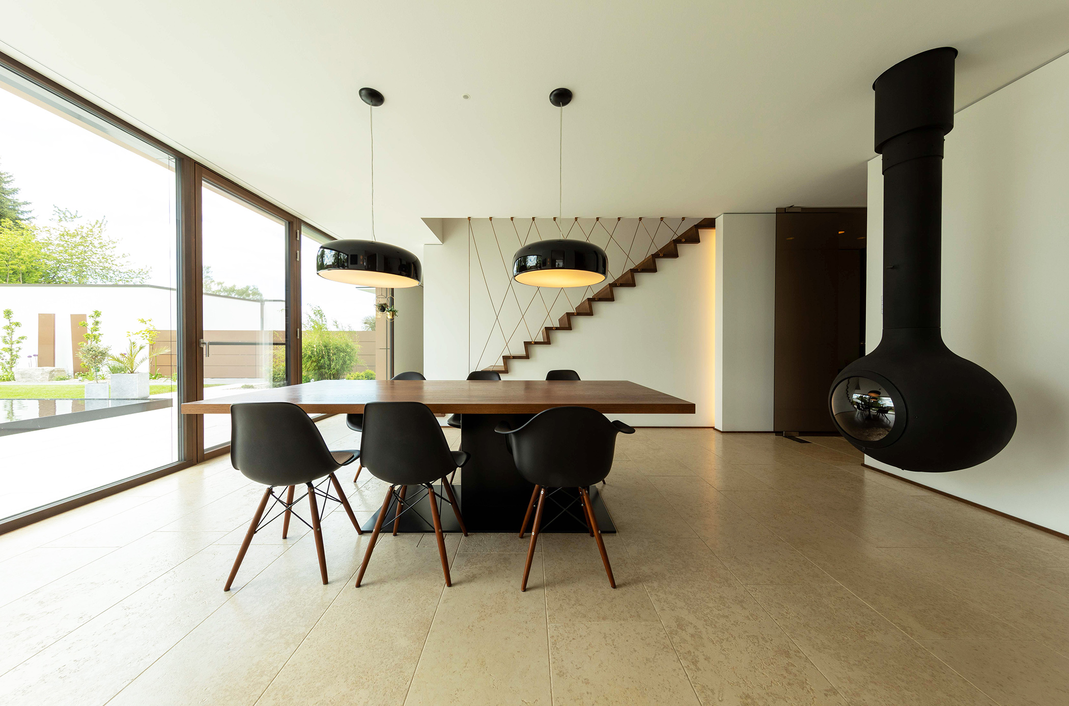 Zur Straße geschlossen, dafür weit aufgespannt zur Gartenseite, wo über zehn Meter Fensterfront raumhoch und ohne Zwischenstütze eine großzügige Verbindung zum Garten schaffen.